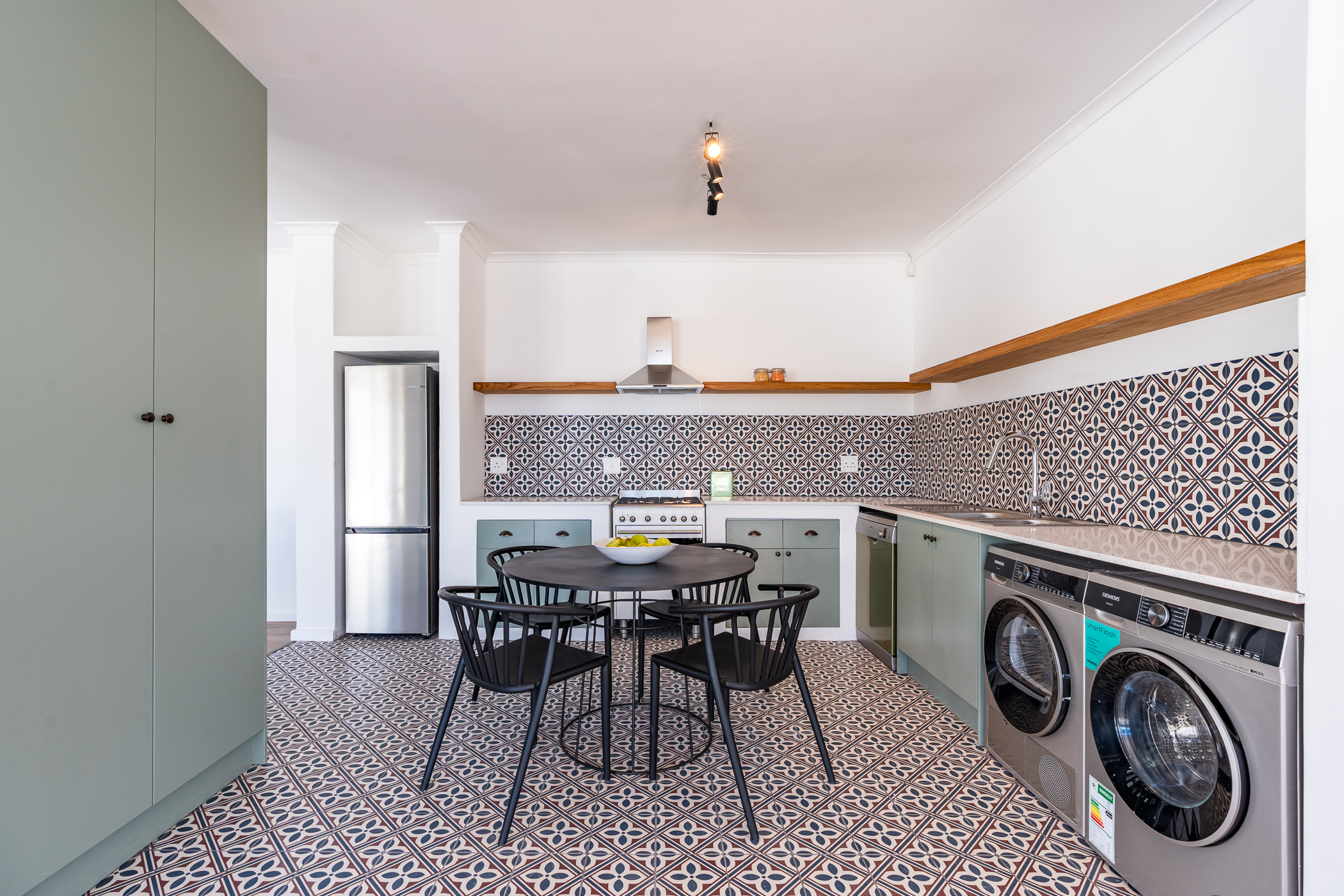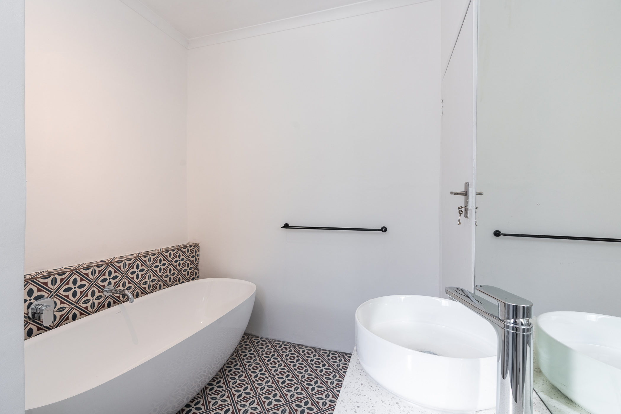 The Spanish-inspired kitchen offers plenty of work and packing space, a SMEG gas/electric oven, extractor, space for 3 washing appliances, and double sink. High ceilings accentuate the feeling of openness. Accommodation comprises of 3 bedrooms and 2 and a half bathrooms. Both bathrooms offer both shower and separate tub, while the main ensuite has a double vanity and enormous walk-in shower. There are aluminium windows and doors throughout, and track lights. The single garage is automated, and a further 3 cars can park on the driveway. A sheltered, lawned garden wraps around the back of the house, and a storeroom offers extra space for garden items/a workshop.
