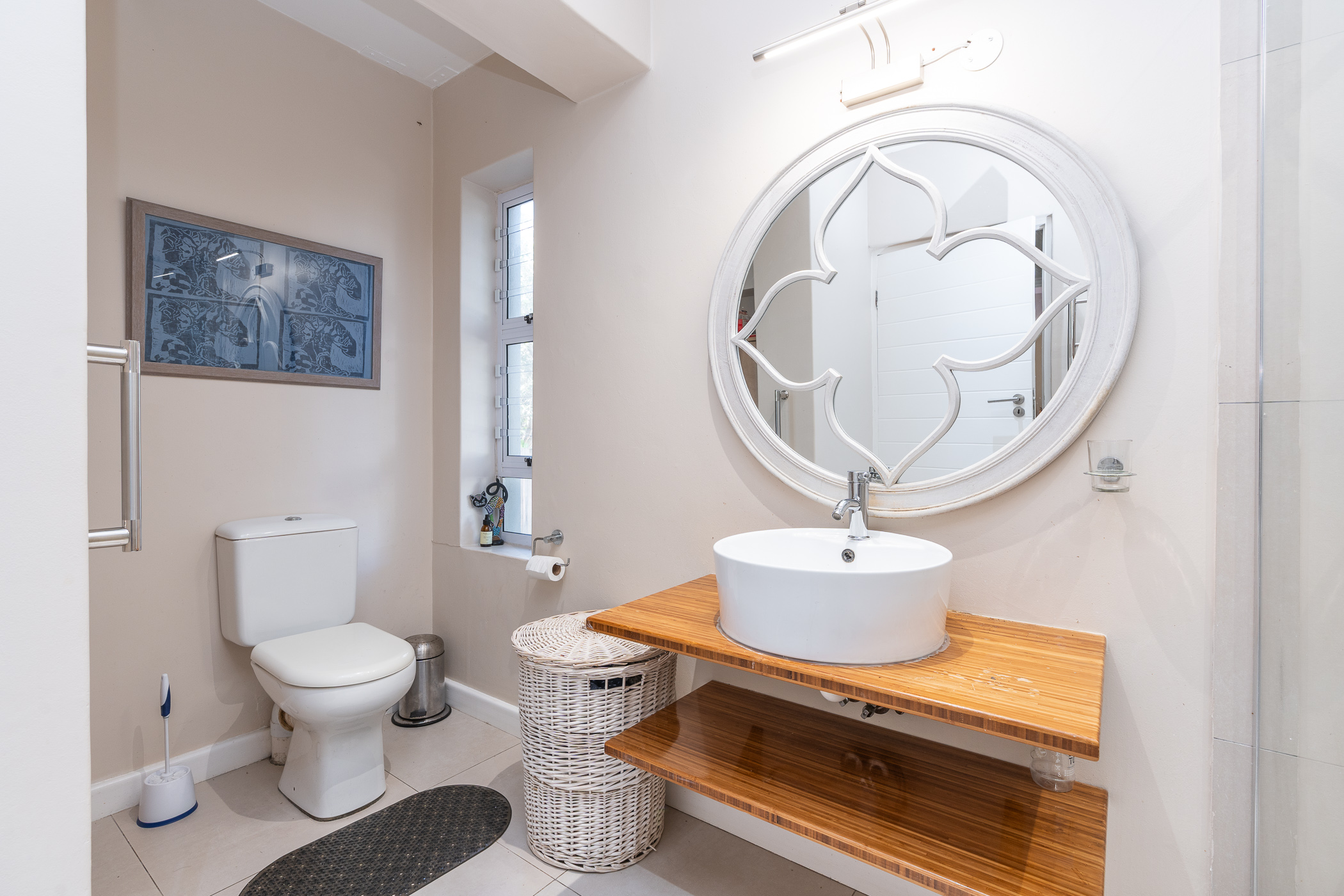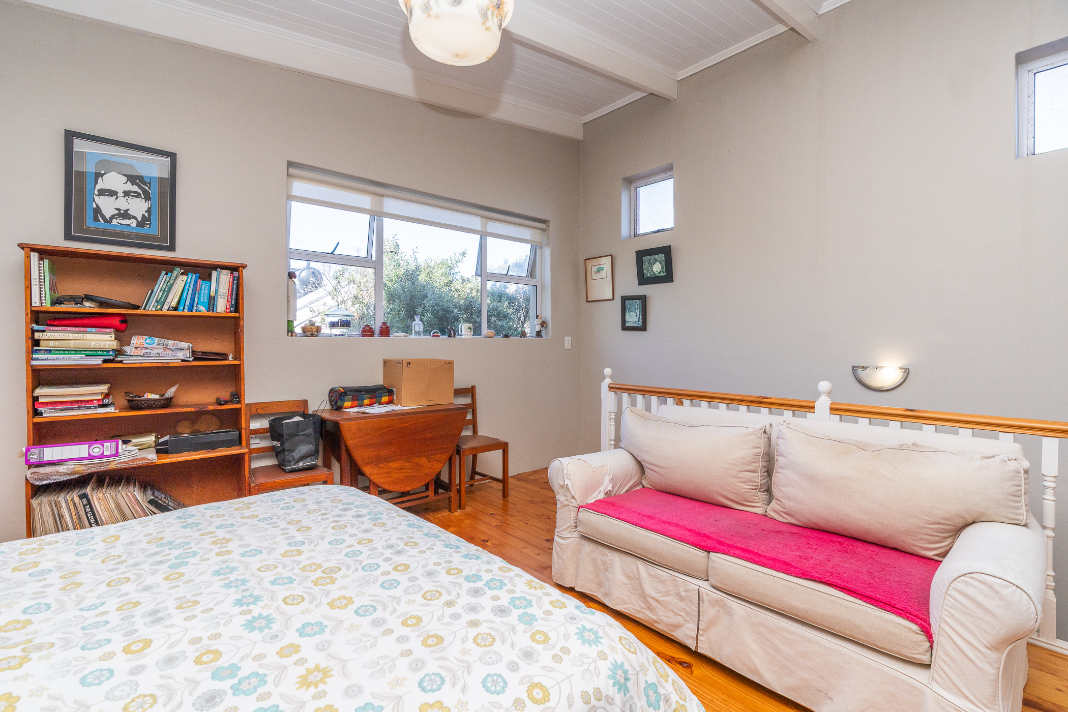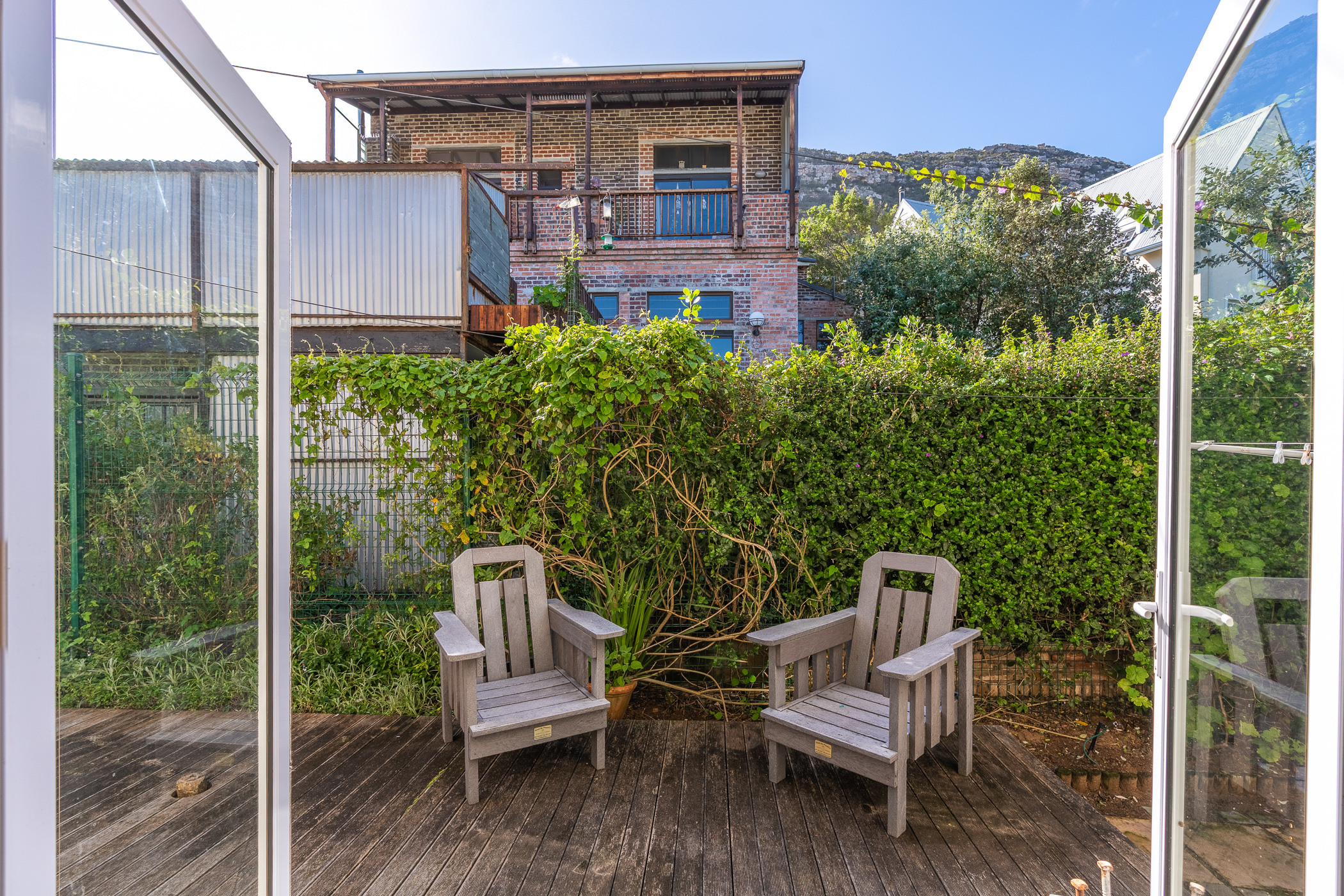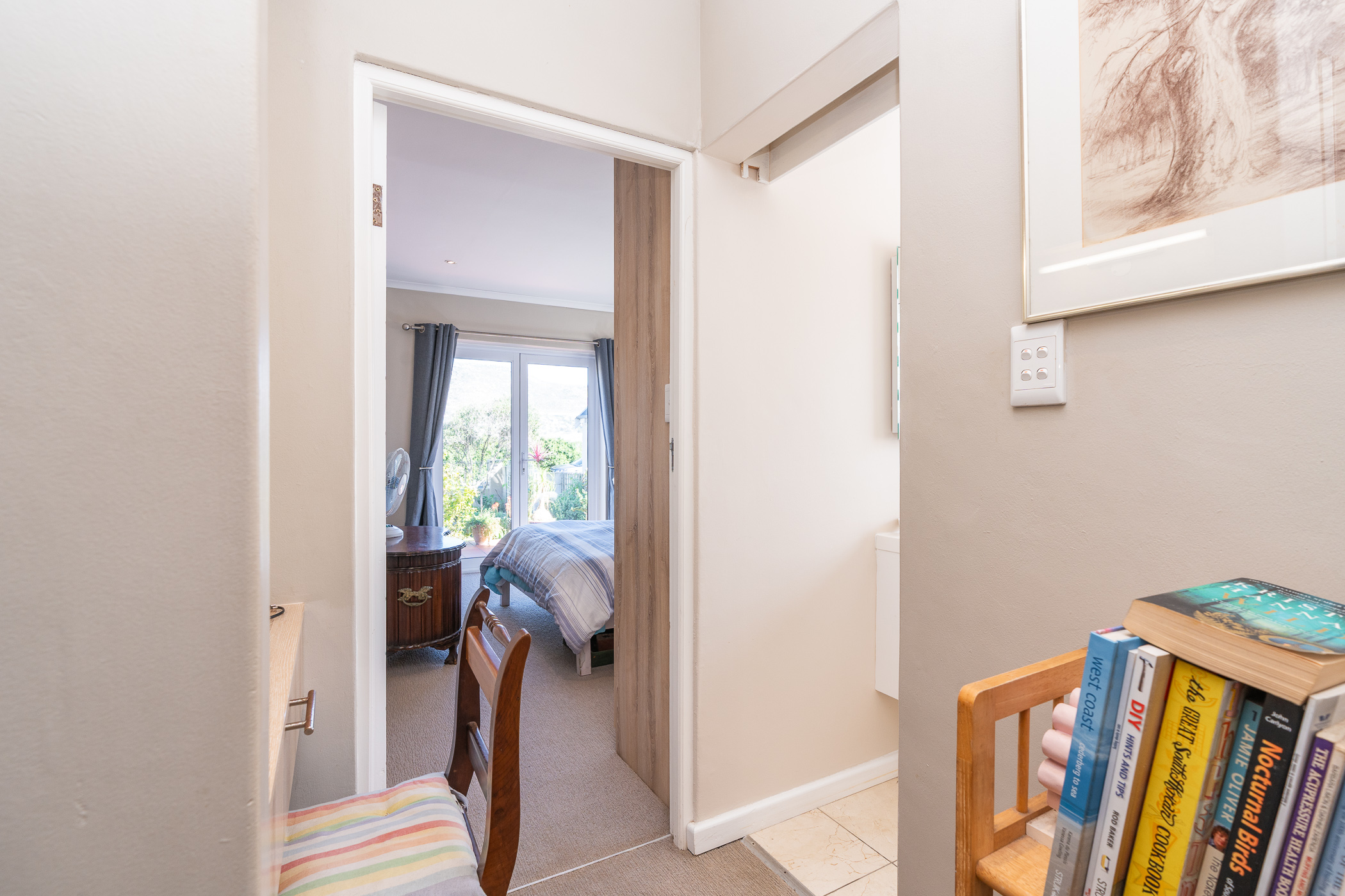 Both bedrooms are ensuite and are located on the ground floor, either side of the braai room – perfect for offering guests privacy. The main bedroom is particularly spacious and includes a full wall of built-in cupboards. Both bedrooms have French doors to the front patio/garden. A mezzanine level above the kitchen serves as a guest room/study. The home has aluminium windows and doors all round, and a solar geyser is fitted enabling huge power savings. A truly, move-in-ready, low maintenance home in one of Cape Town’s most desirable secret suburbs.