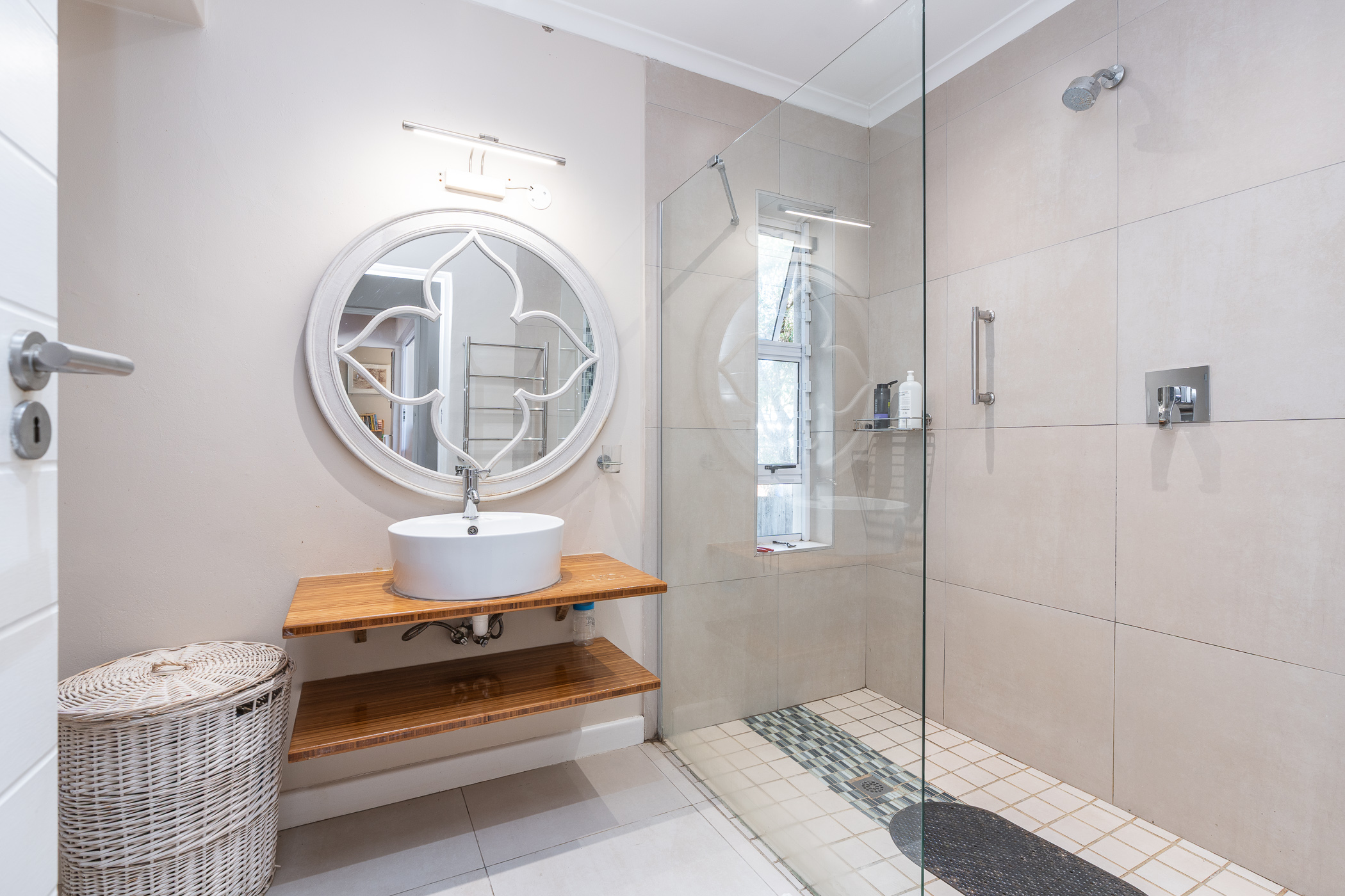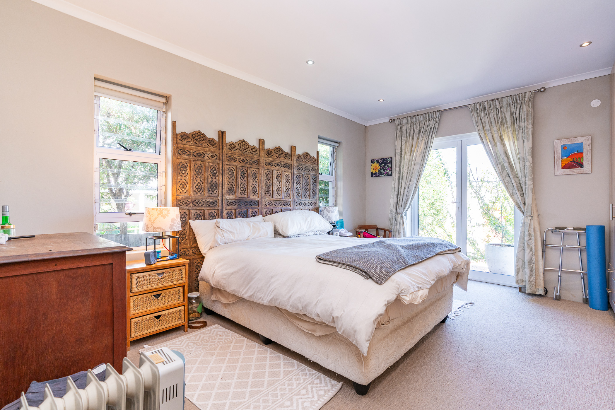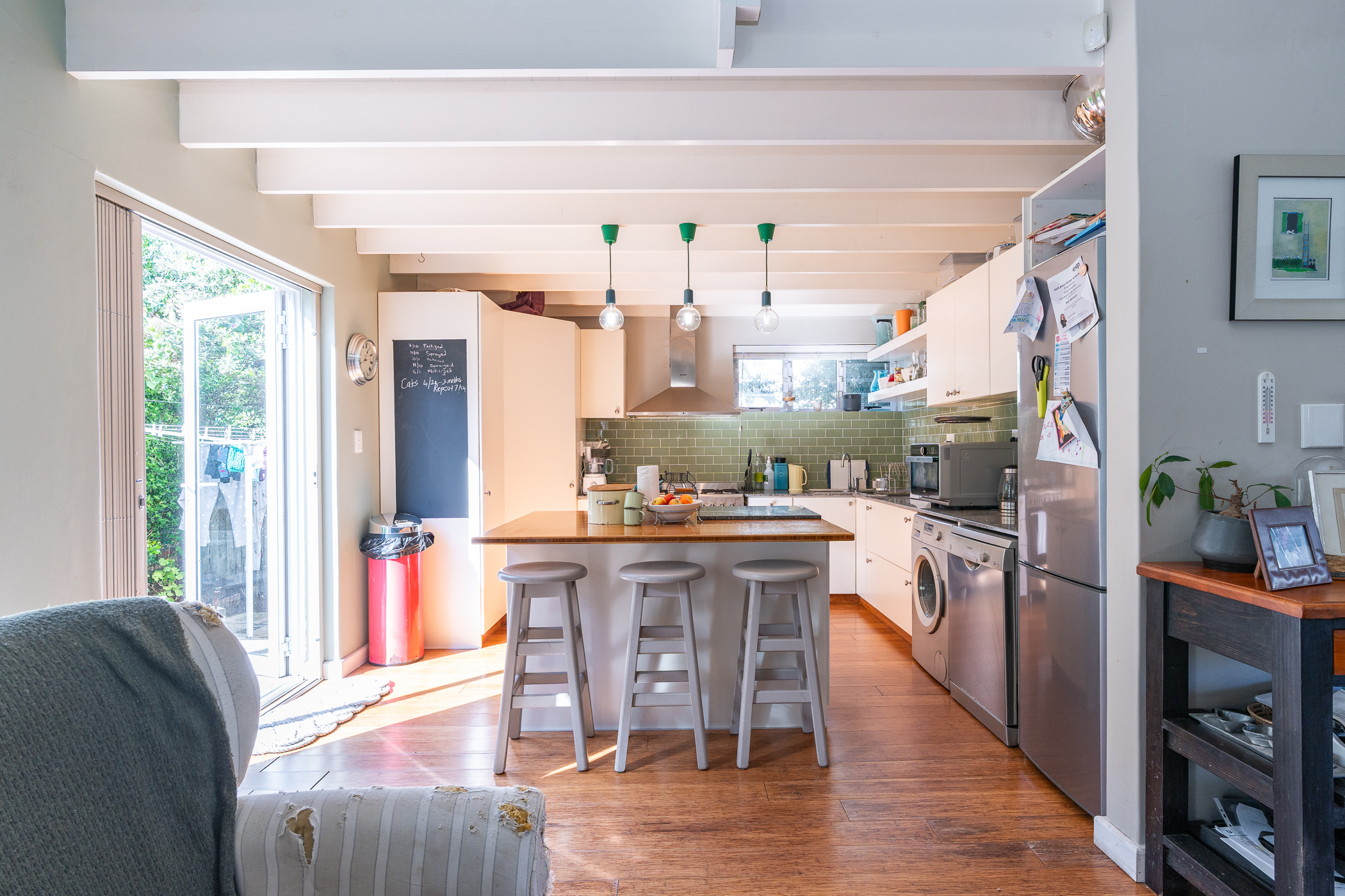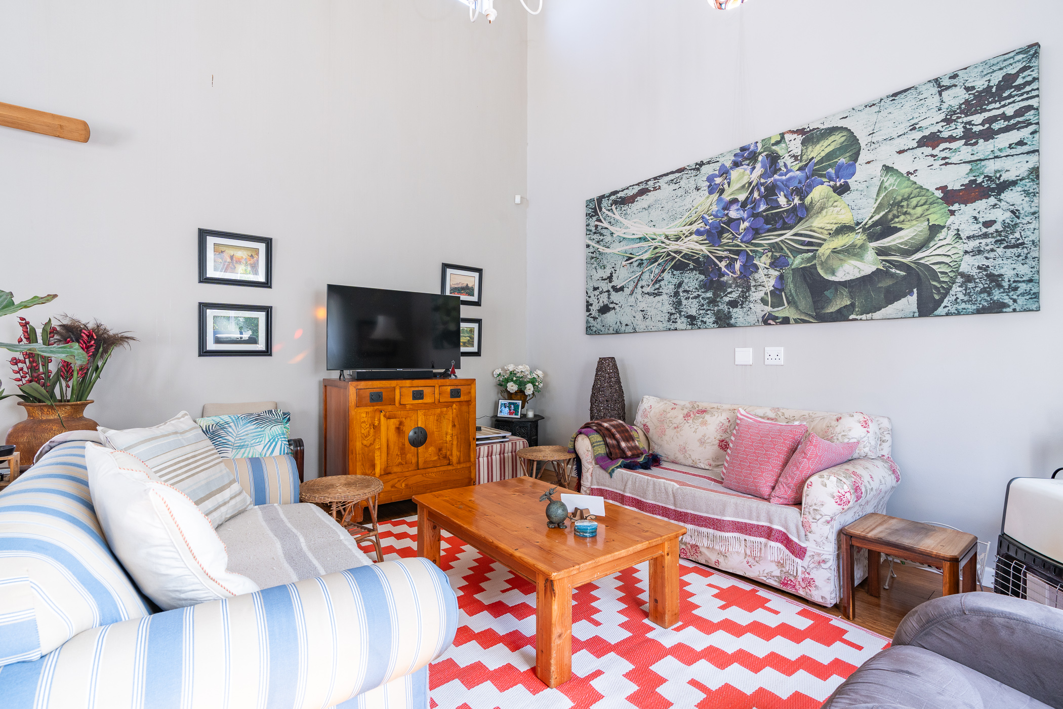 Both bedrooms are ensuite and are located on the ground floor, either side of the braai room – perfect for offering guests privacy. The main bedroom is particularly spacious and includes a full wall of built-in cupboards. Both bedrooms have French doors to the front patio/garden. A mezzanine level above the kitchen serves as a guest room/study. The home has aluminium windows and doors all round, and a solar geyser is fitted enabling huge power savings. A truly, move-in-ready, low maintenance home in one of Cape Town’s most desirable secret suburbs.
