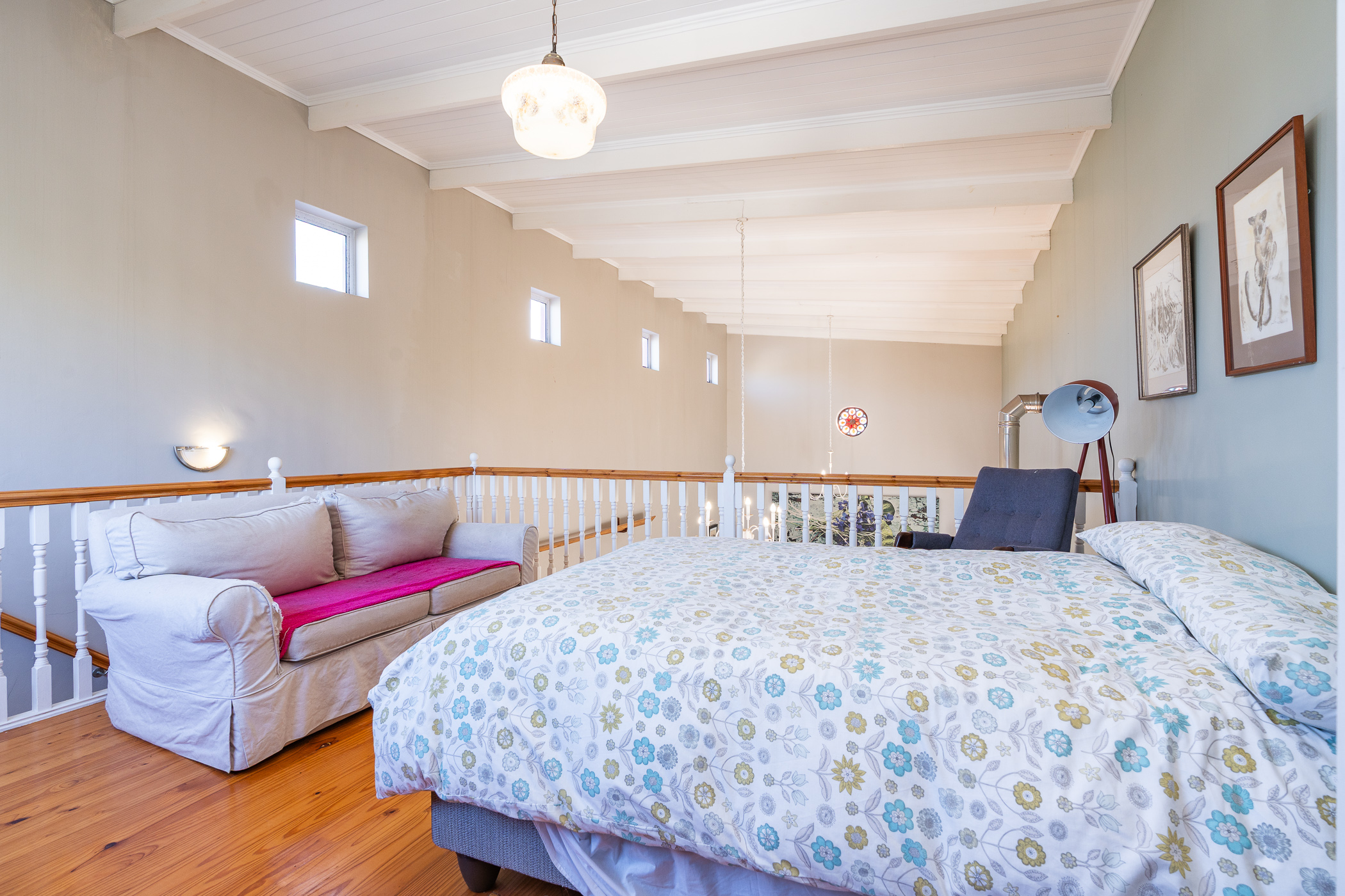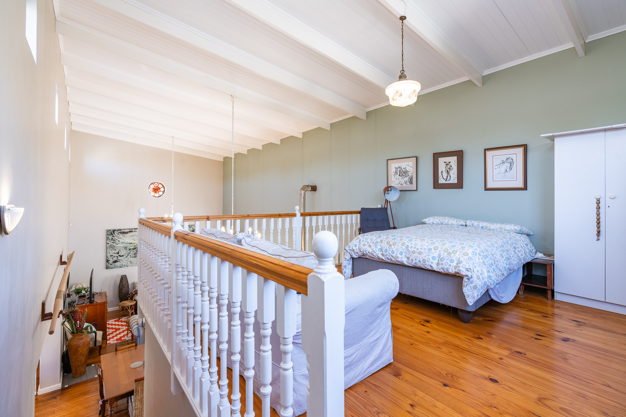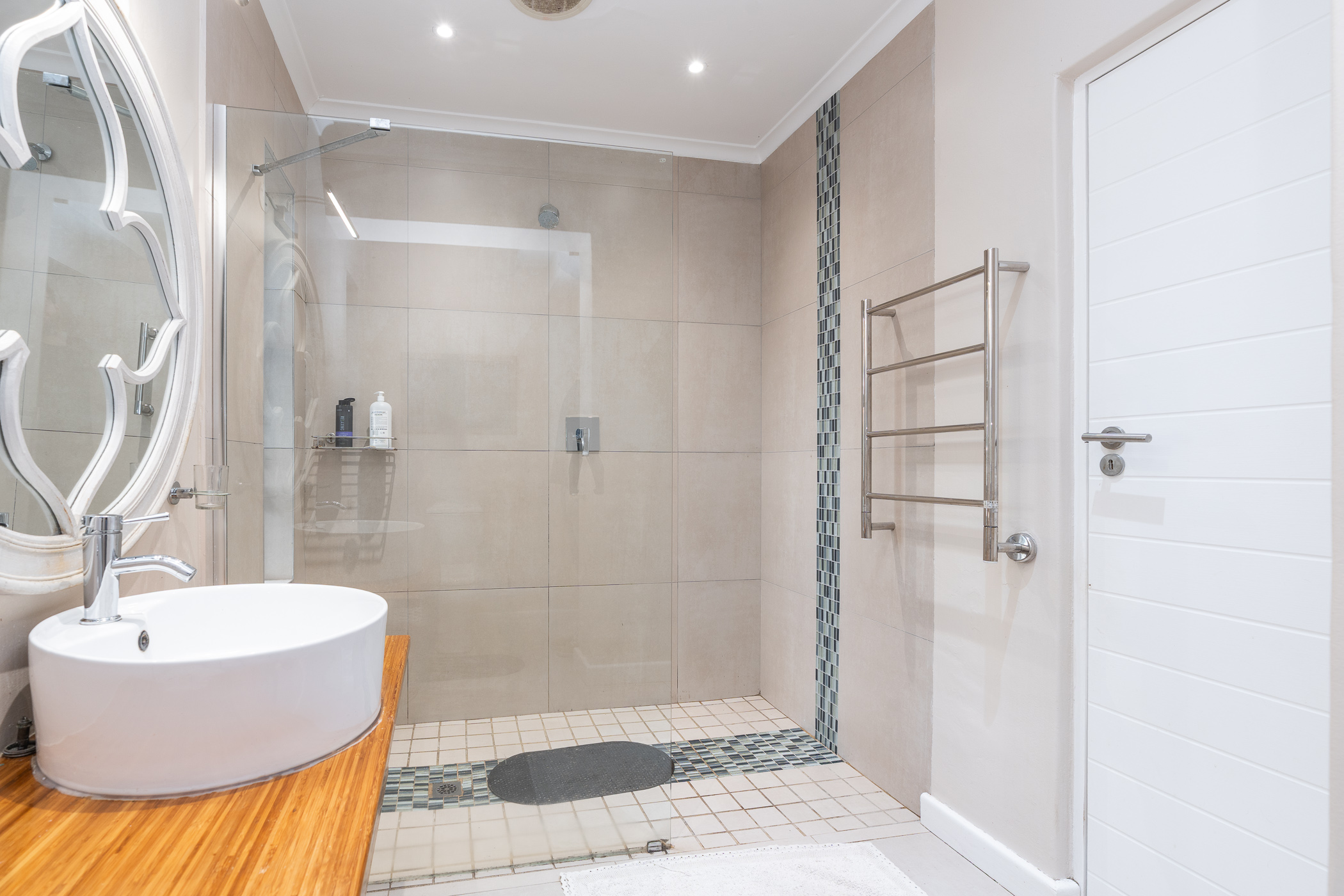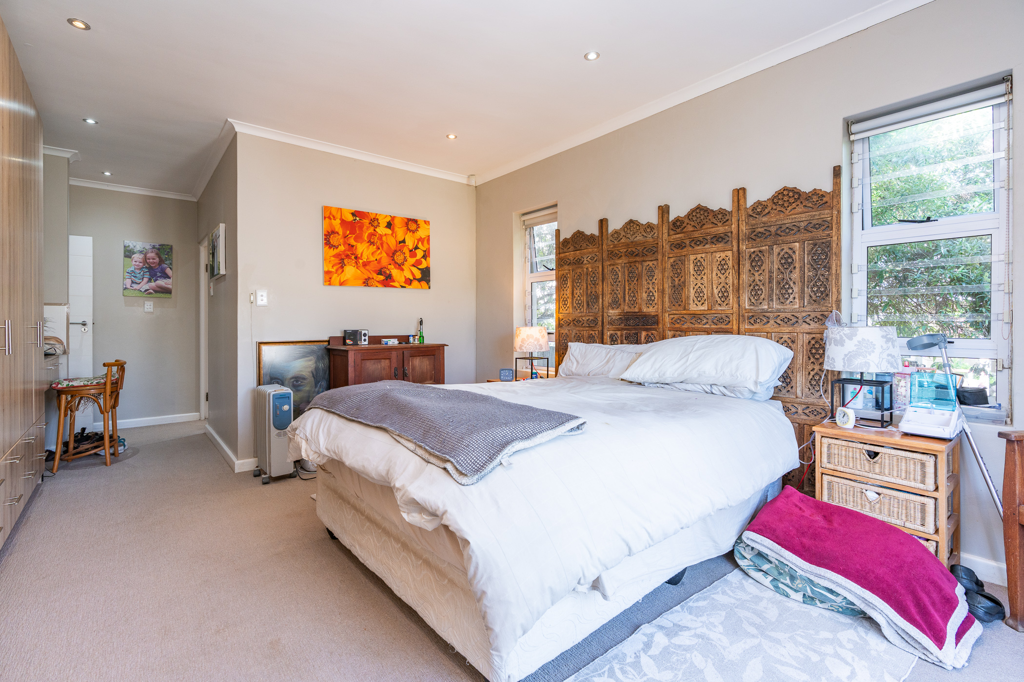 Both bedrooms are ensuite and are located on the ground floor, either side of the braai room – perfect for offering guests privacy. The main bedroom is particularly spacious and includes a full wall of built-in cupboards. Both bedrooms have French doors to the front patio/garden. A mezzanine level above the kitchen serves as a guest room/study. The home has aluminium windows and doors all round, and a solar geyser is fitted enabling huge power savings. A truly, move-in-ready, low maintenance home in one of Cape Town’s most desirable secret suburbs.