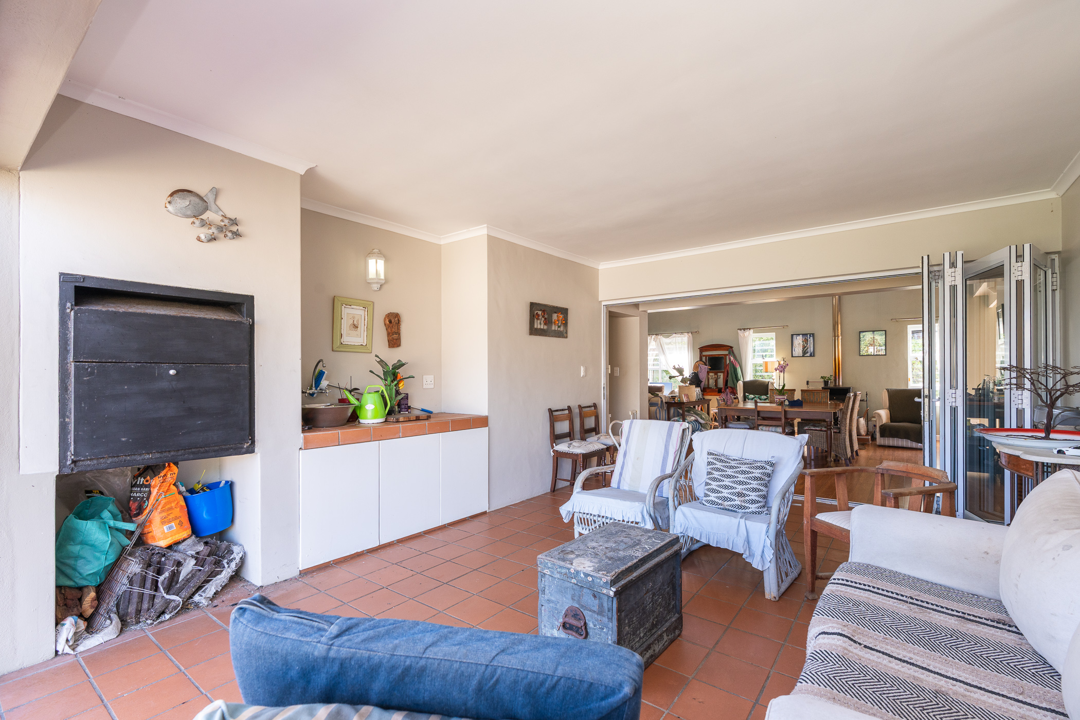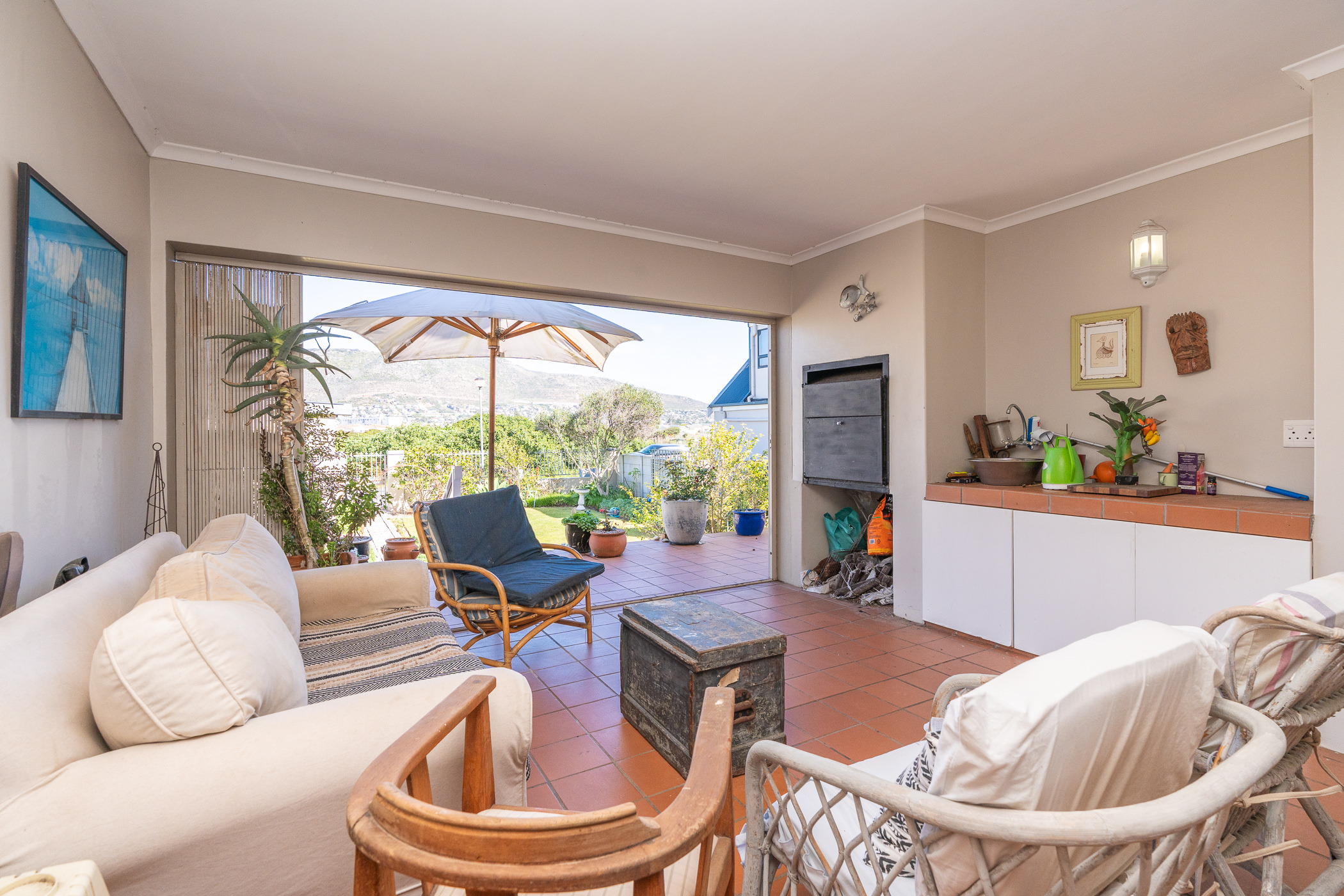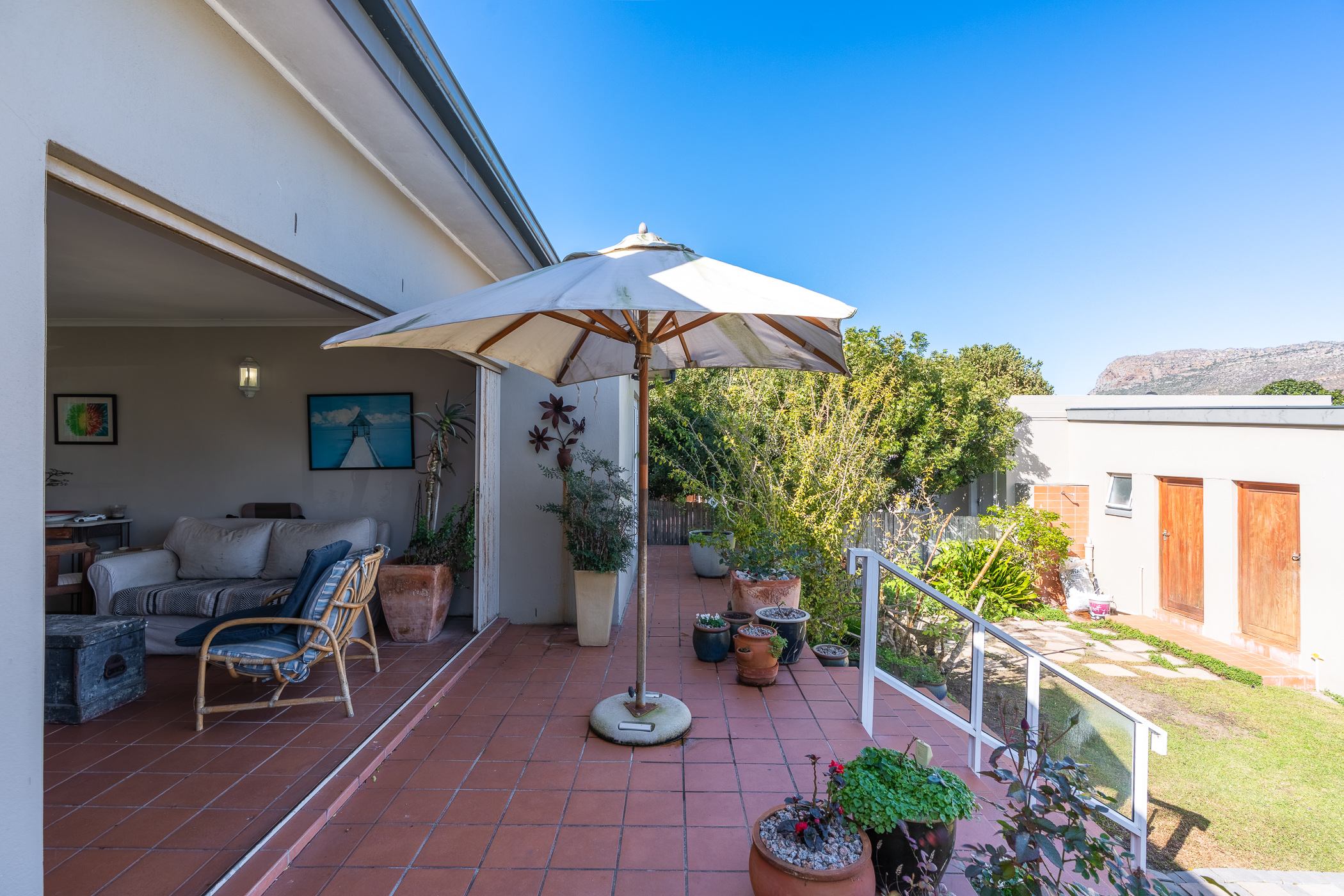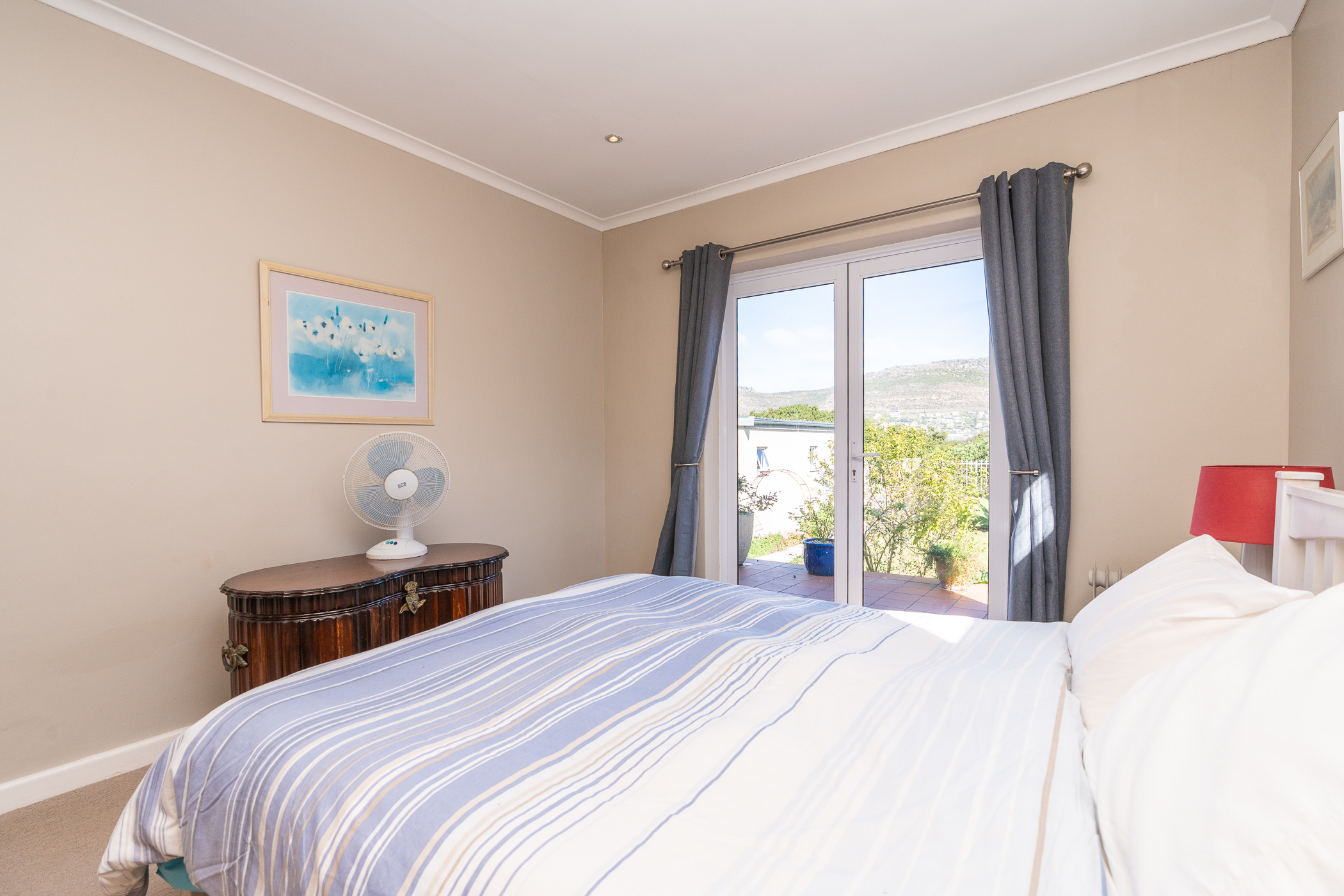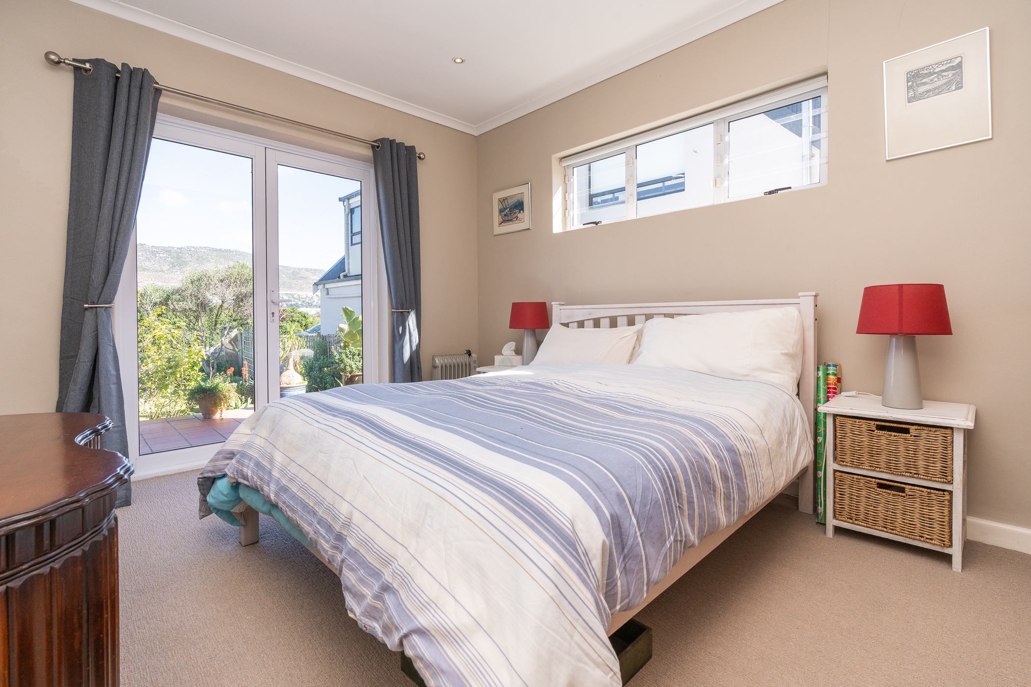 Illuminate Real Estate is proud to present this airy, spacious home on the edge of a beautiful nature walkway alongside the Silvermine River and a mere 1.2km from False Bay’s best golf course. Built only 12 years ago, with solid double brick walls throughout (meaning that further double storey additions are possible), the electrics and plumbing still have a lifetime ahead without worry. The entrance leads up to the house via a path alongside the oversized, automated double garage (with staff loo) onto a raised patio and entertainer’s braai room. The braai room in turn leads in a spectacular double volume living room that features a lounge, dining room (with iron cast fireplace), modern kitchen with a central island (bamboo counters), stone counter on the periphery, 900mm SMEG gas/electric stove and extractor, and doors that step onto a sunny, wooden, deck.