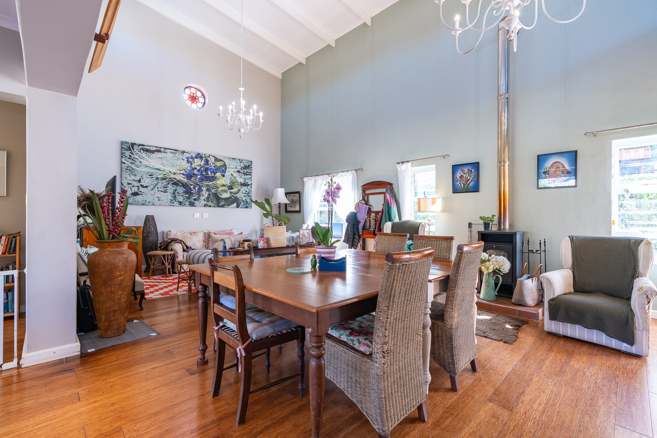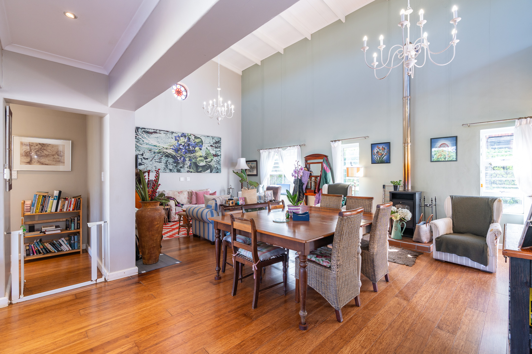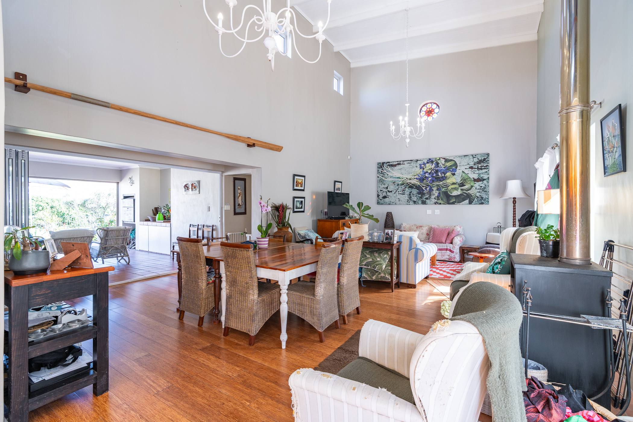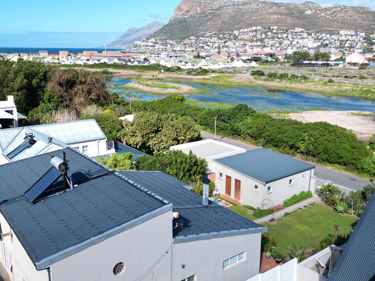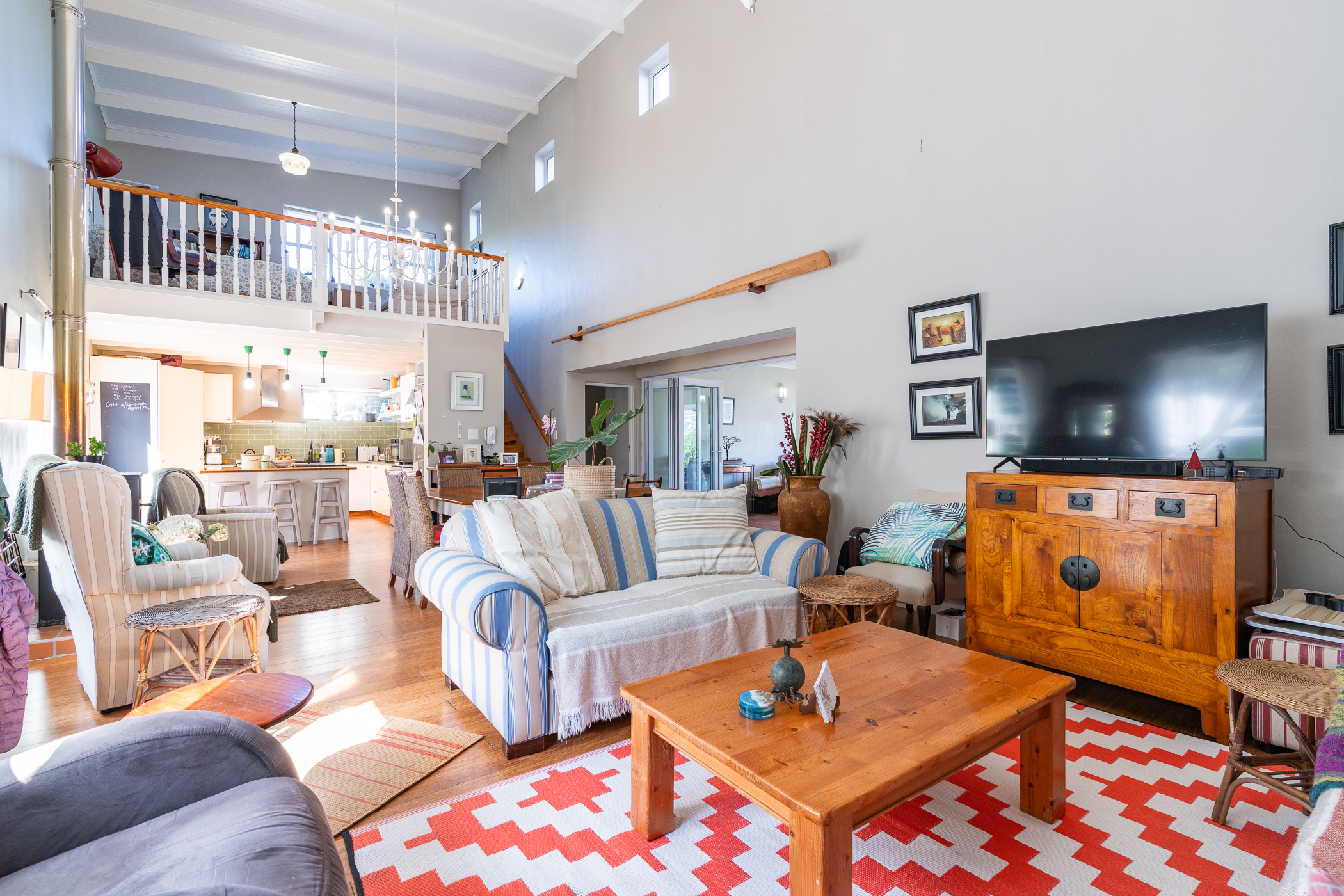 Illuminate Real Estate is proud to present this airy, spacious home on the edge of a beautiful nature walkway alongside the Silvermine River and a mere 1.2km from False Bay’s best golf course. Built only 12 years ago, with solid double brick walls throughout (meaning that further double storey additions are possible), the electrics and plumbing still have a lifetime ahead without worry. The entrance leads up to the house via a path alongside the oversized, automated double garage (with staff loo) onto a raised patio and entertainer’s braai room. The braai room in turn leads in a spectacular double volume living room that features a lounge, dining room (with iron cast fireplace), modern kitchen with a central island (bamboo counters), stone counter on the periphery, 900mm SMEG gas/electric stove and extractor, and doors that step onto a sunny, wooden, deck.