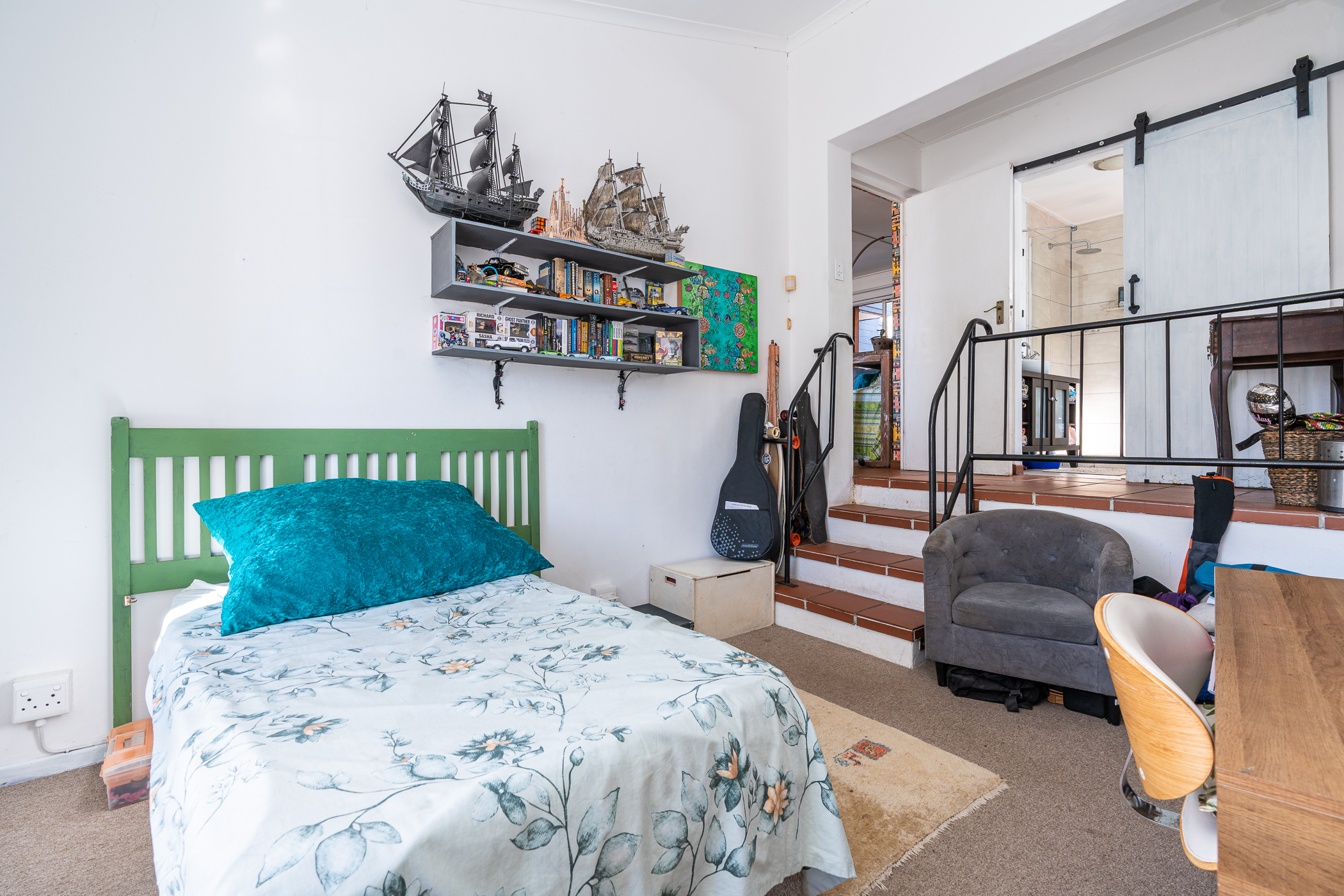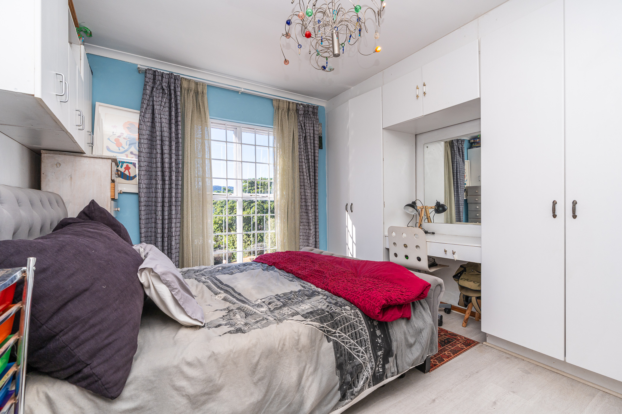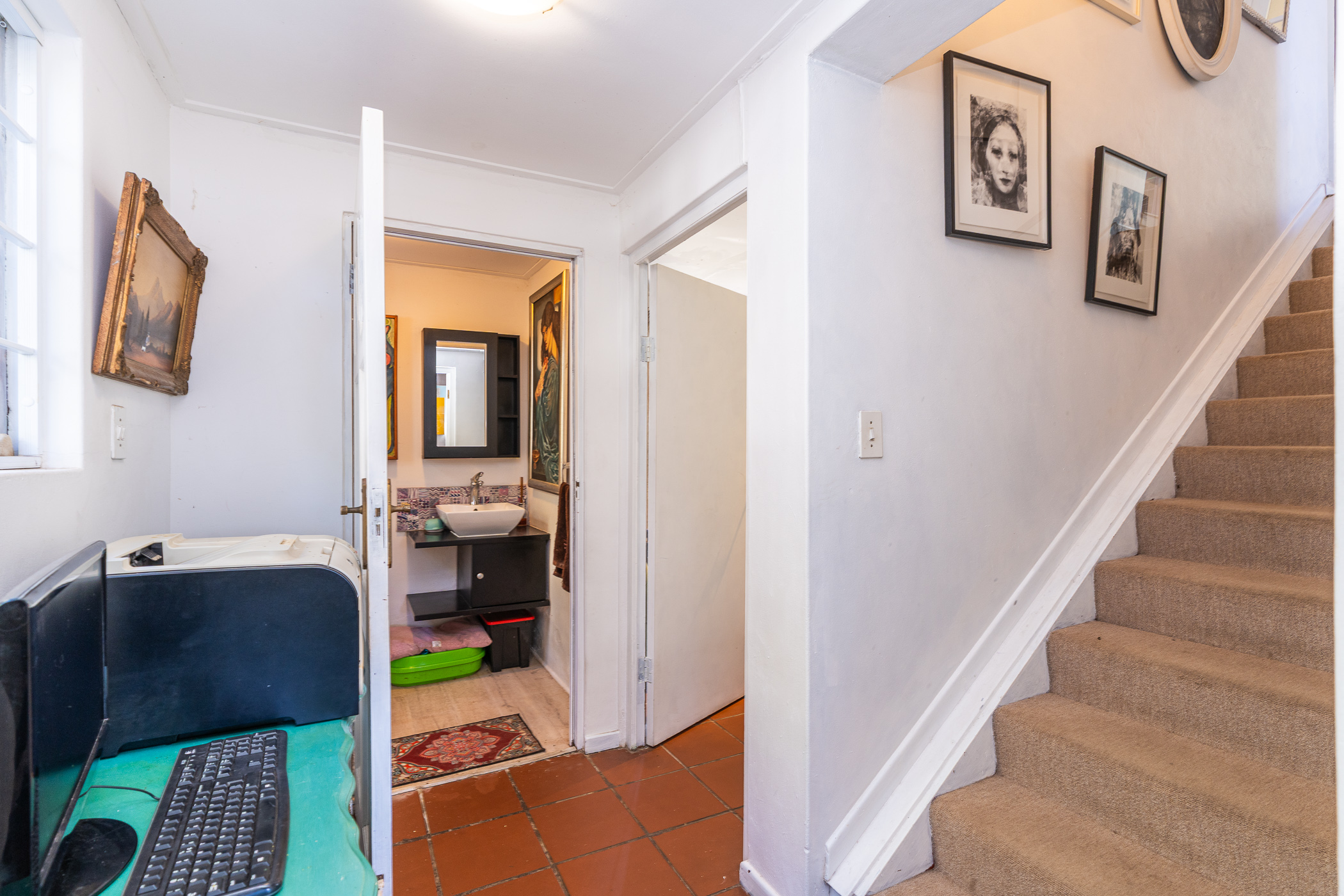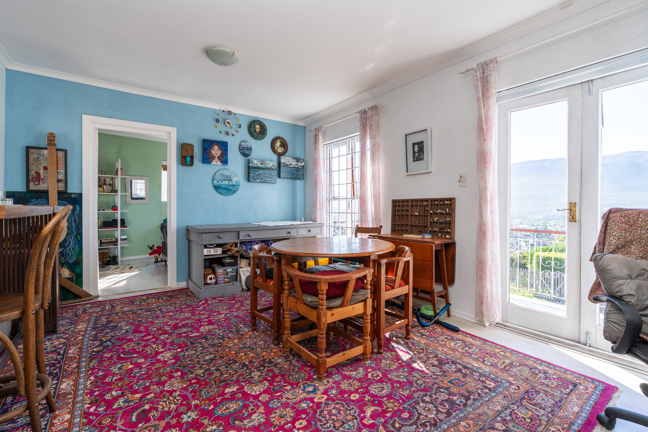 Through a door in the kitchen, we are taken to a work-from-home/office and guest toilet. Carpeted stairs lead up to a further family room/lounge/work area/pajama lounge plus 3 further bedrooms, with built in cupboards, one en-suite with a shower, and a family bathroom with a bathtub.  Doors from the lounge area open to two balconies - one offering sheltered tranquil views of indigenous back garden, and the second (front balcony) gorgeous views across the beautiful Fish Hoek valley. There are views from nearly every corner of this home!