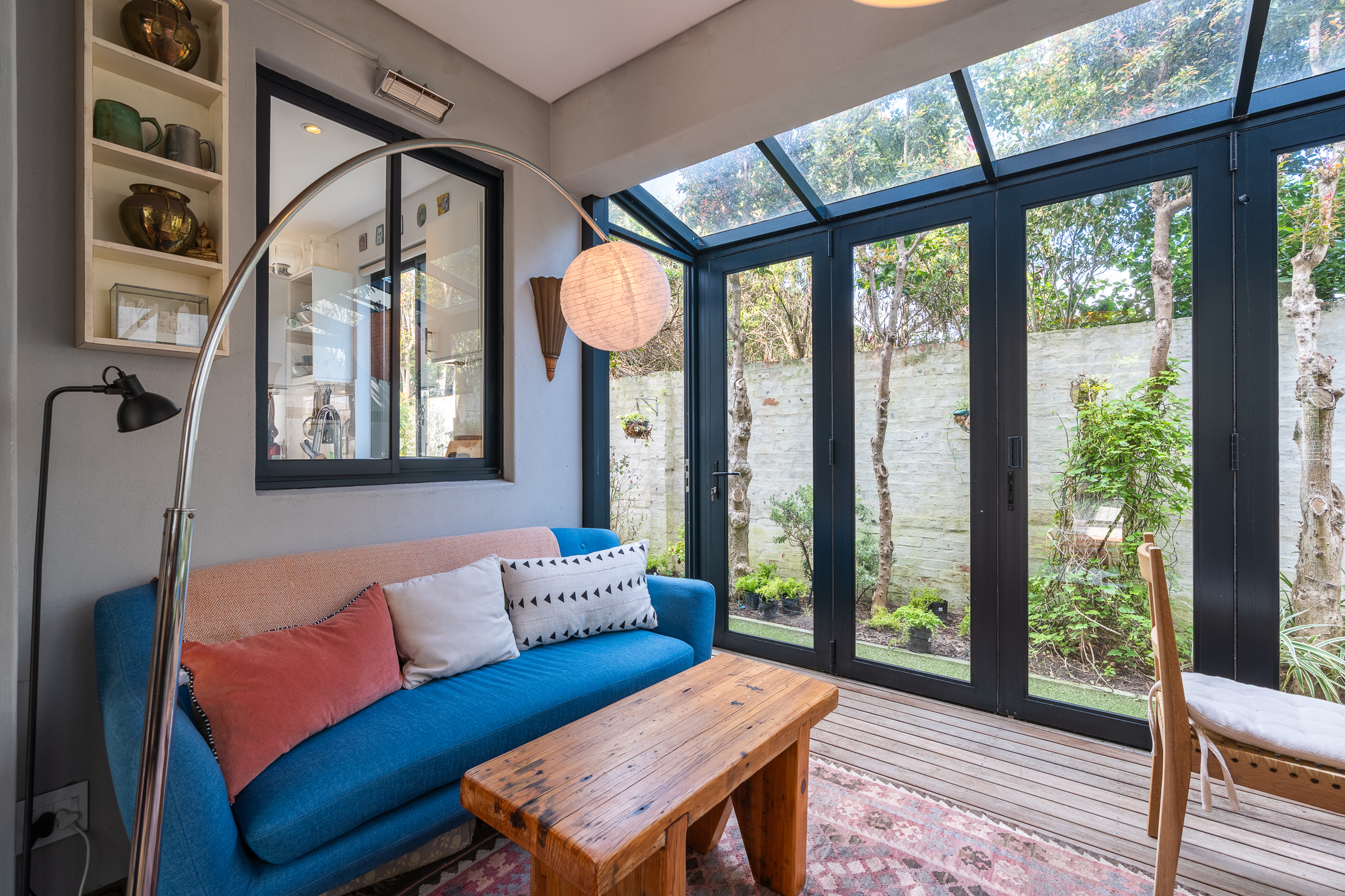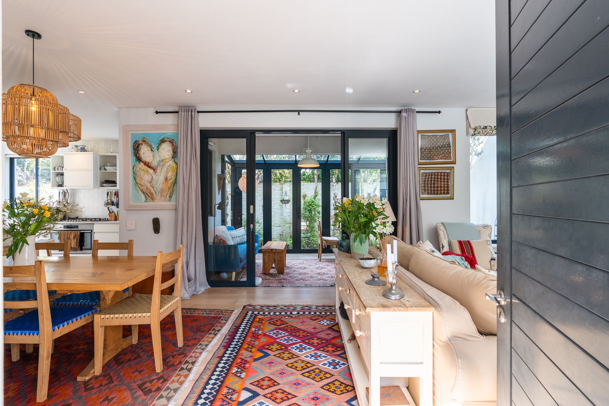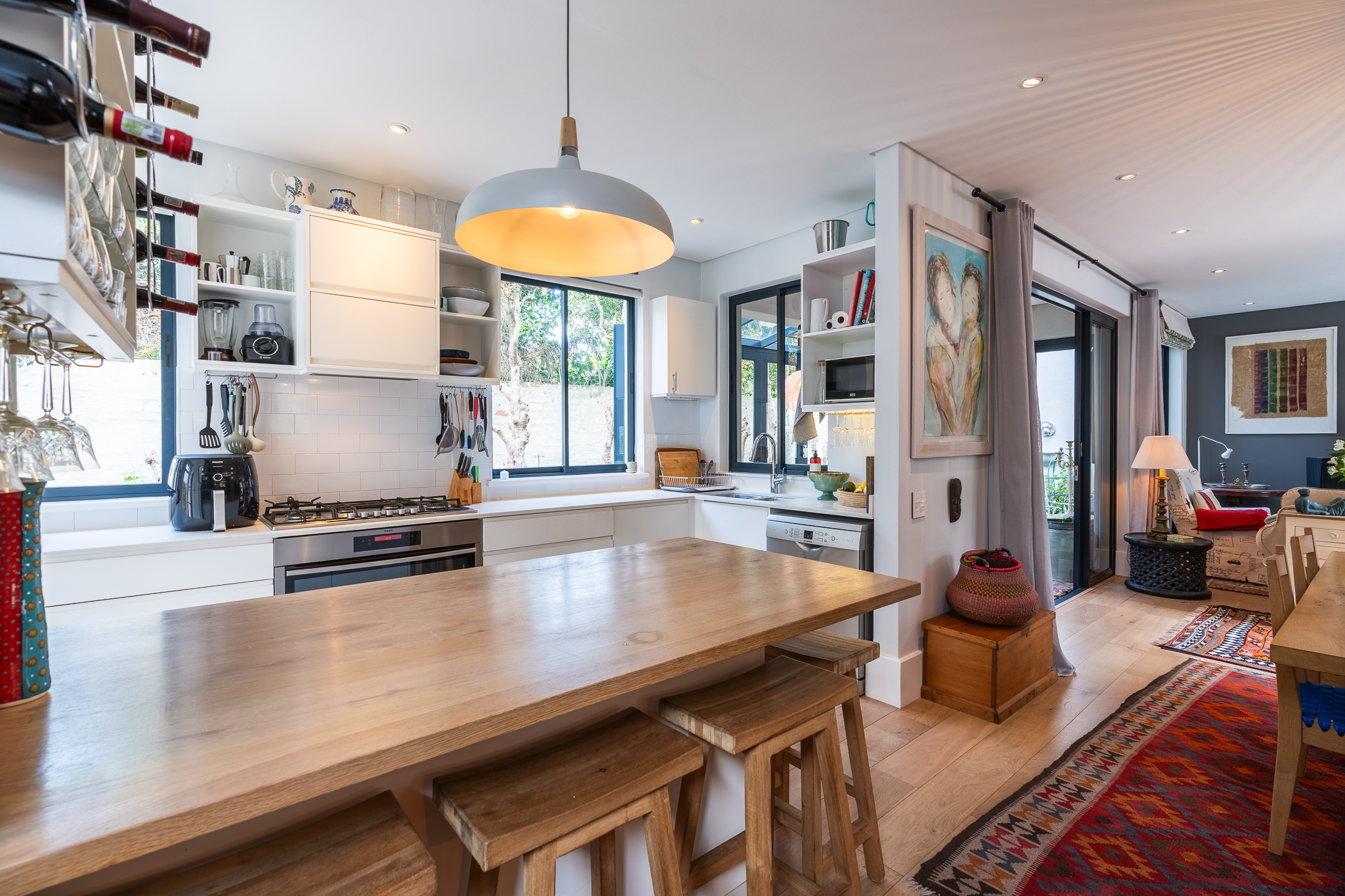 Semi-open plan kitchen to dining area and lounge, with doors to an enclosed pretty patio/sunroom with concertina doors to the small garden area with low maintenance astro grass. Engineered wood floors, aluminium windows and high ceilings offer relaxed peace of mind living. The beautifully designed kitchen with breakfast bar, is plumbed for a dishwasher whilst the extra-large double garage is home for the washing machine and dryer.