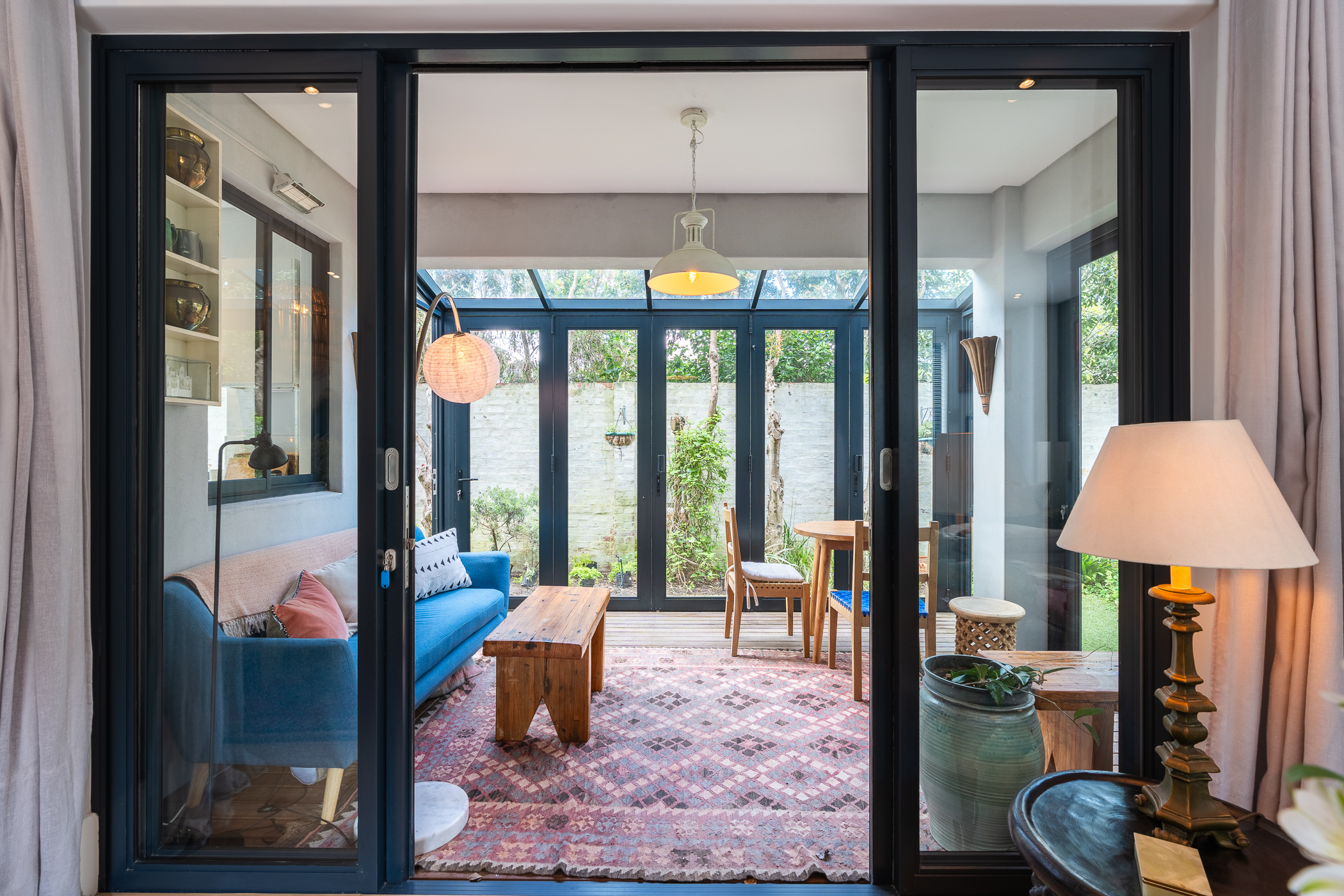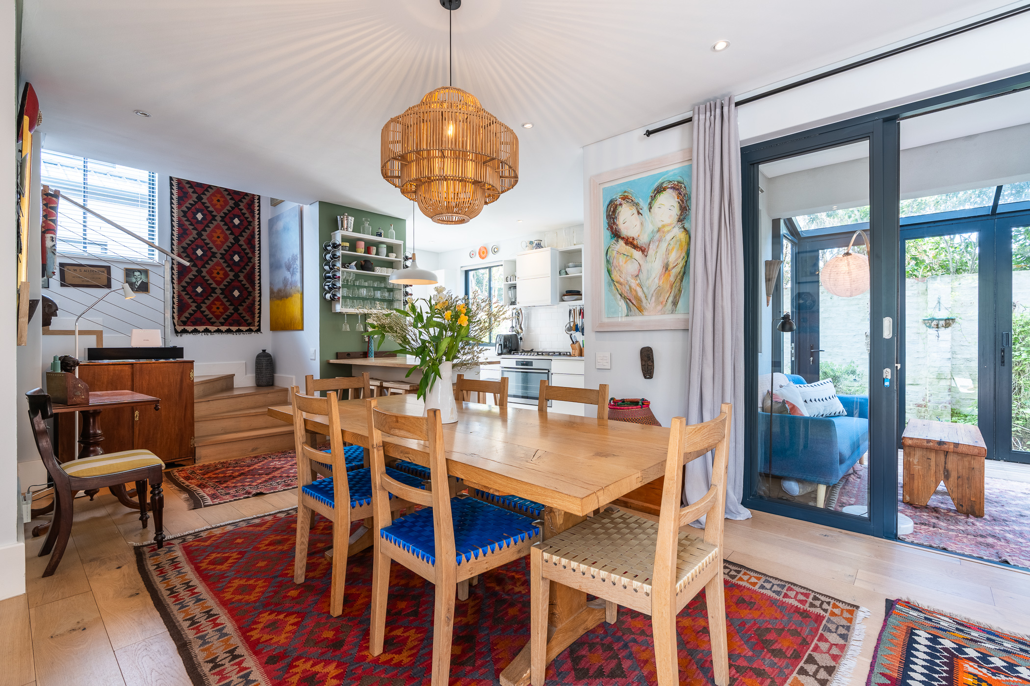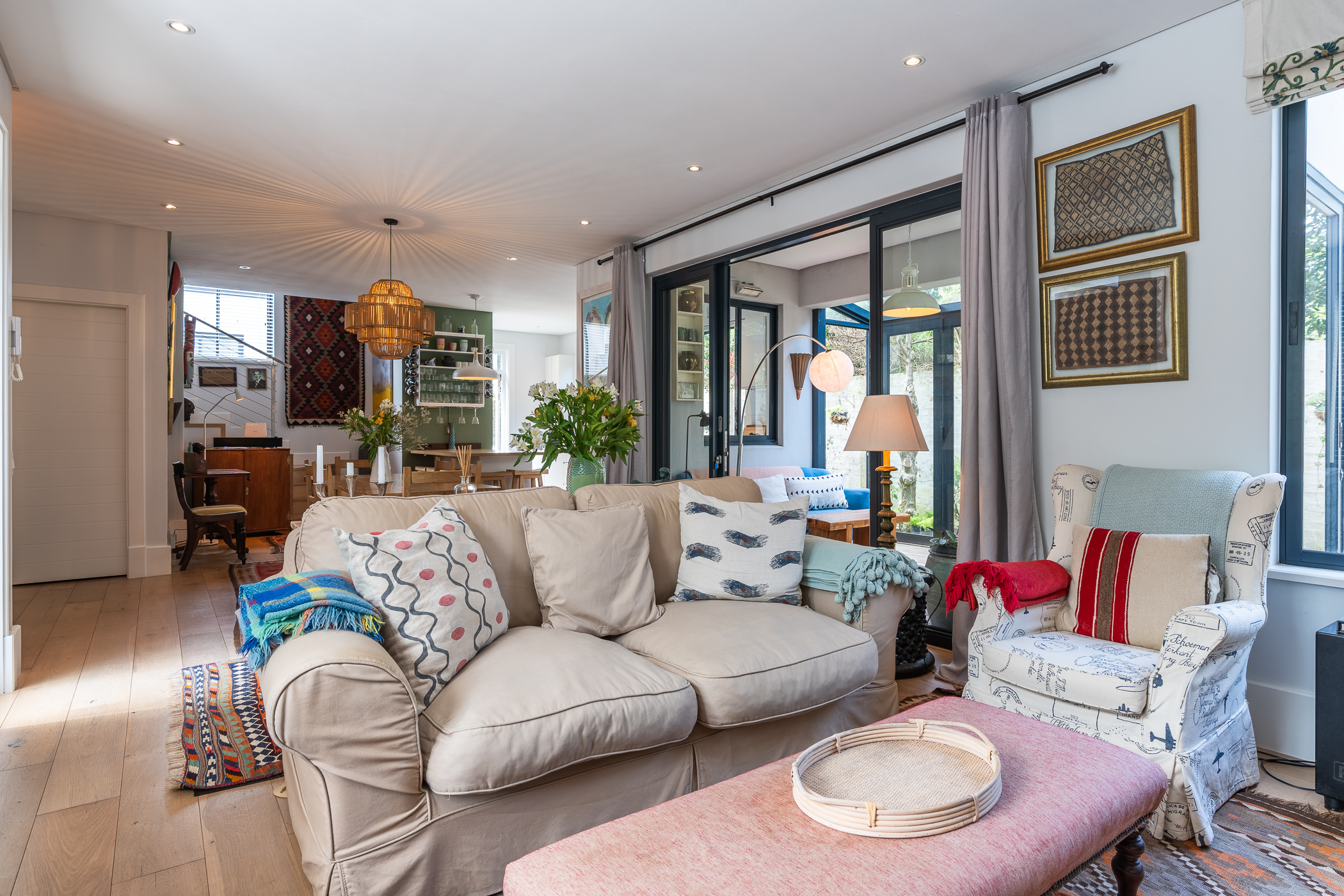 Semi-open plan kitchen to dining area and lounge, with doors to an enclosed pretty patio/sunroom with concertina doors to the small garden area with low maintenance astro grass. Engineered wood floors, aluminium windows and high ceilings offer relaxed peace of mind living. The beautifully designed kitchen with breakfast bar, is plumbed for a dishwasher whilst the extra-large double garage is home for the washing machine and dryer.