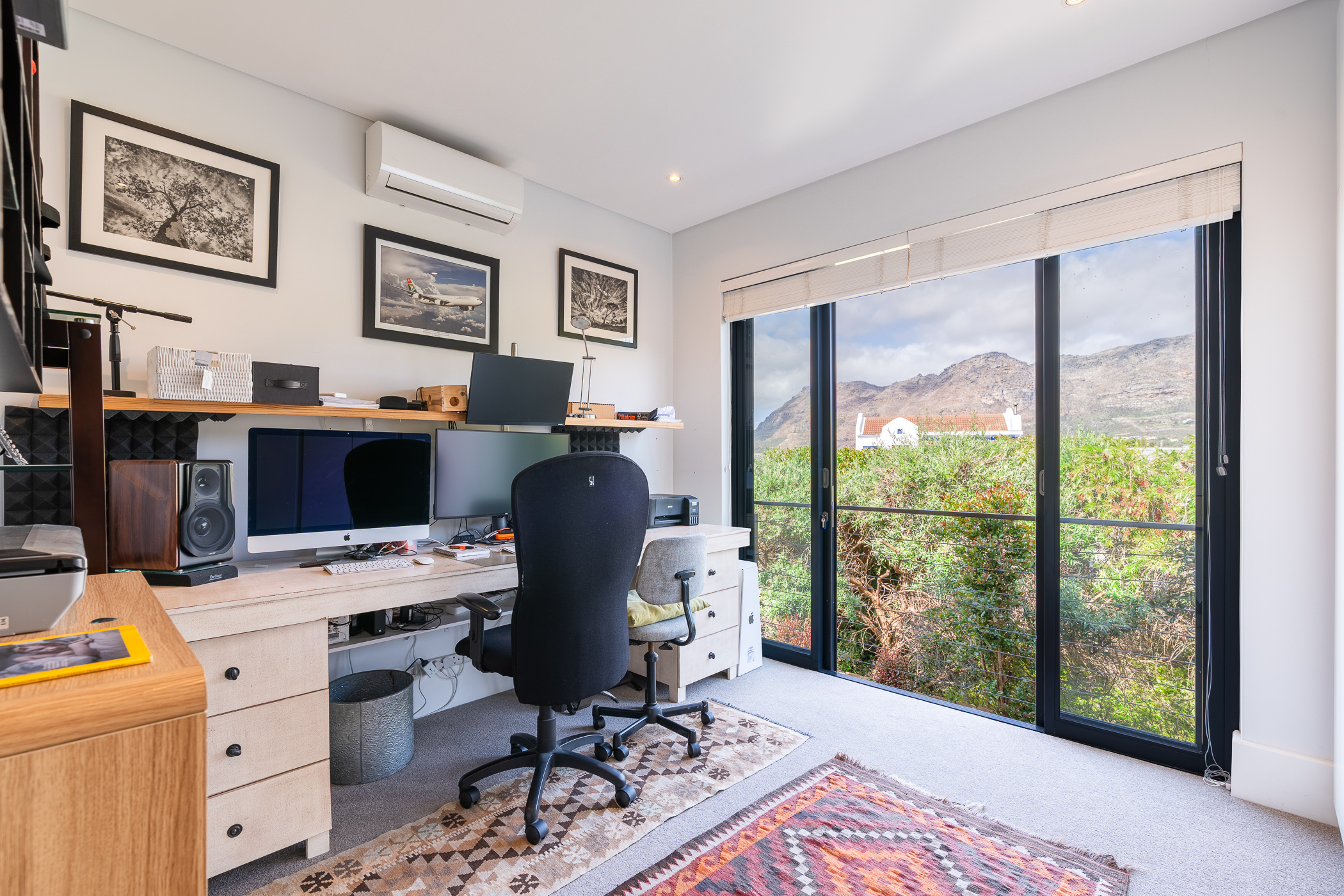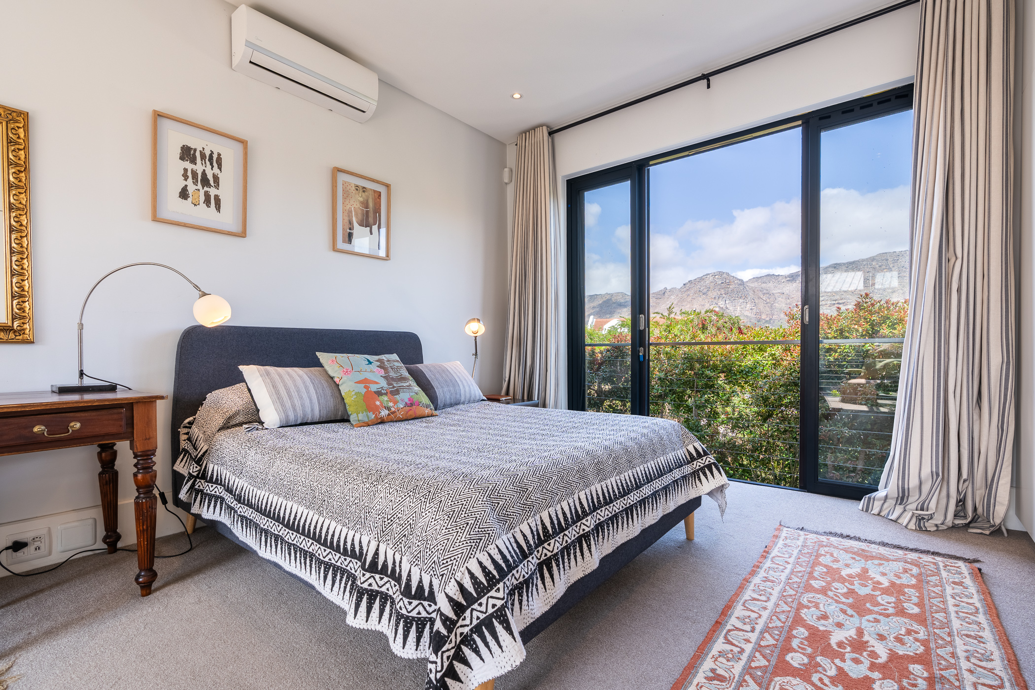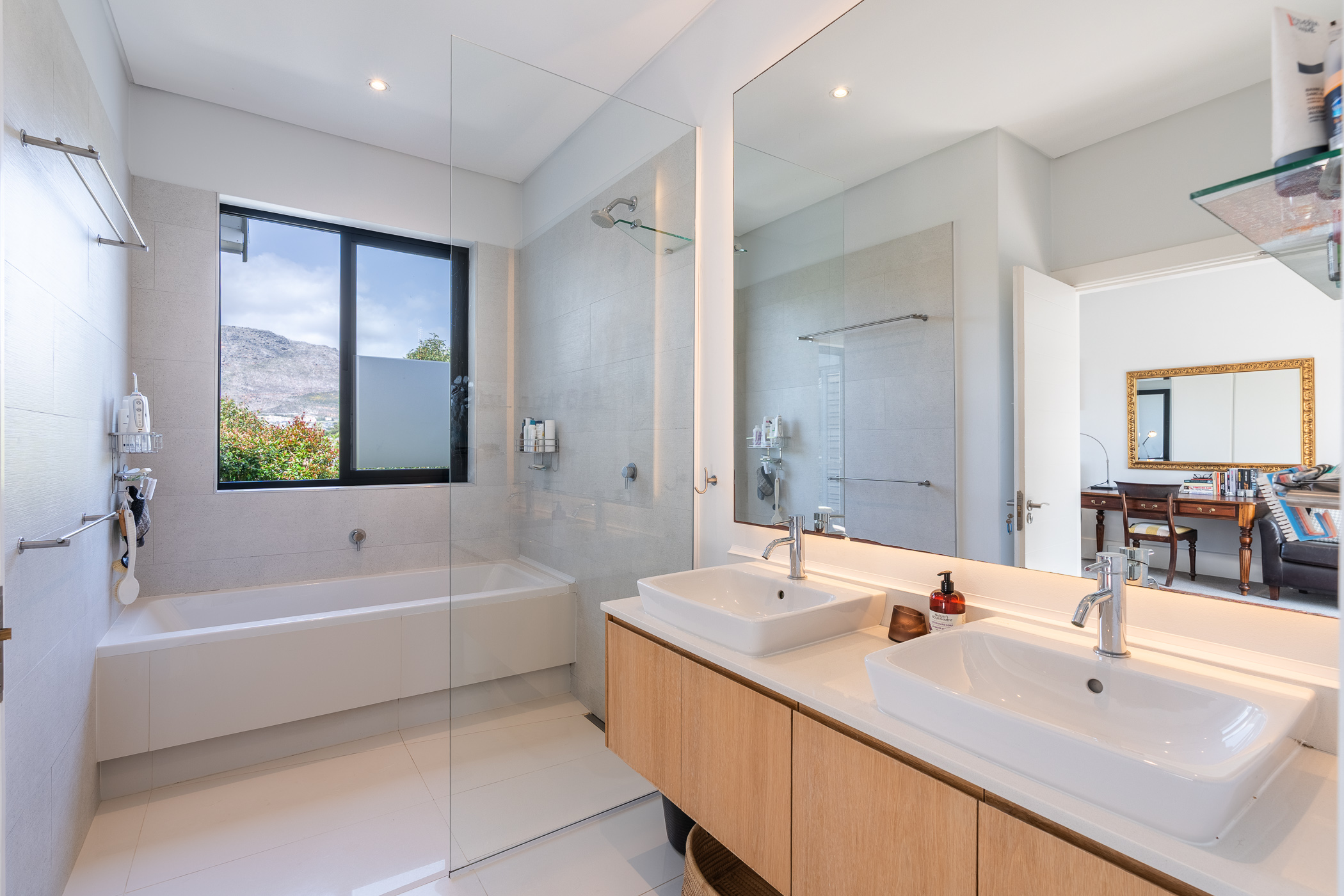 A generously wide staircase leads to three spacious light and bright bedrooms, all en-suite, all carpeted with built in cupboards, the main bedroom has a double vanity with a shower and bath plus stunning mountain views.