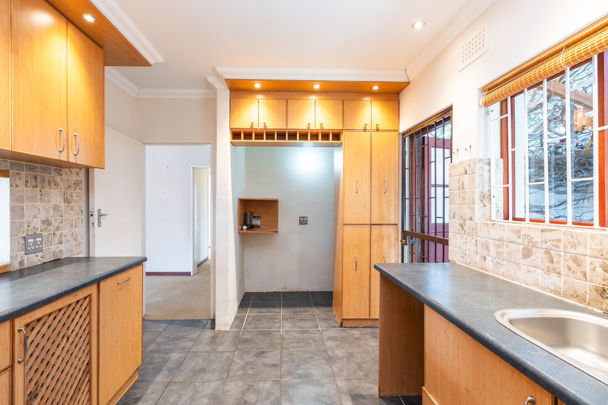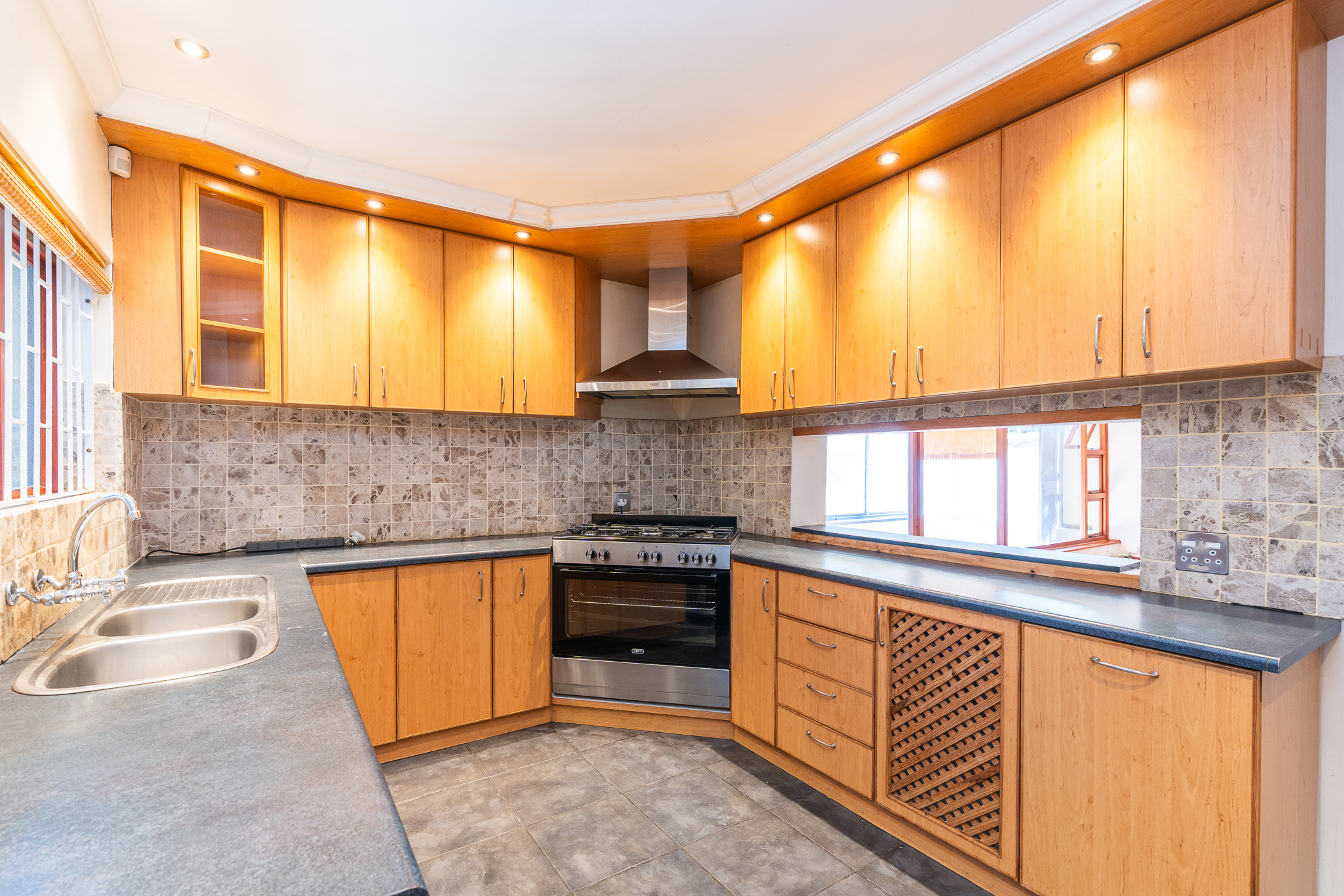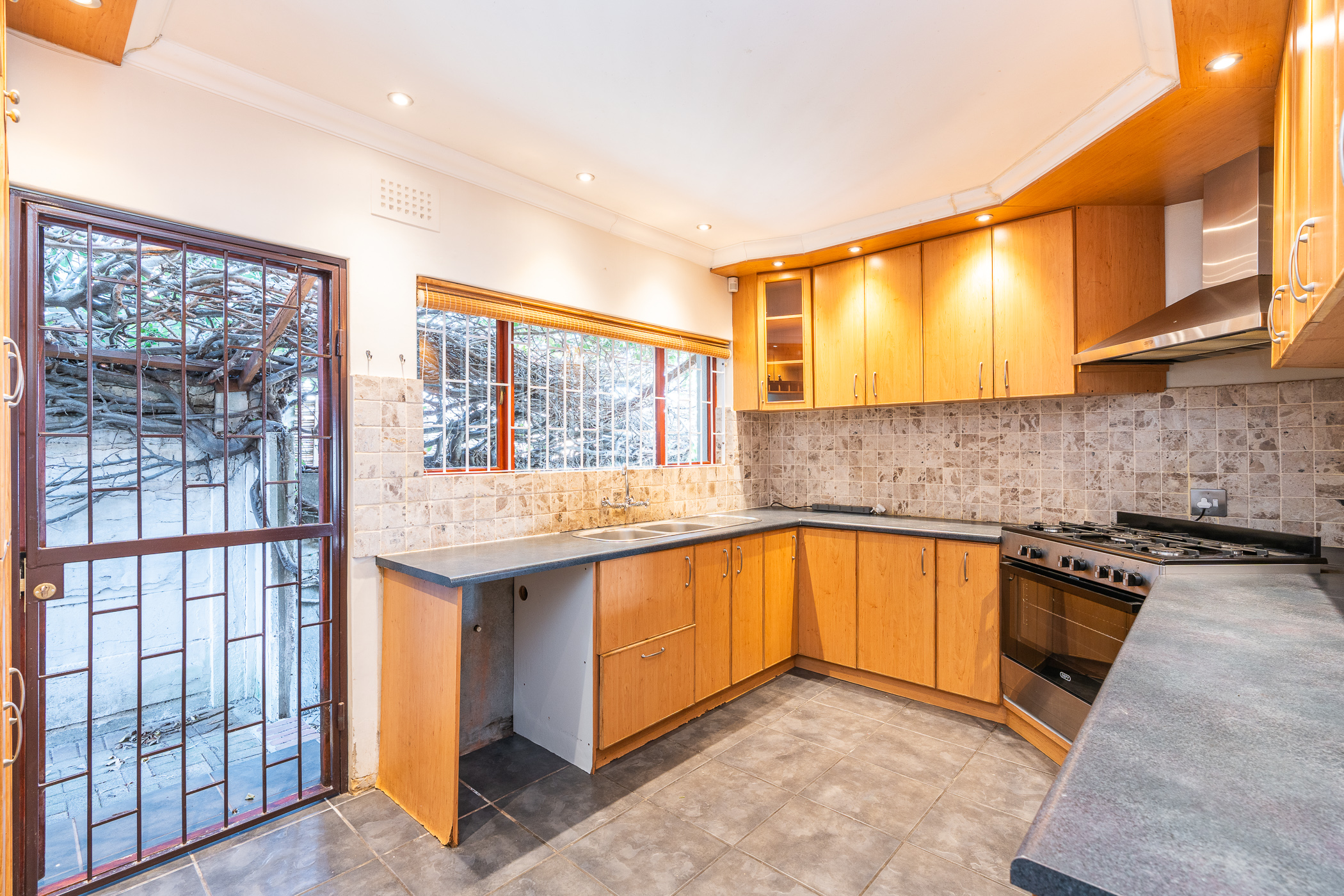 The well-appointed kitchen is fitted with a gas stove, plumbed for two appliances, and boasts ample counter space and storage for easy family living.