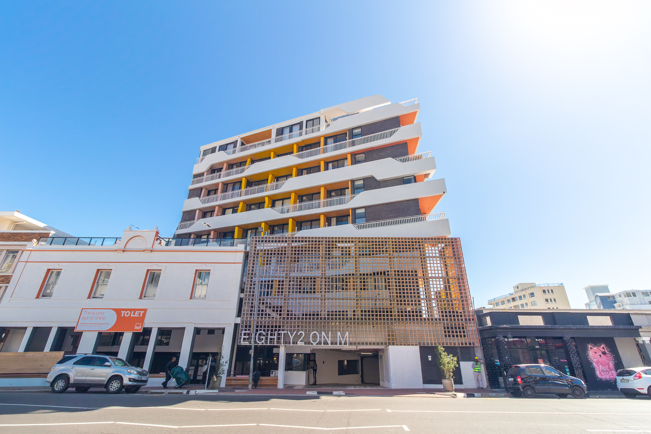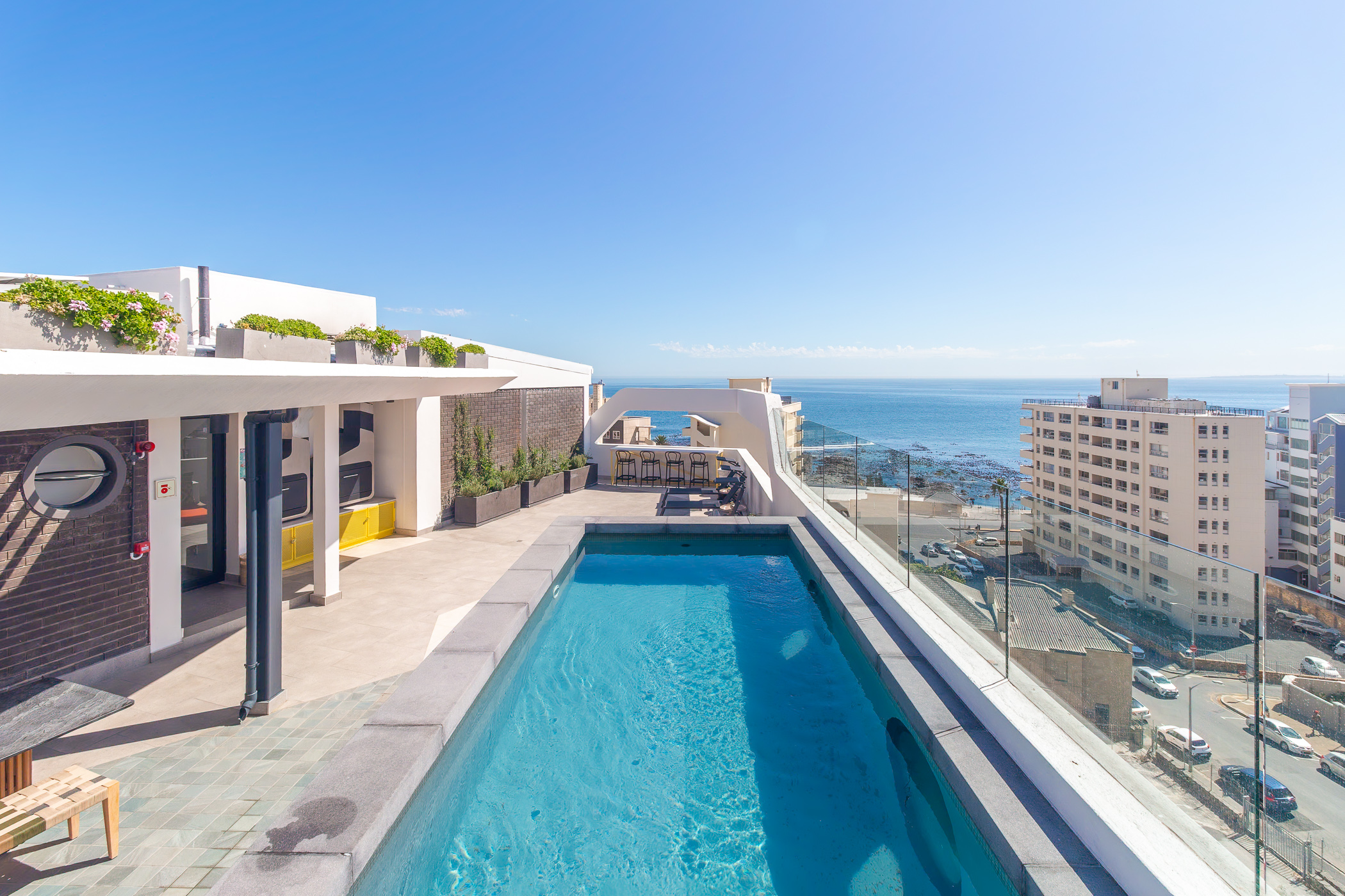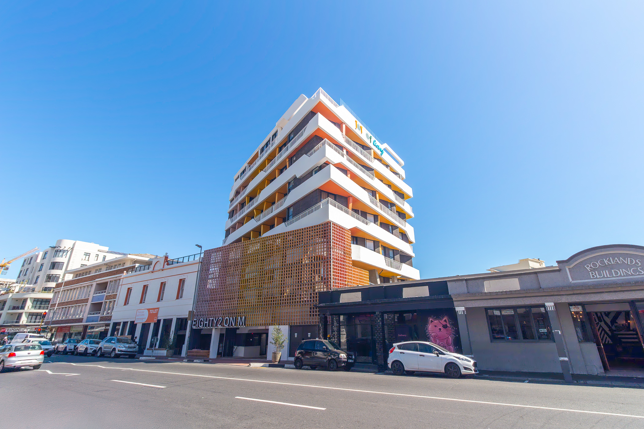 EIGHTY2 ON MAIN is a super fun, incredibly well located, aparthotel completed in 2024. Situated a mere 240m from the promenade and Rocklands Beach, in an area rich with gorgeous cafes, restaurants and convenience stores. The building has a colourful vibrancy to it which brings a smile to every resident. The communal rooftop pool, sundeck, and braai facilities are well-utilized and superbly maintained.