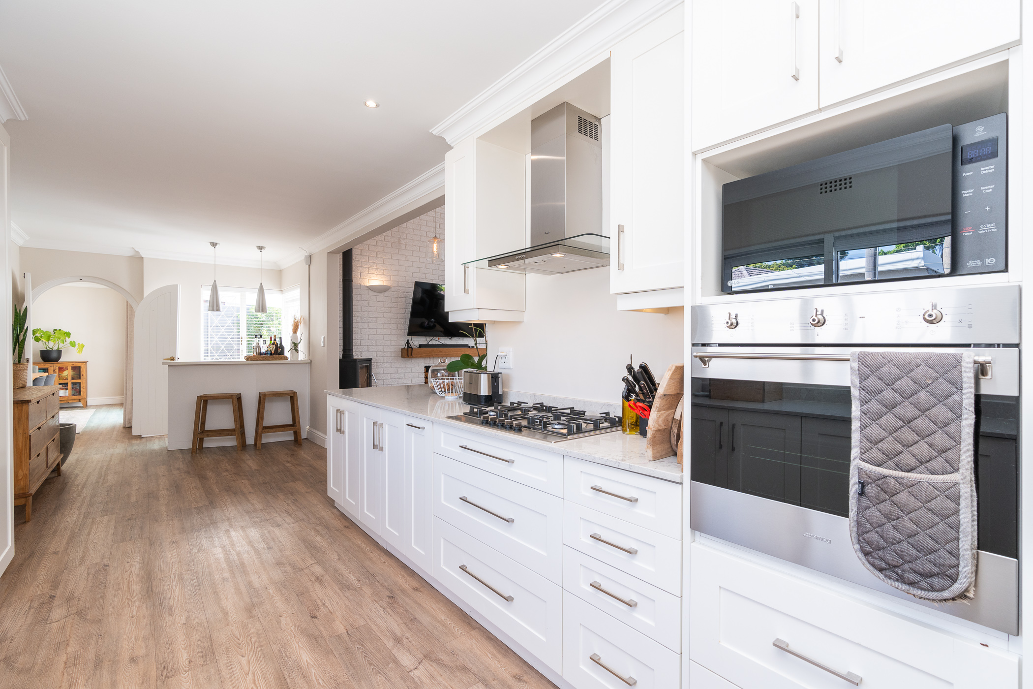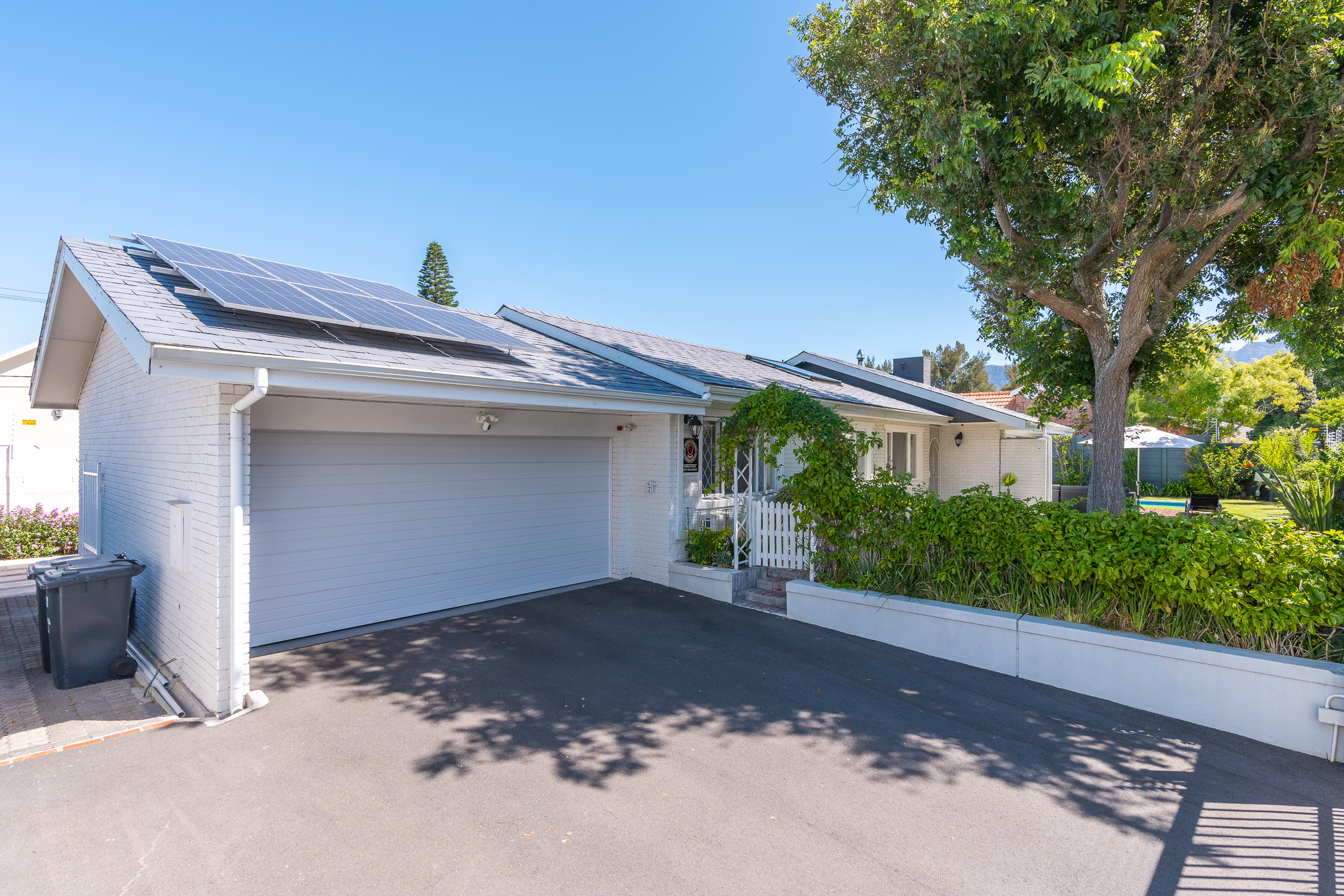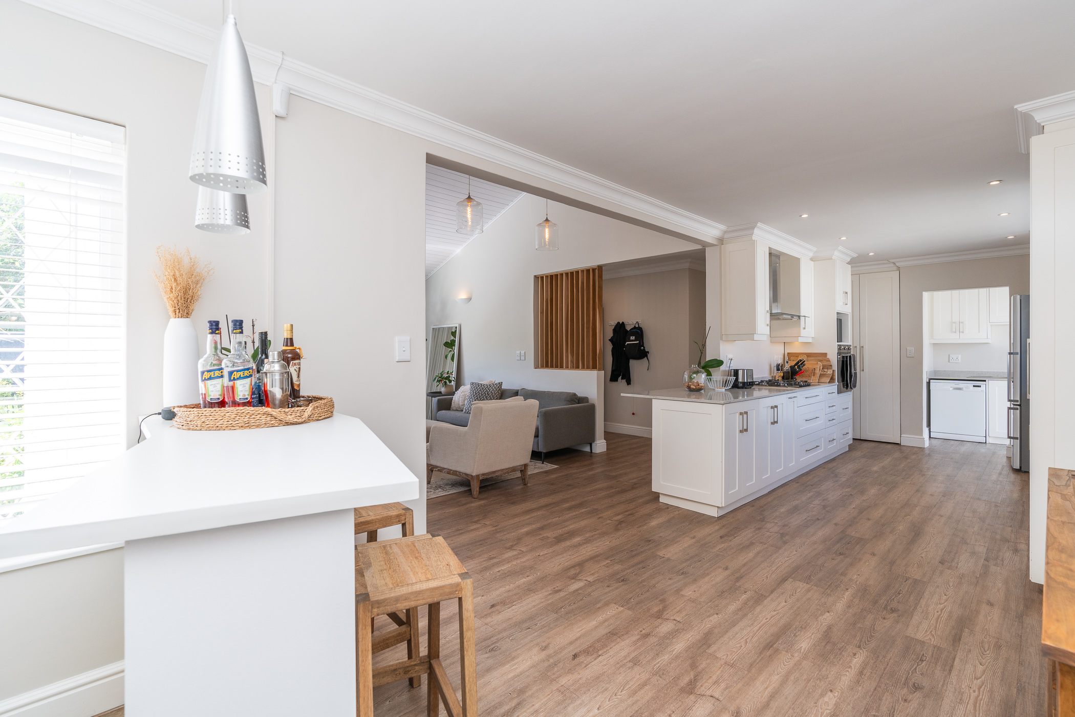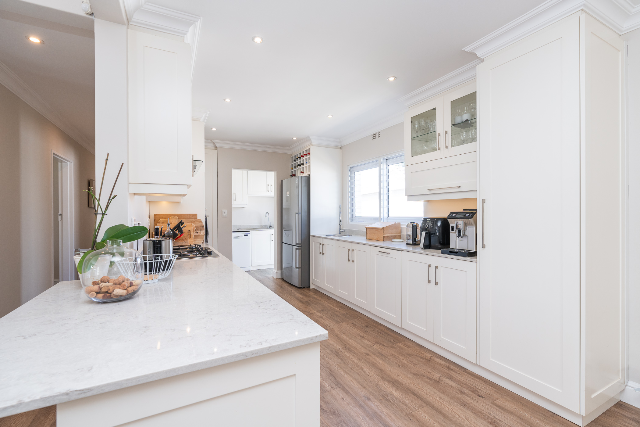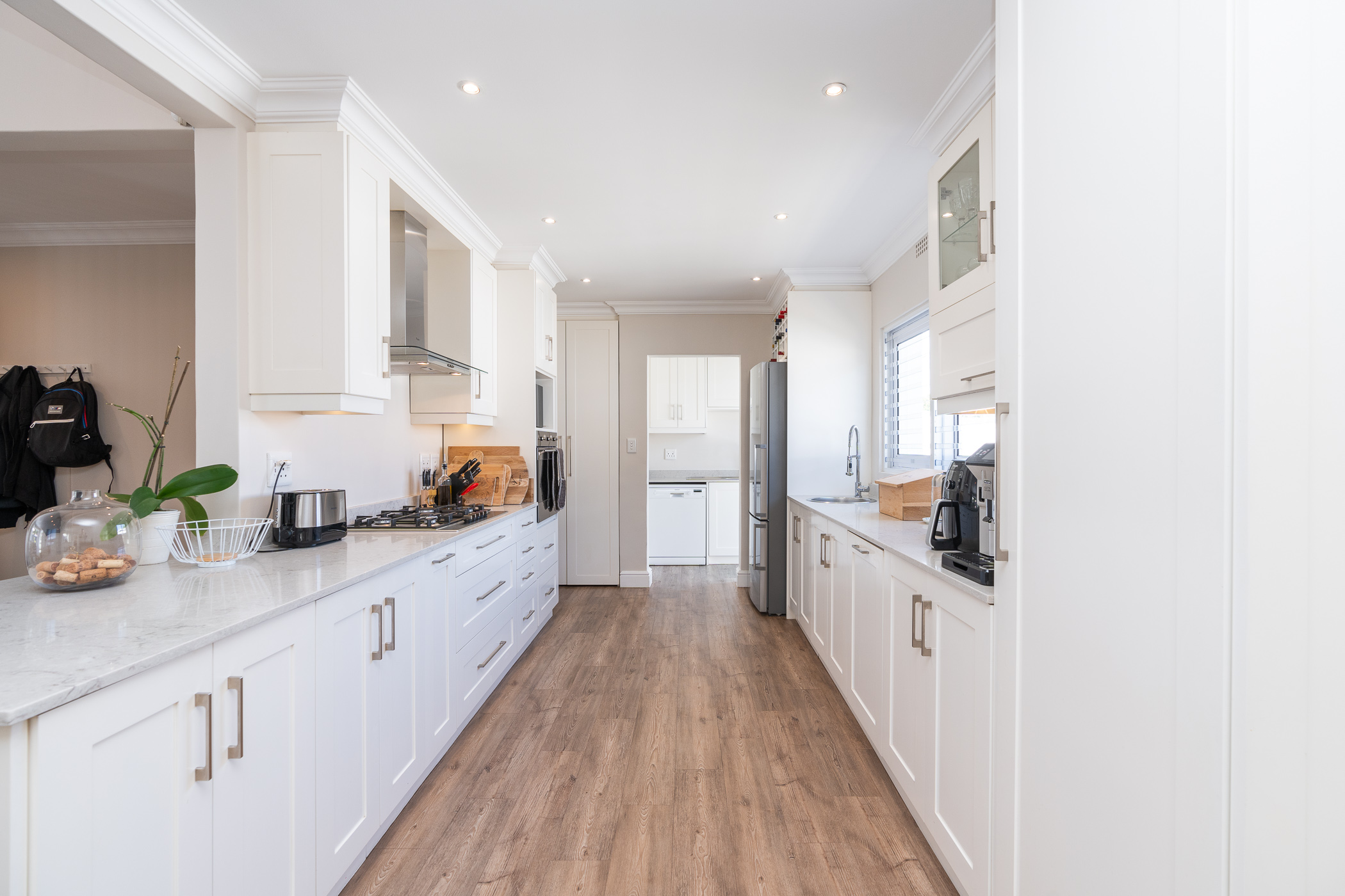 Beautifully laid out, with neutral finishes and tons of natural light! This ultra neat family home is situated in a quiet spot in the very upper reaches of Meadowridge, a short 200m stroll to everyone's favourite 24 hour Woolies/garage on Ladies Mile. The home offers an automated double garage with direct access, plus secure parking for another 3 vehicles in the driveway. An inviting path leads guests along the front of the house to the front door, which opens into a gorgeous double-volume living room (with iron-cast fireplace) and sliding doors onto a wooden deck. The very spacious kitchen is open plan, has plenty of counter and storage space, a large almost walk-in pantry, gas hob, SMEG eye-level oven, prep bowl and separate scullery with space for a dishwasher (washing machine is situated in an extra space in the garage). The kitchen leads left past a fun built-in bar, and into a comfortable, North-facing dining room which could also serve as a playroom or studio.