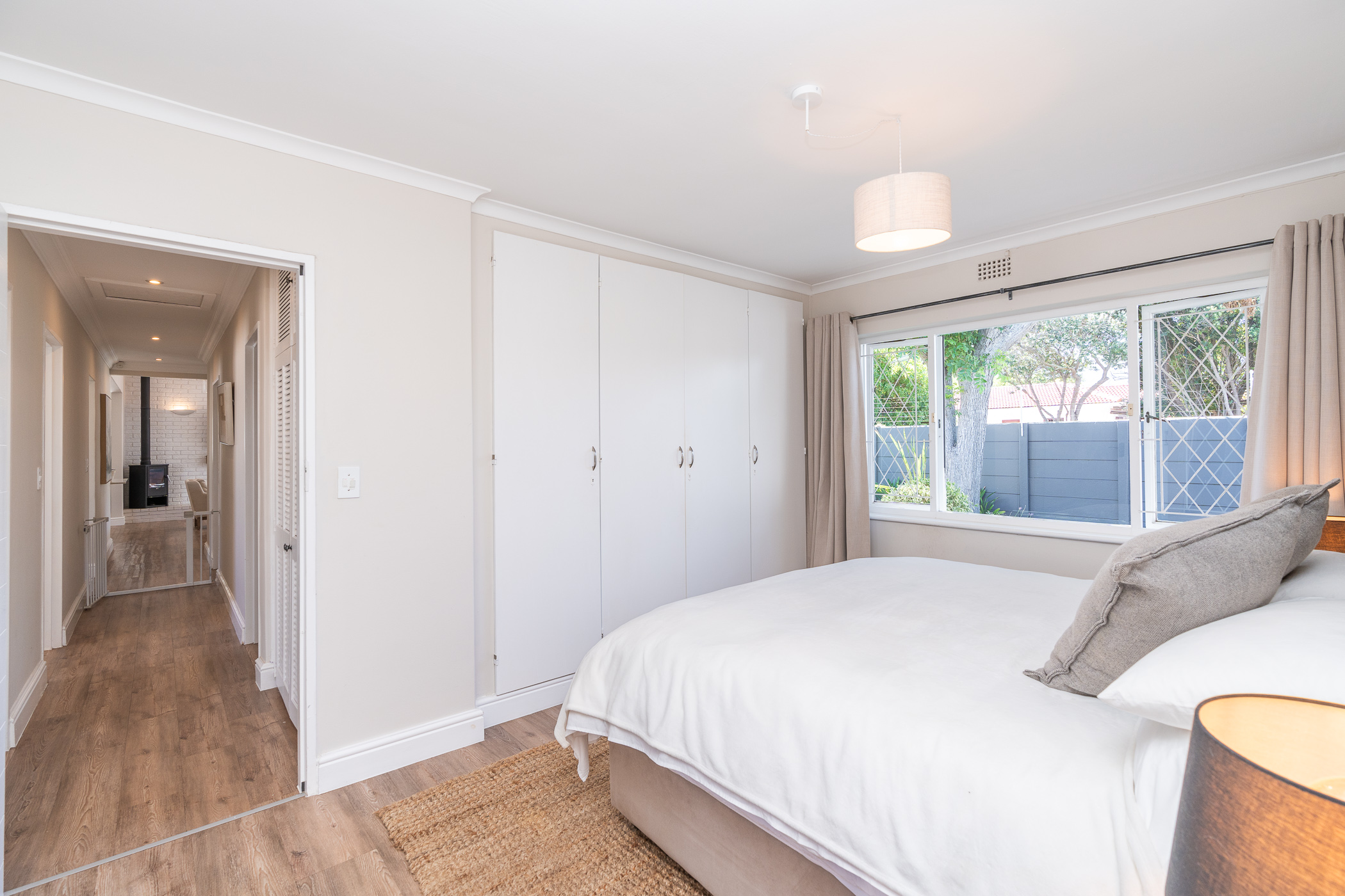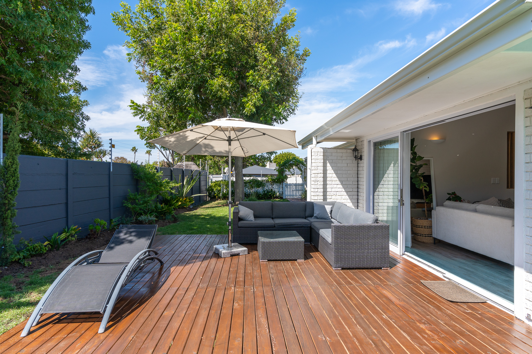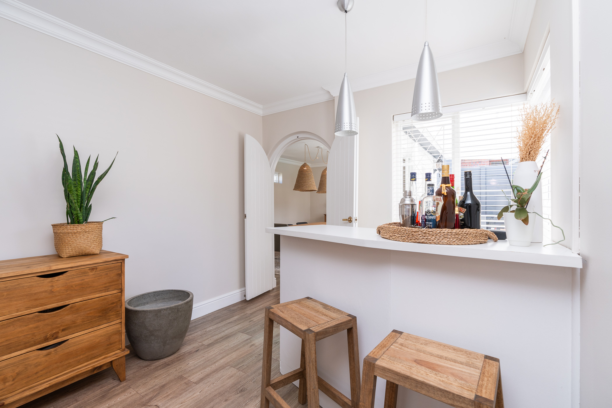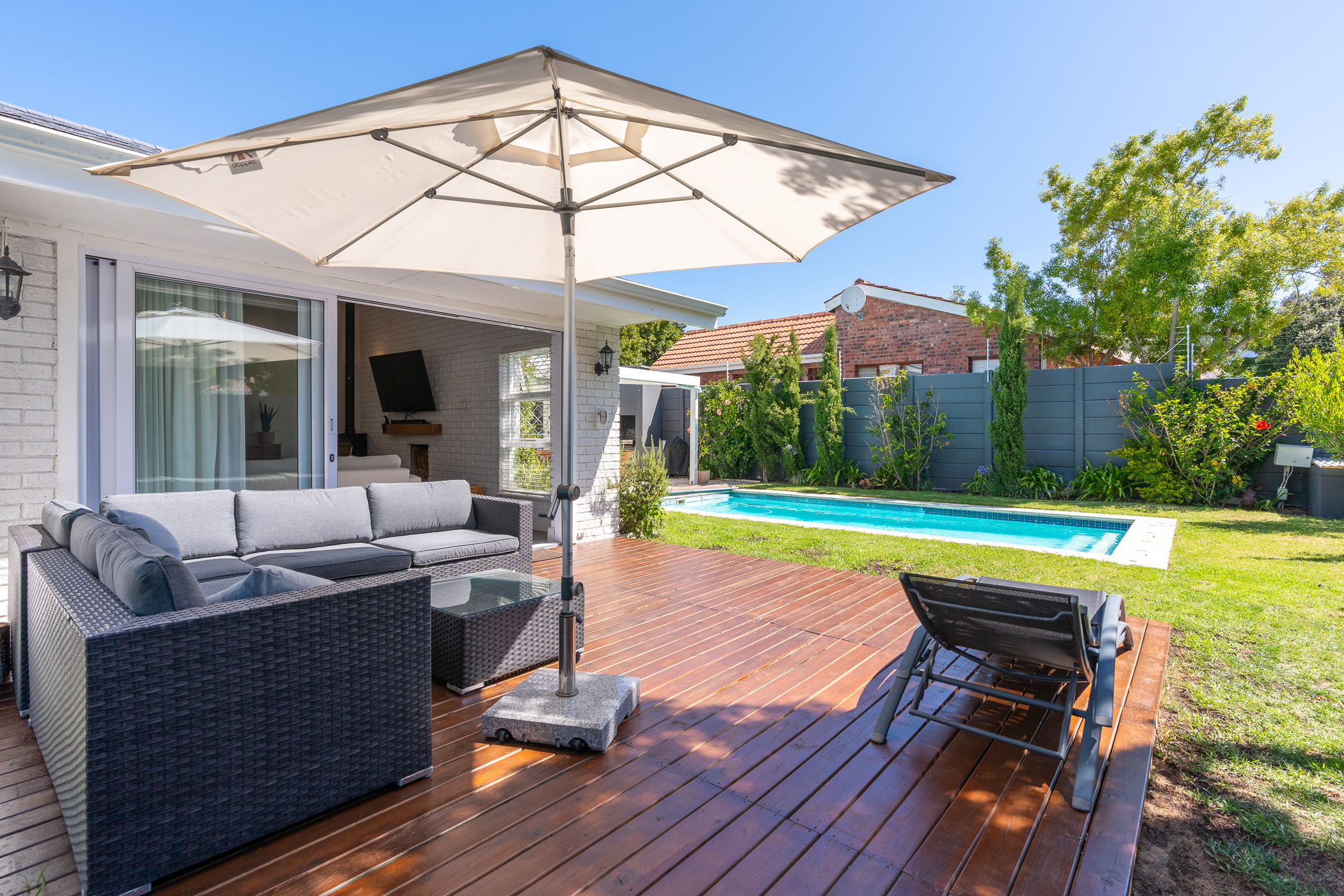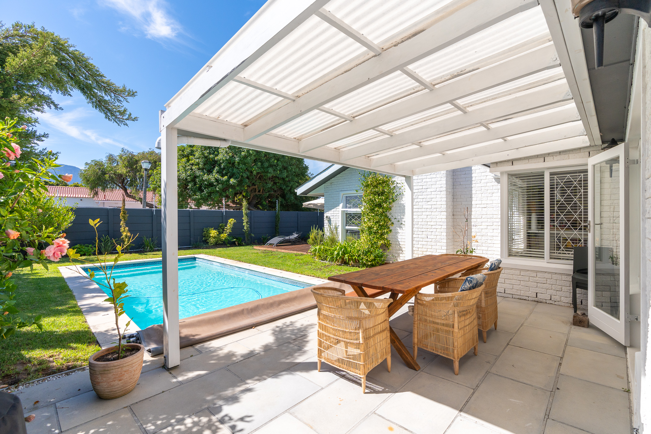 Beautifully laid out, with neutral finishes and tons of natural light! This ultra neat family home is situated in a quiet spot in the very upper reaches of Meadowridge, a short 200m stroll to everyone's favourite 24 hour Woolies/garage on Ladies Mile. The home offers an automated double garage with direct access, plus secure parking for another 3 vehicles in the driveway. An inviting path leads guests along the front of the house to the front door, which opens into a gorgeous double-volume living room (with iron-cast fireplace) and sliding doors onto a wooden deck. The very spacious kitchen is open plan, has plenty of counter and storage space, a large almost walk-in pantry, gas hob, SMEG eye-level oven, prep bowl and separate scullery with space for a dishwasher (washing machine is situated in an extra space in the garage). The kitchen leads left past a fun built-in bar, and into a comfortable, North-facing dining room which could also serve as a playroom or studio.