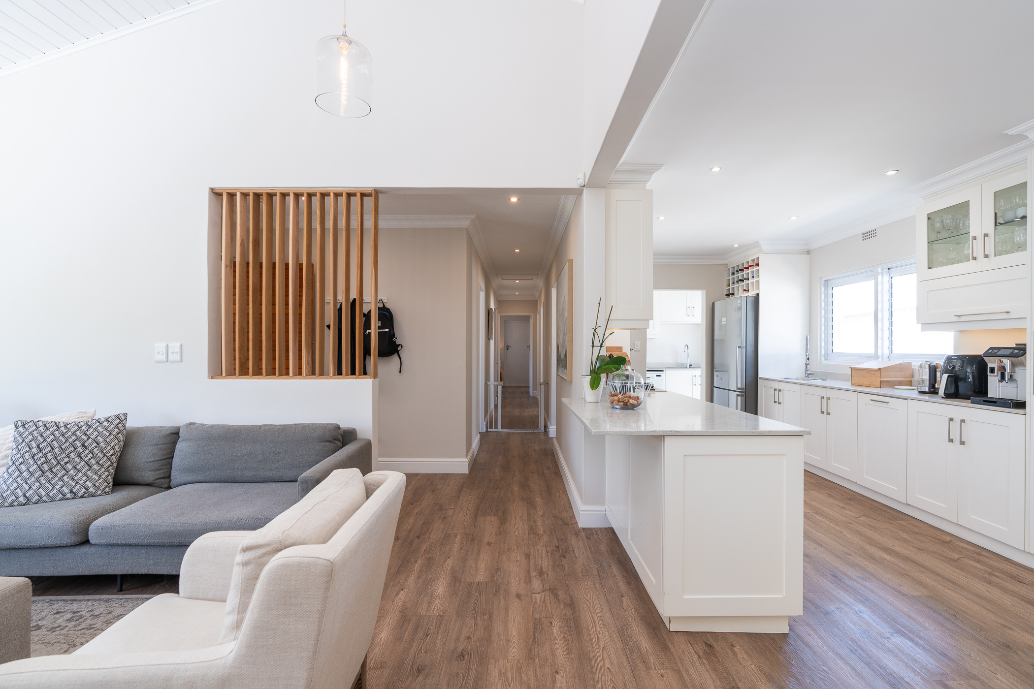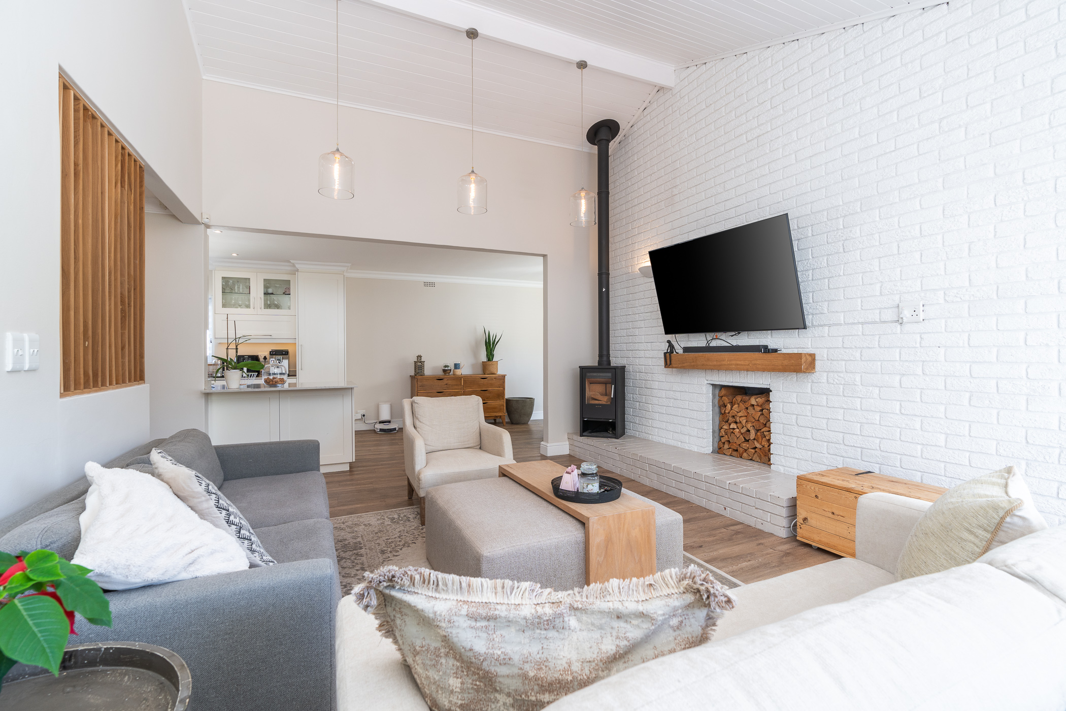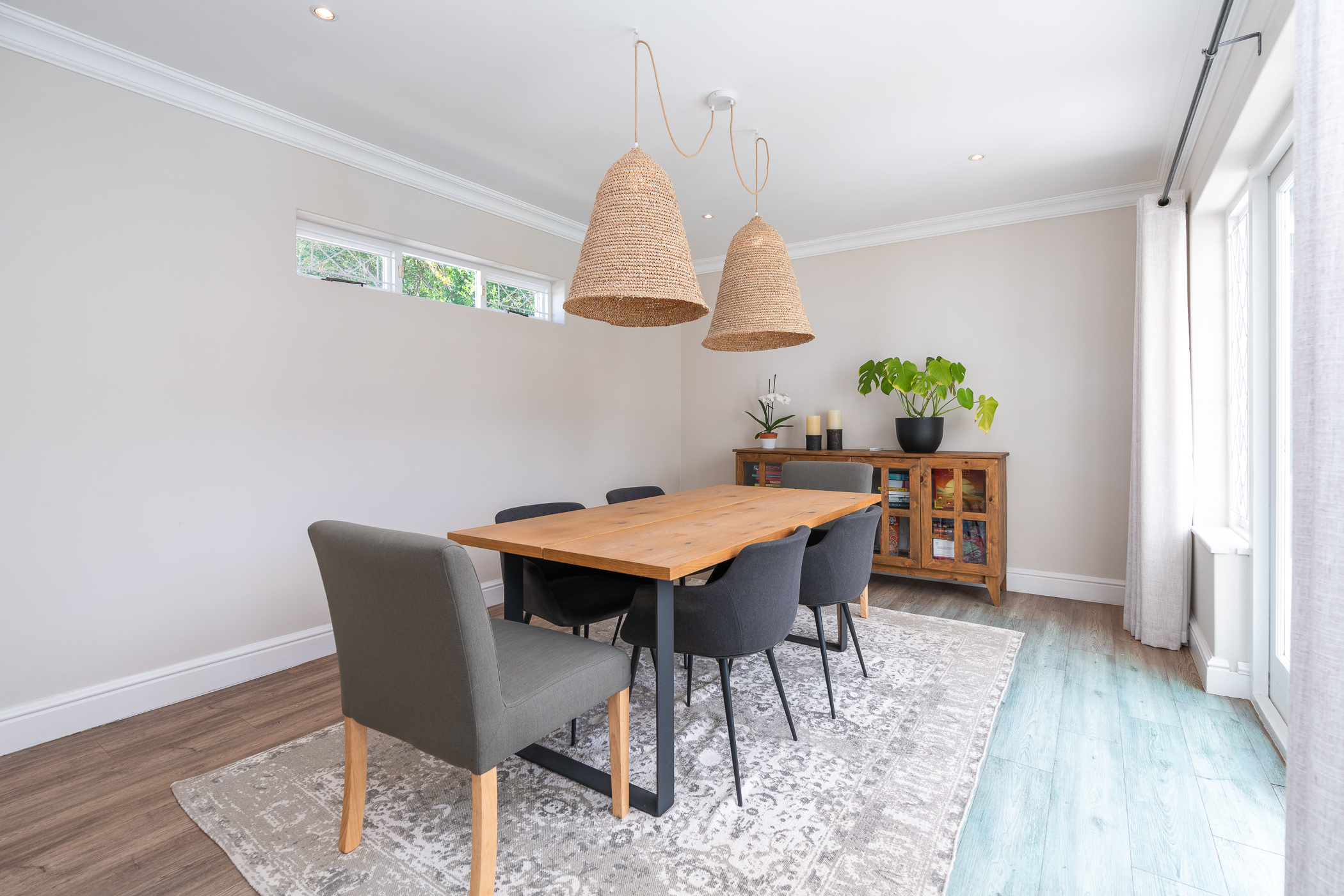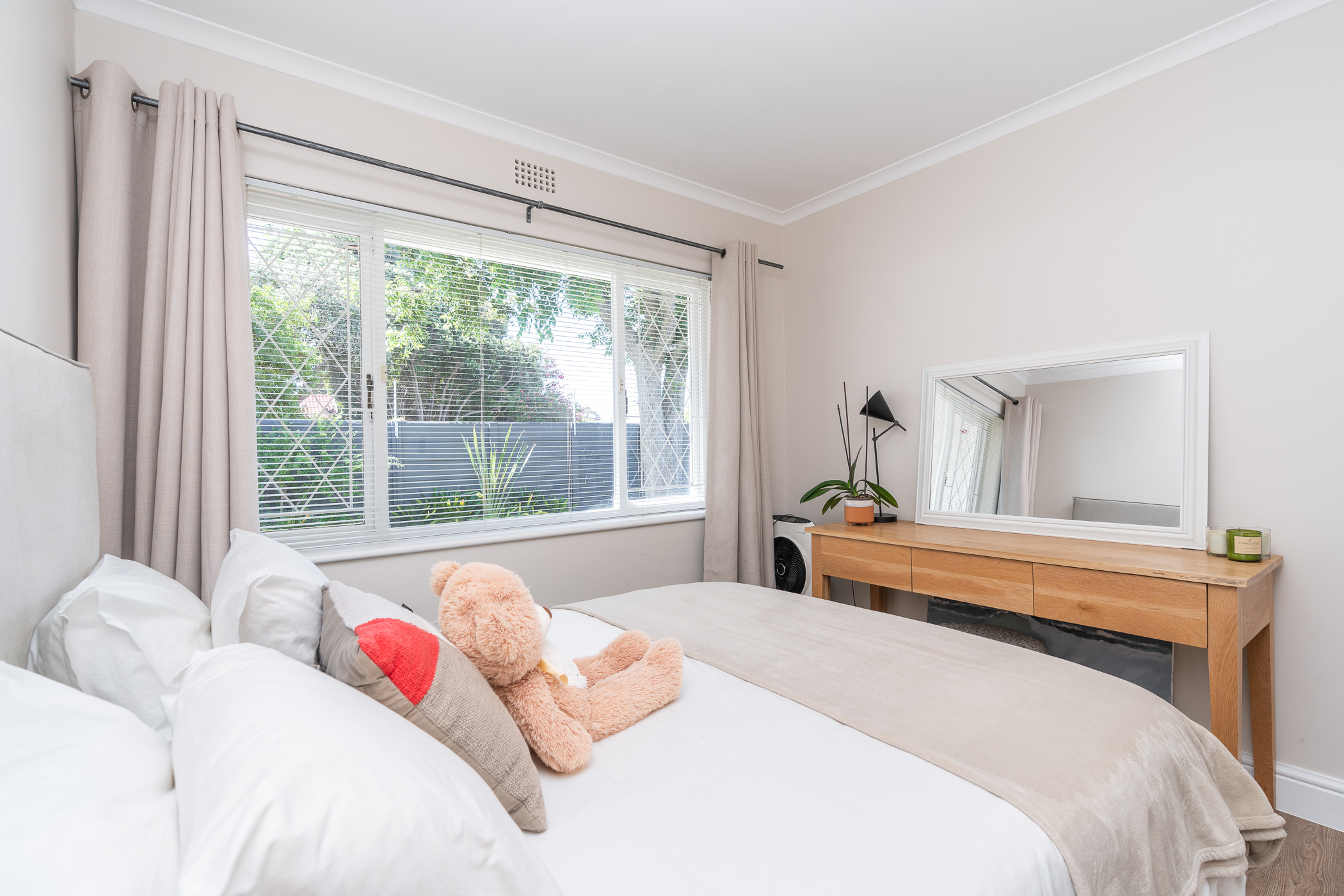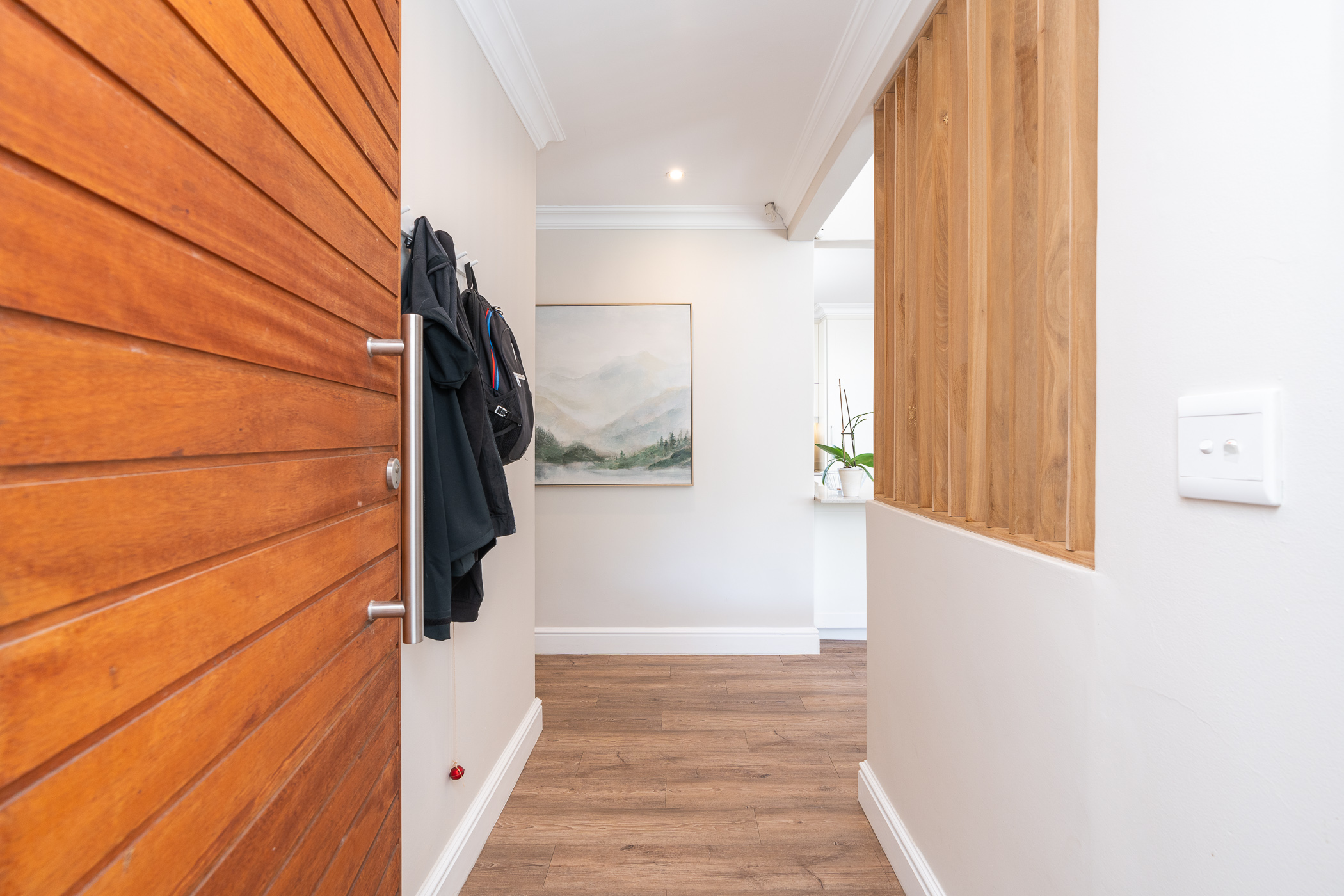 Beautifully laid out, with neutral finishes and tons of natural light! This ultra neat family home is situated in a quiet spot in the very upper reaches of Meadowridge, a short 200m stroll to everyone's favourite 24 hour Woolies/garage on Ladies Mile. The home offers an automated double garage with direct access, plus secure parking for another 3 vehicles in the driveway. An inviting path leads guests along the front of the house to the front door, which opens into a gorgeous double-volume living room (with iron-cast fireplace) and sliding doors onto a wooden deck. The very spacious kitchen is open plan, has plenty of counter and storage space, a large almost walk-in pantry, gas hob, SMEG eye-level oven, prep bowl and separate scullery with space for a dishwasher (washing machine is situated in an extra space in the garage). The kitchen leads left past a fun built-in bar, and into a comfortable, North-facing dining room which could also serve as a playroom or studio.