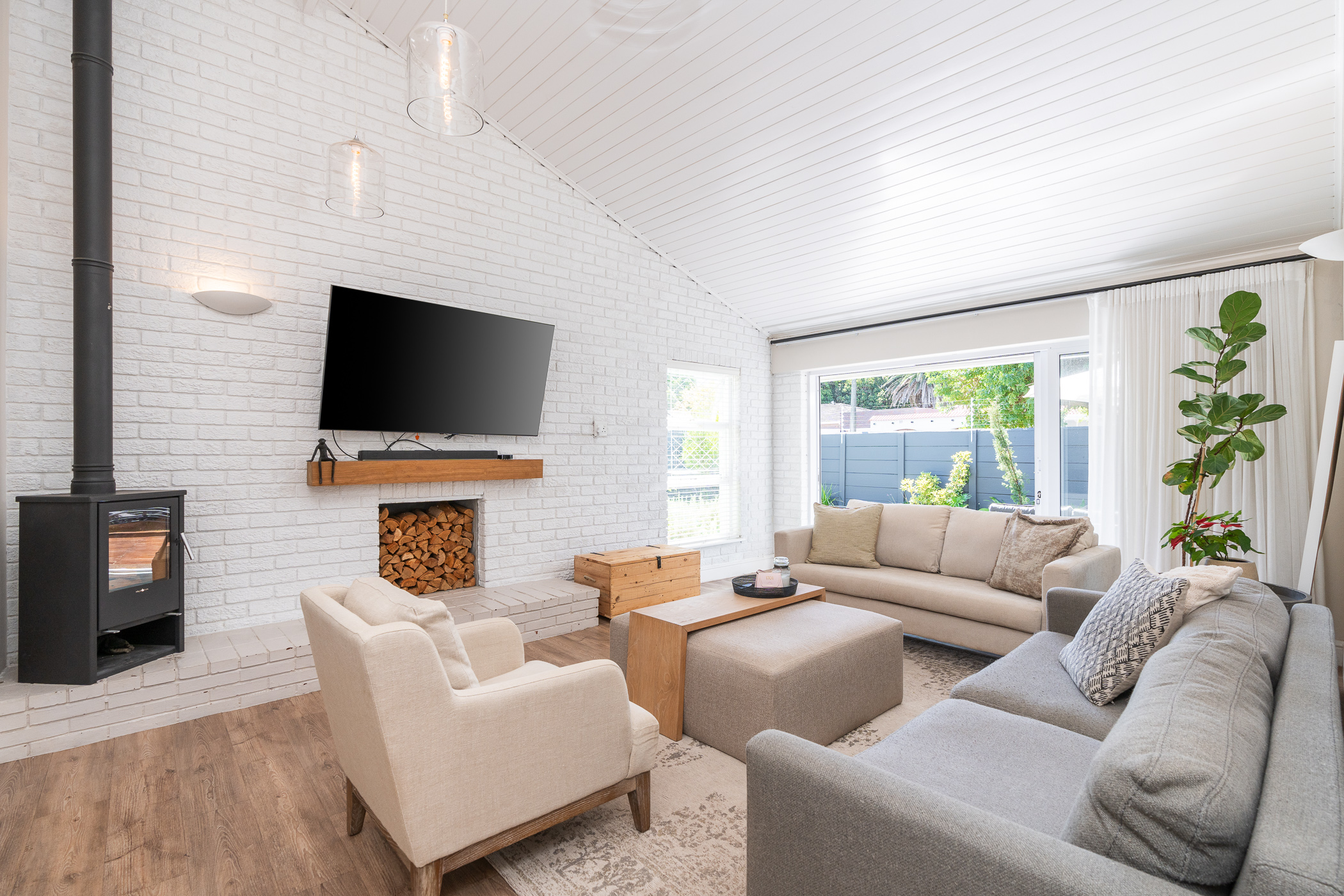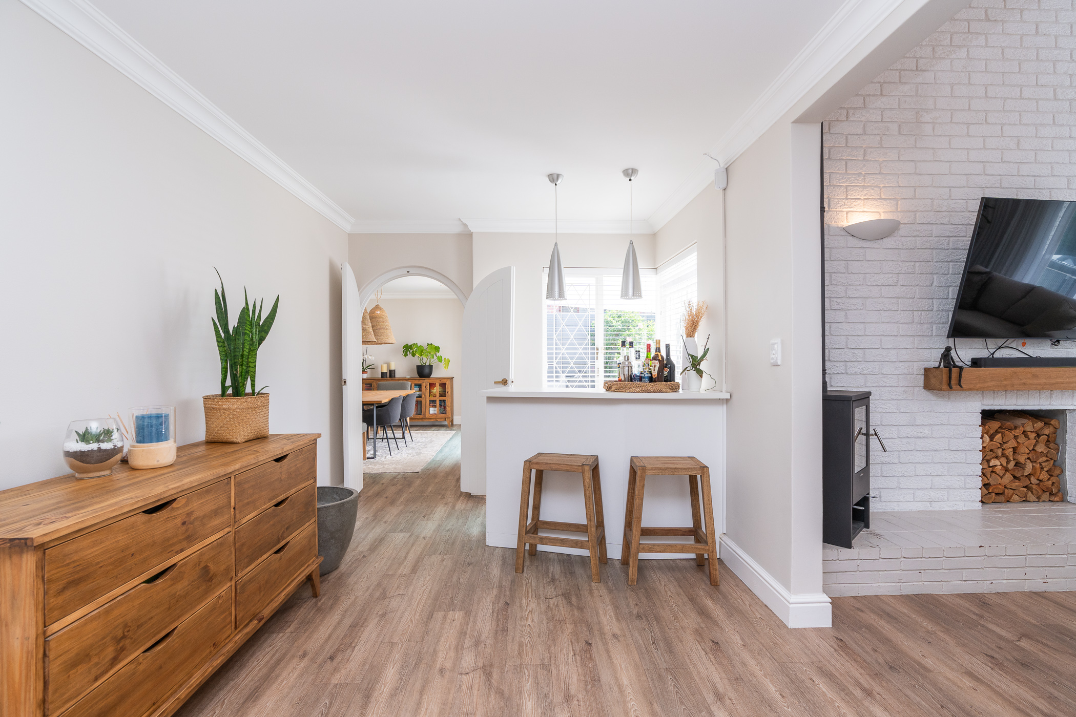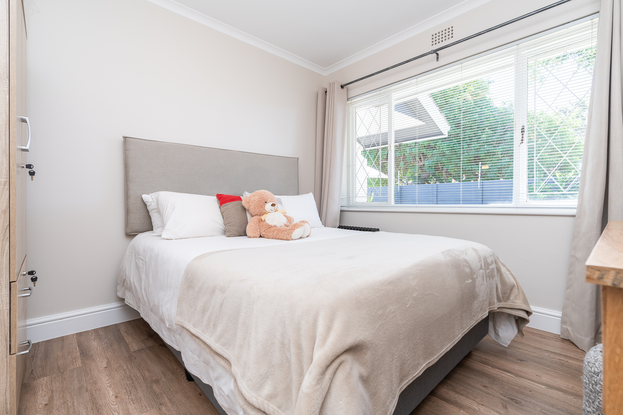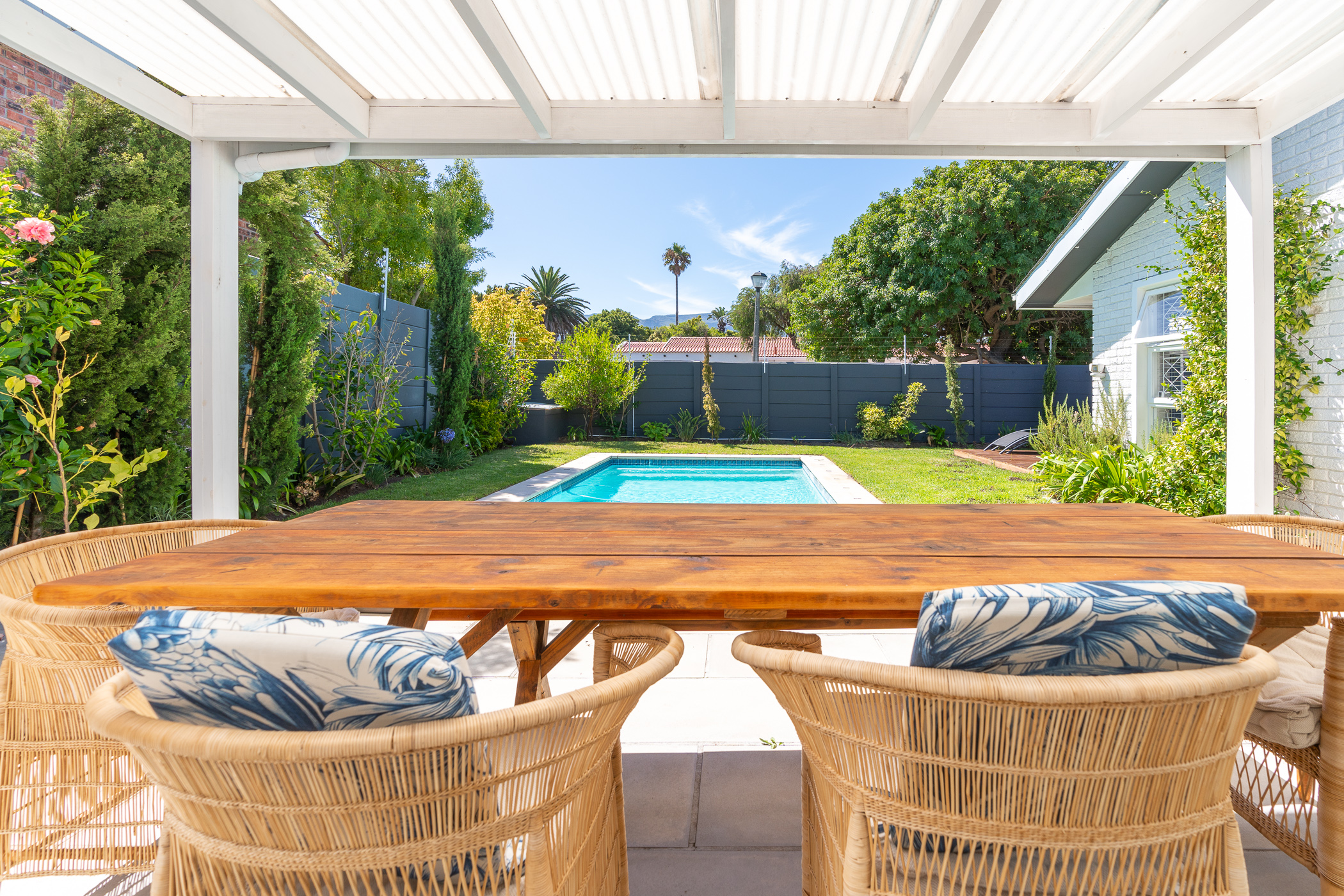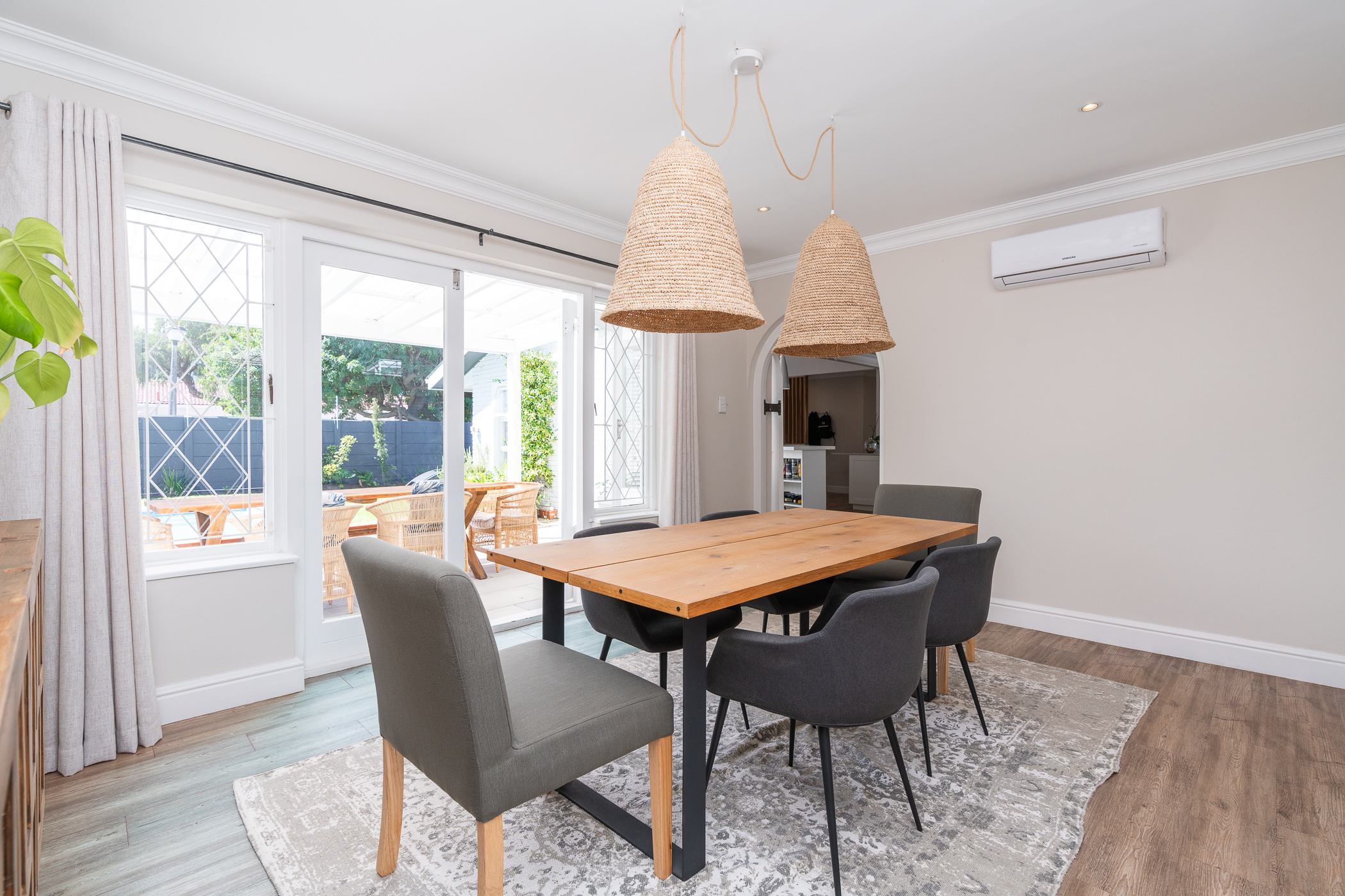 Beautifully laid out, with neutral finishes and tons of natural light! This ultra neat family home is situated in a quiet spot in the very upper reaches of Meadowridge, a short 200m stroll to everyone's favourite 24 hour Woolies/garage on Ladies Mile. The home offers an automated double garage with direct access, plus secure parking for another 3 vehicles in the driveway. An inviting path leads guests along the front of the house to the front door, which opens into a gorgeous double-volume living room (with iron-cast fireplace) and sliding doors onto a wooden deck. The very spacious kitchen is open plan, has plenty of counter and storage space, a large almost walk-in pantry, gas hob, SMEG eye-level oven, prep bowl and separate scullery with space for a dishwasher (washing machine is situated in an extra space in the garage). The kitchen leads left past a fun built-in bar, and into a comfortable, North-facing dining room which could also serve as a playroom or studio.