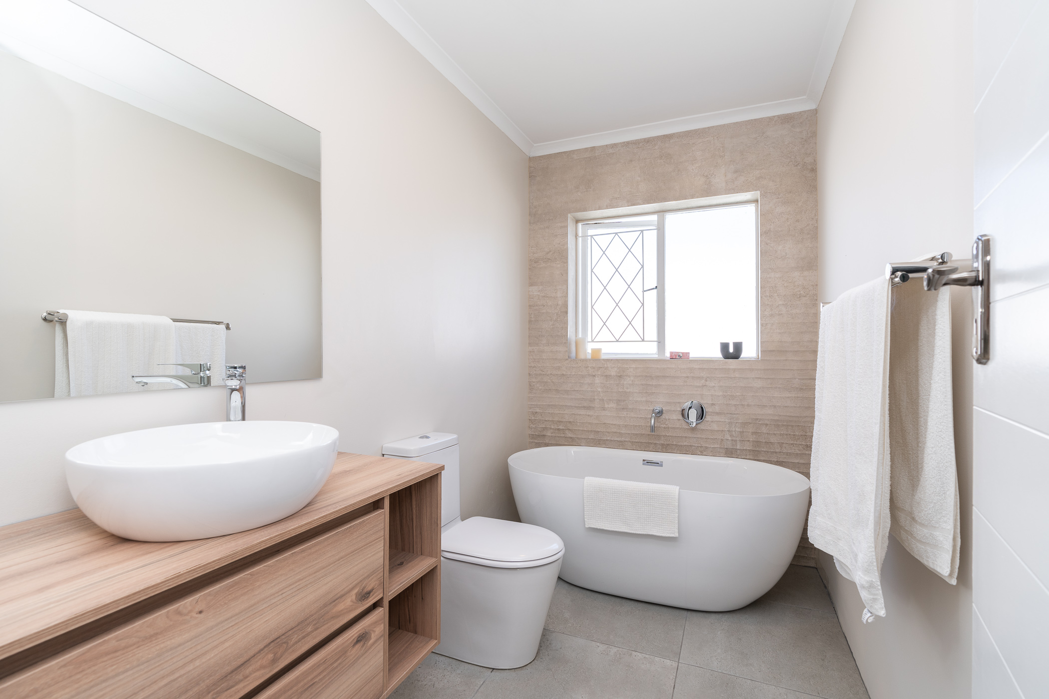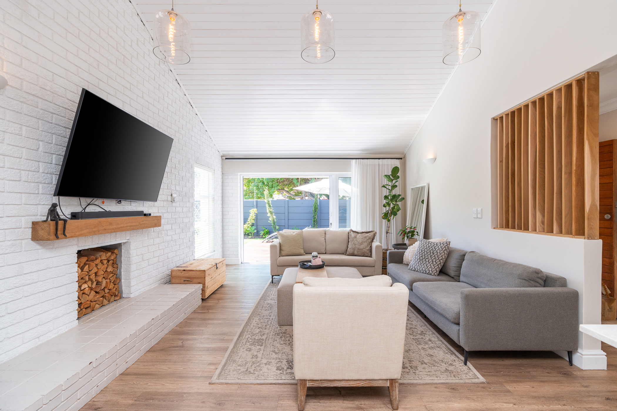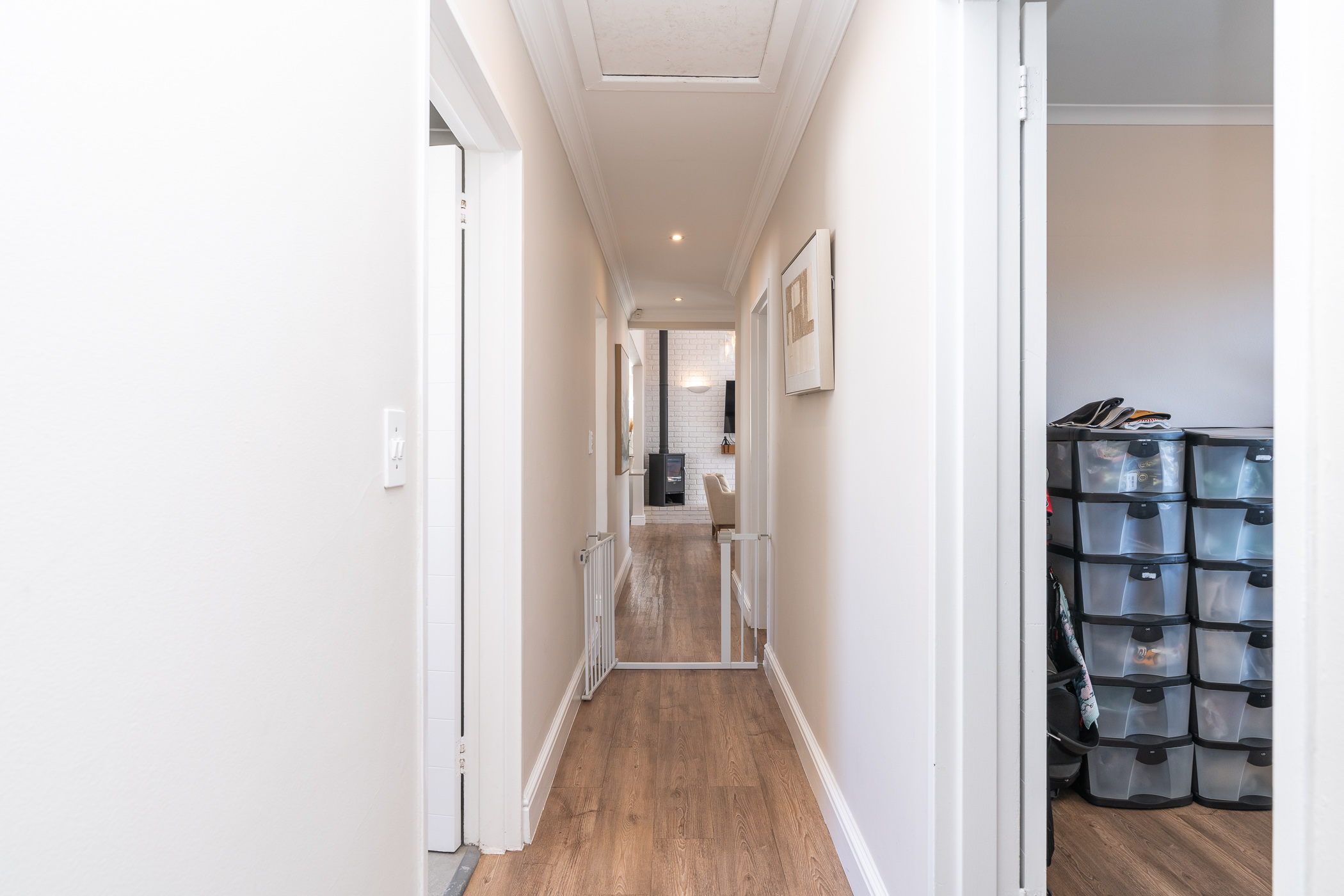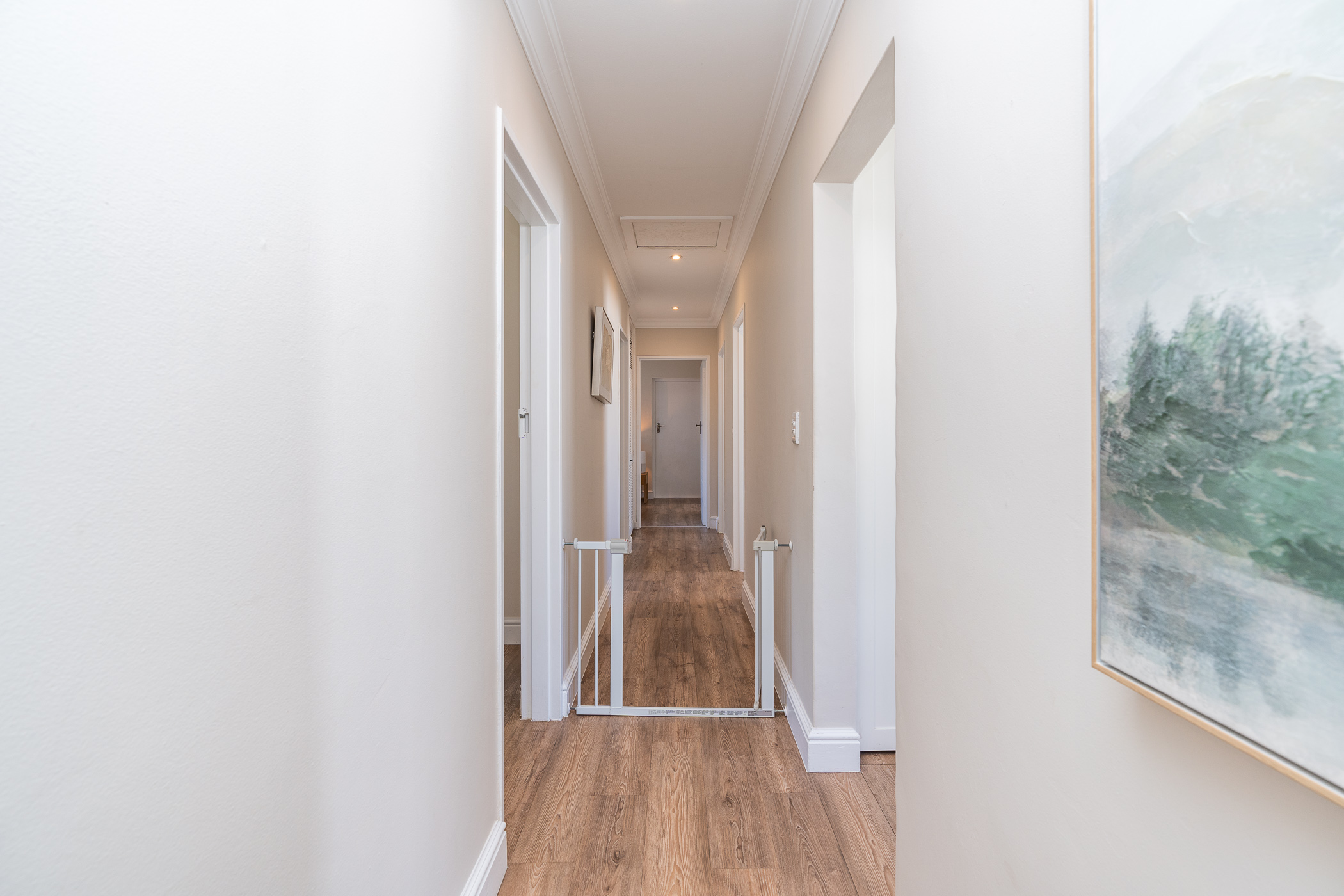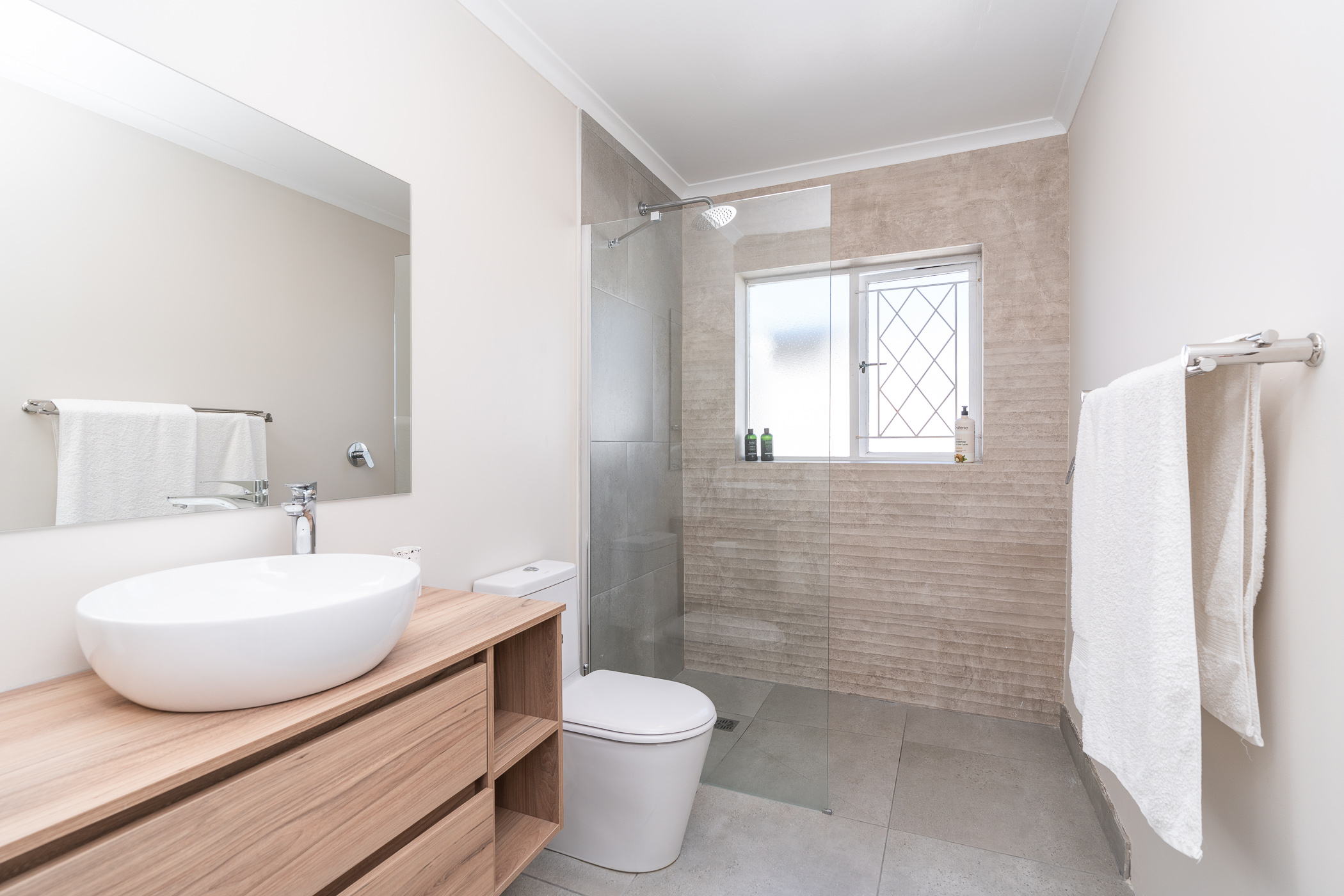 Beautifully laid out, with neutral finishes and tons of natural light! This ultra neat family home is situated in a quiet spot in the very upper reaches of Meadowridge, a short 200m stroll to everyone's favourite 24 hour Woolies/garage on Ladies Mile. The home offers an automated double garage with direct access, plus secure parking for another 3 vehicles in the driveway. An inviting path leads guests along the front of the house to the front door, which opens into a gorgeous double-volume living room (with iron-cast fireplace) and sliding doors onto a wooden deck. The very spacious kitchen is open plan, has plenty of counter and storage space, a large almost walk-in pantry, gas hob, SMEG eye-level oven, prep bowl and separate scullery with space for a dishwasher (washing machine is situated in an extra space in the garage). The kitchen leads left past a fun built-in bar, and into a comfortable, North-facing dining room which could also serve as a playroom or studio.