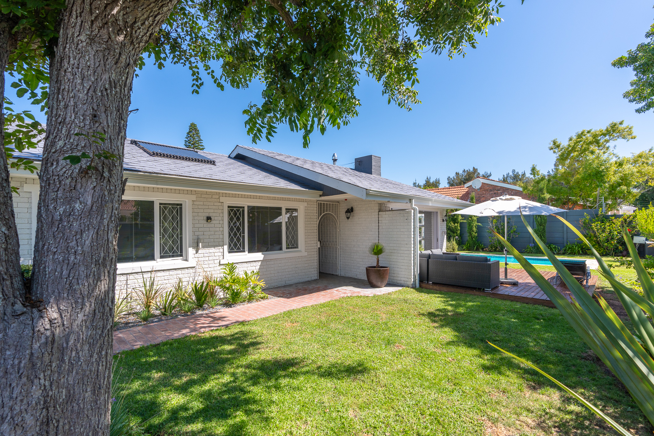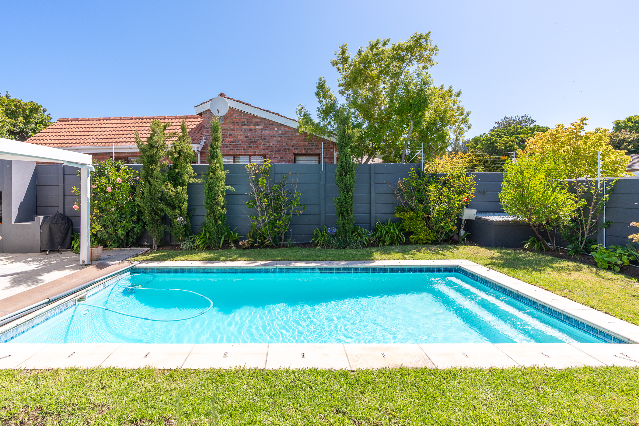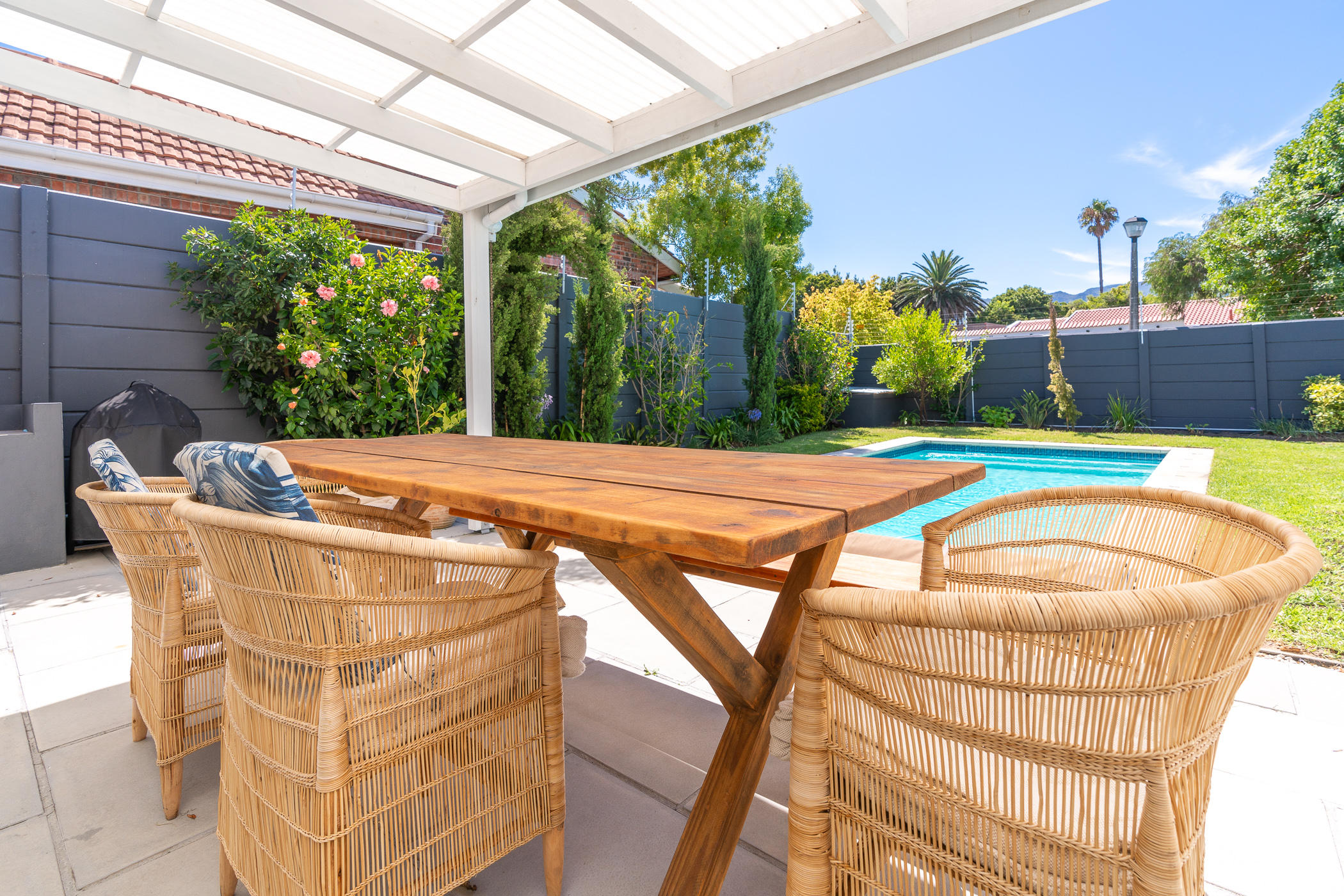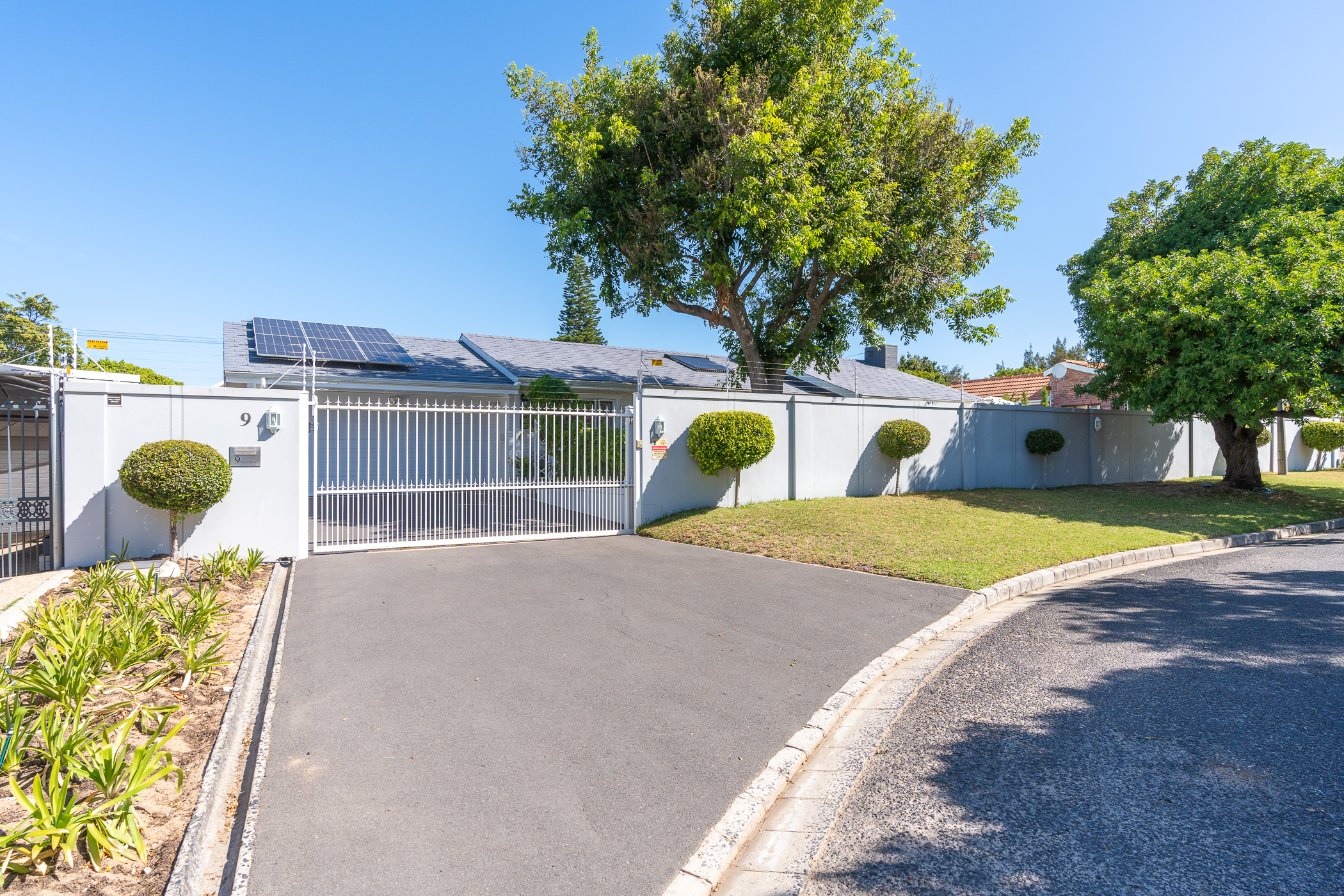The bedroom wing comprises of 3 bedrooms (all North-facing), a study, family bathroom with freestanding designer tub and shower, and a main ensuite with large walk-in shower. Vinyl flooring throughout and fitted blinds on most windows. Bonus features include 3 aircons (main bedroom, study, dining room), a 5kW inverter, 6 solar panels, 10kW batteries, solar geyser, an outside toilet and shower, Wendy house, 40m borehole, full irrigation, and excellent security all round.