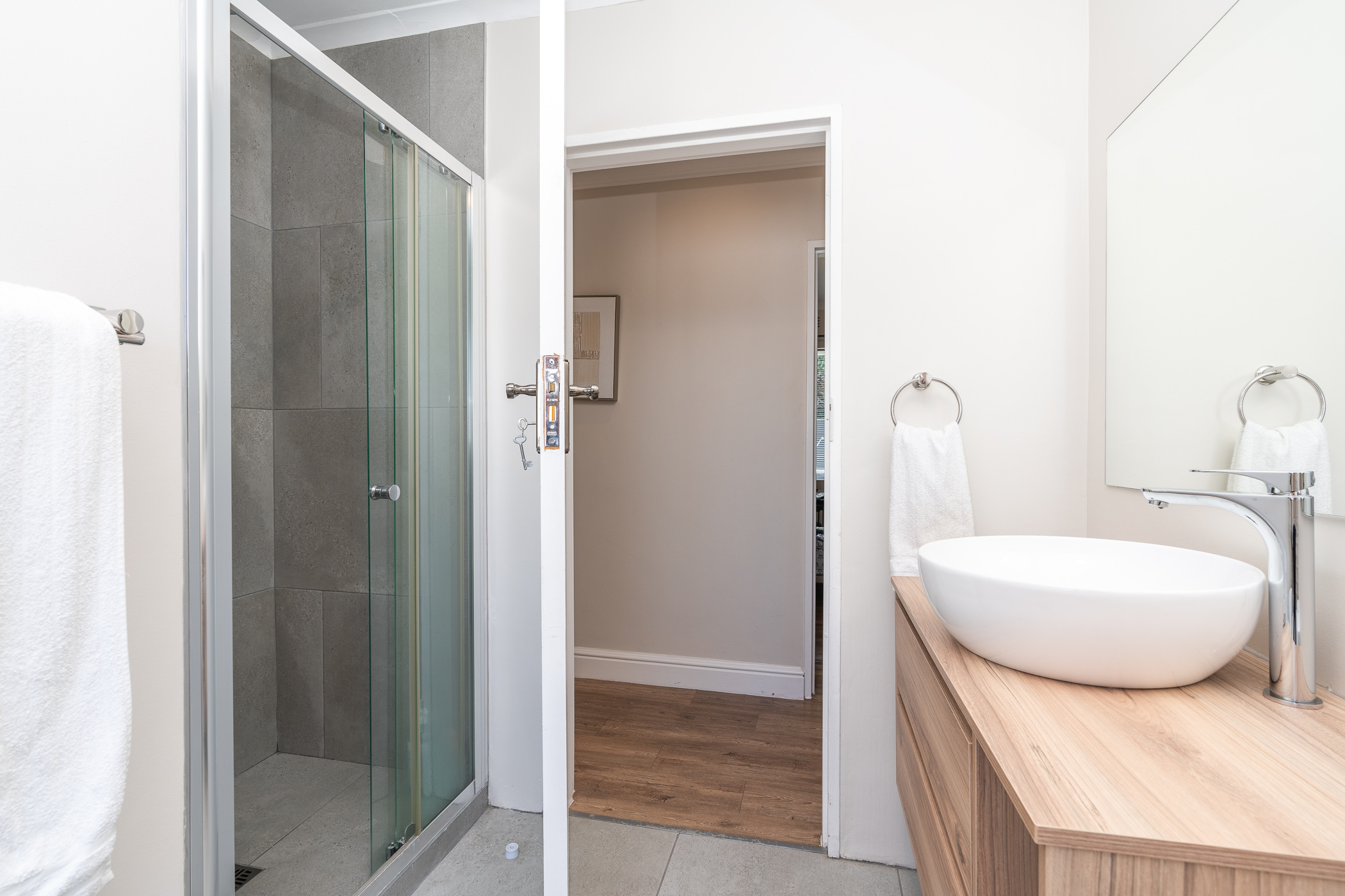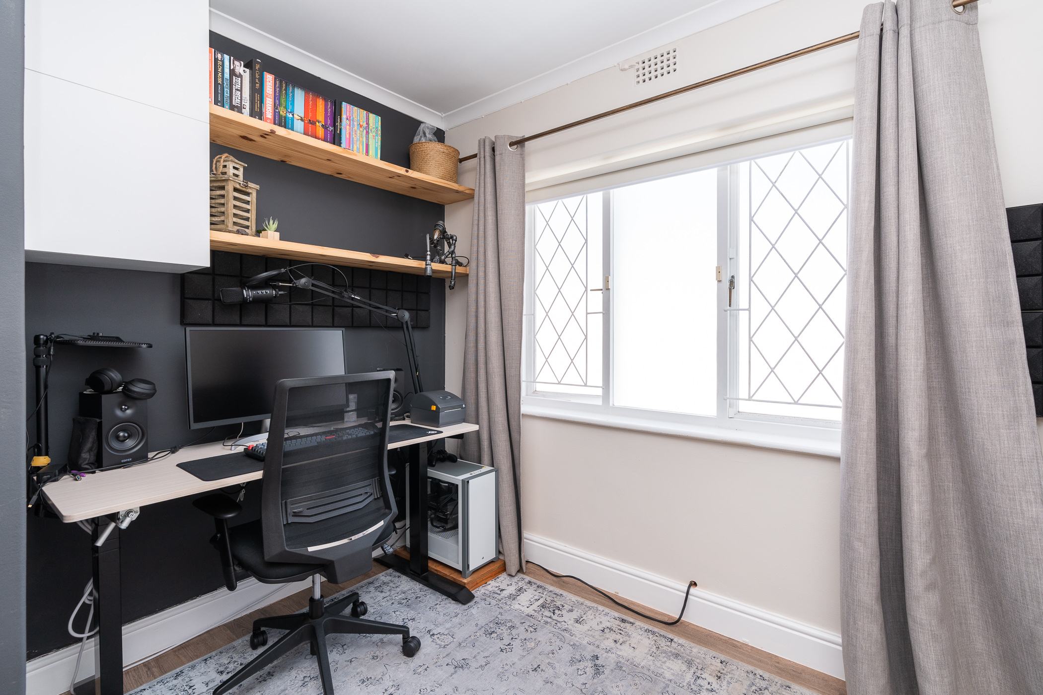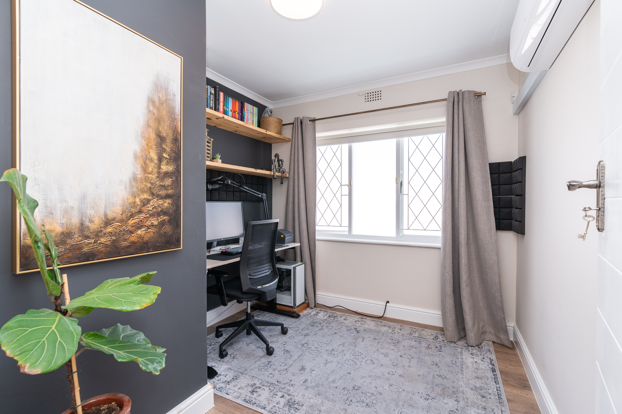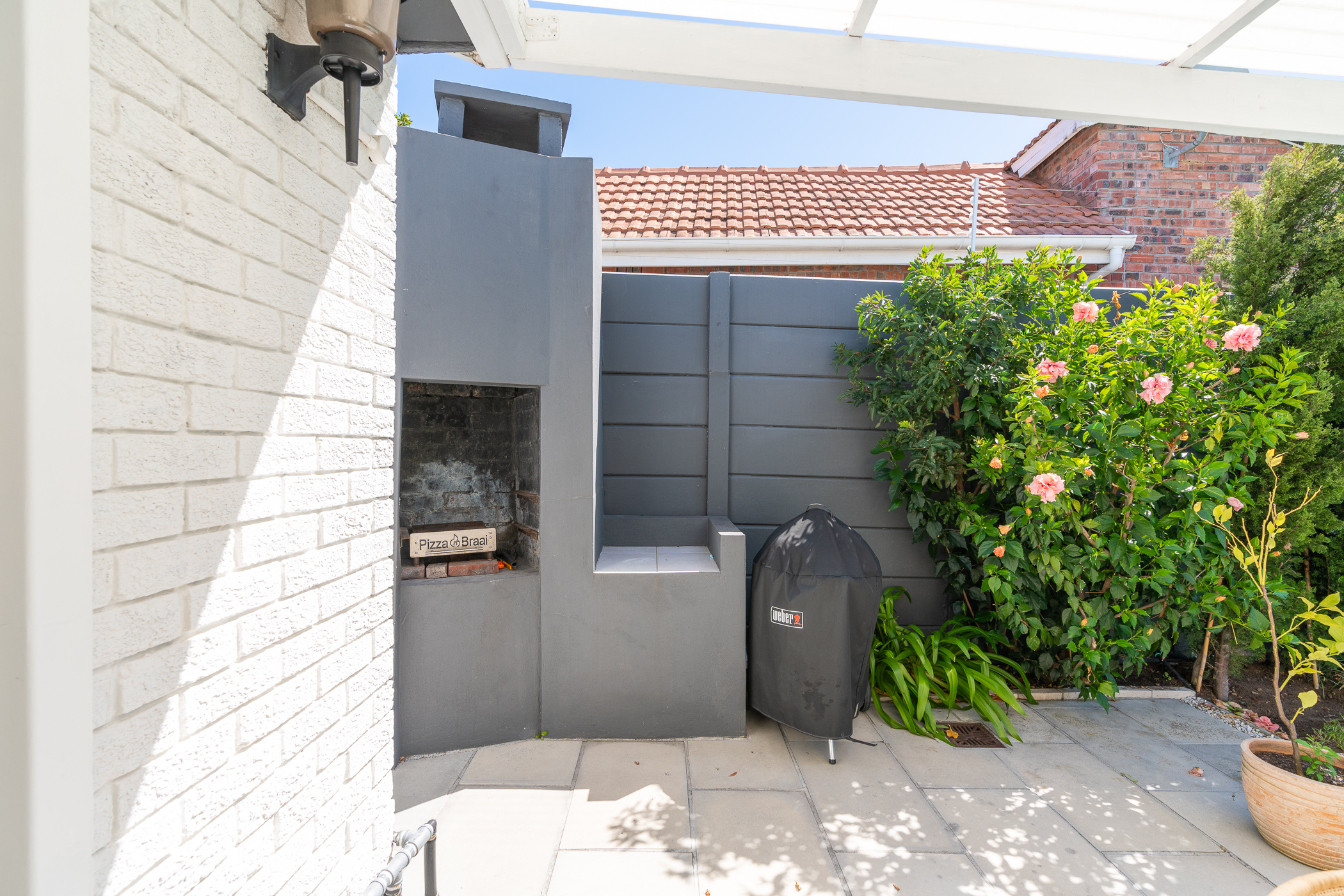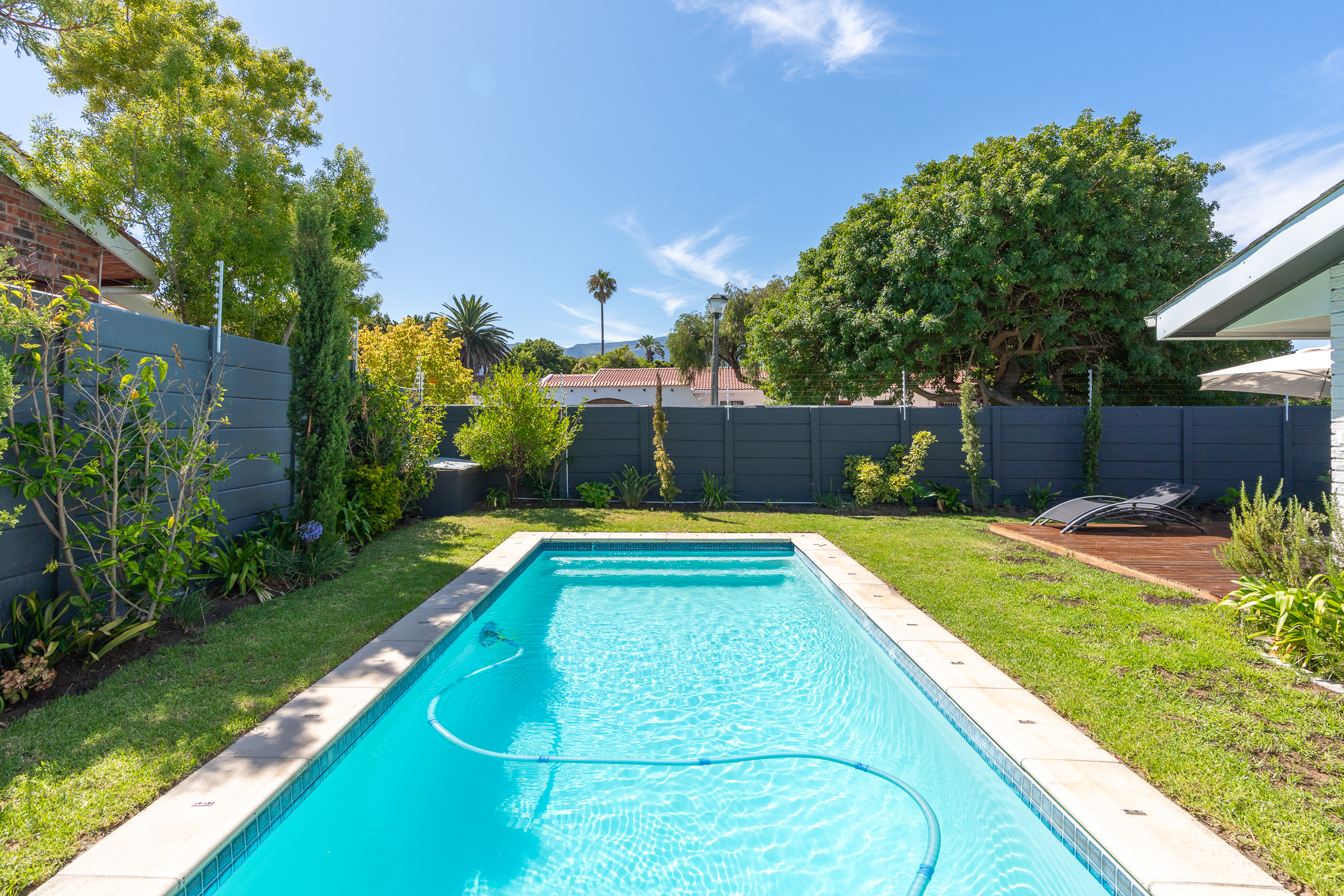 The bedroom wing comprises of 3 bedrooms (all North-facing), a study, family bathroom with freestanding designer tub and shower, and a main ensuite with large walk-in shower. Vinyl flooring throughout and fitted blinds on most windows. Bonus features include 3 aircons (main bedroom, study, dining room), a 5kW inverter, 6 solar panels, 10kW batteries, solar geyser, an outside toilet and shower, Wendy house, 40m borehole, full irrigation, and excellent security all round.