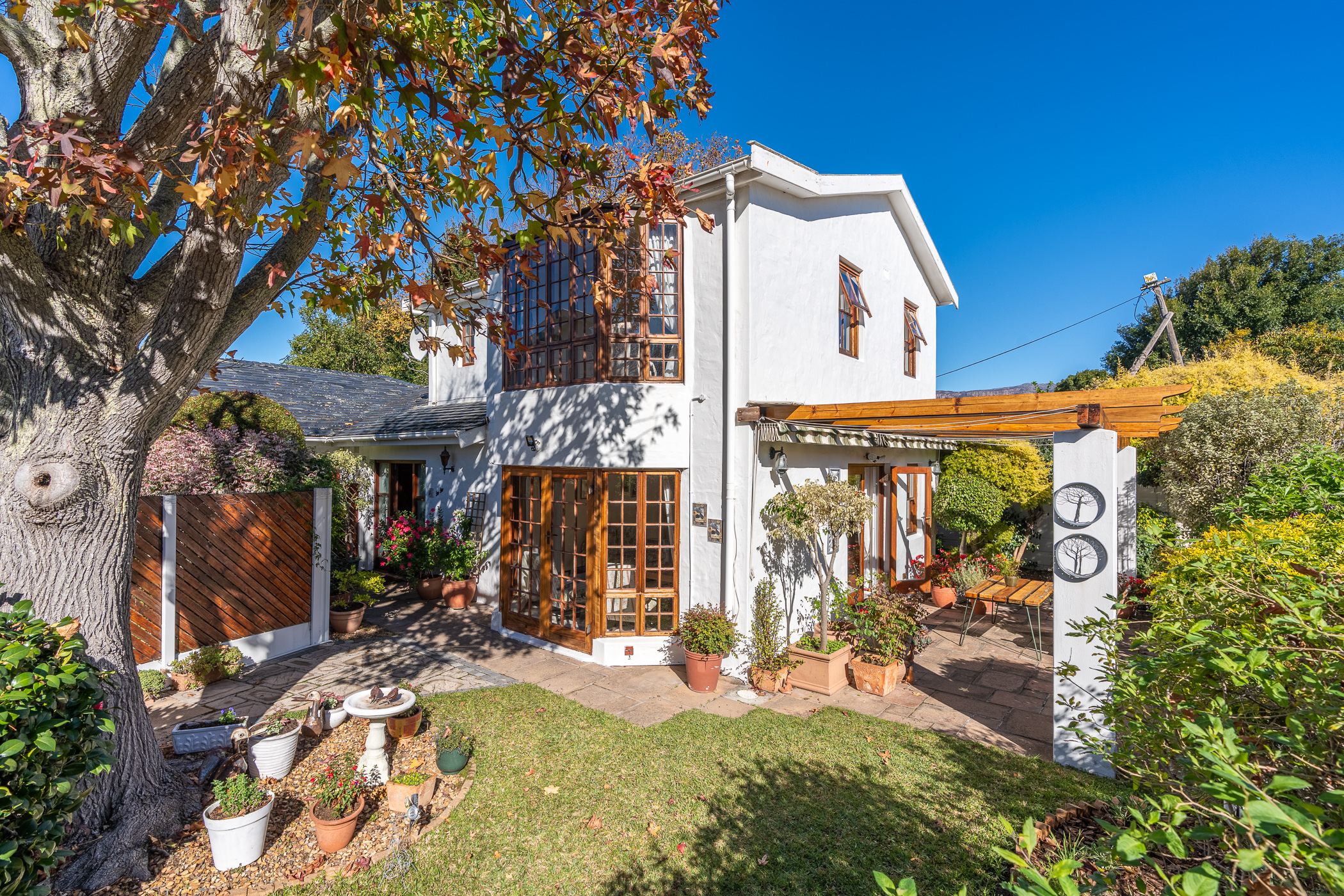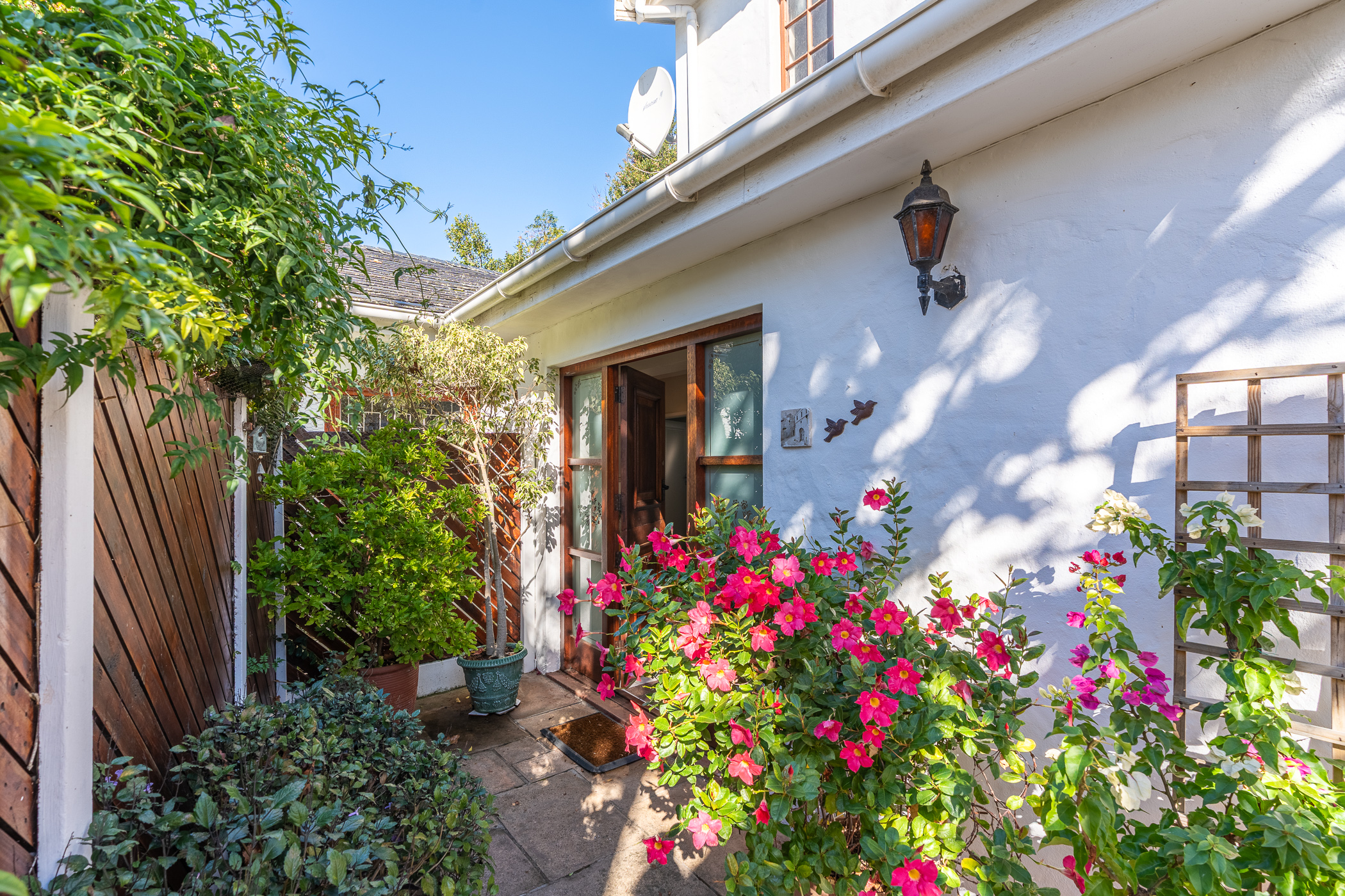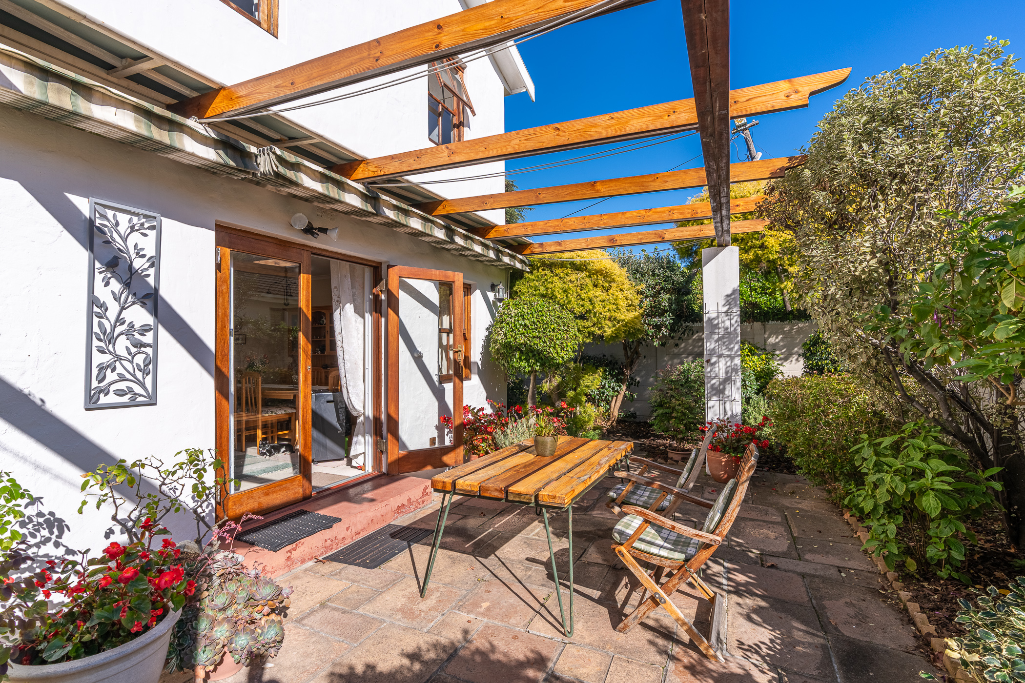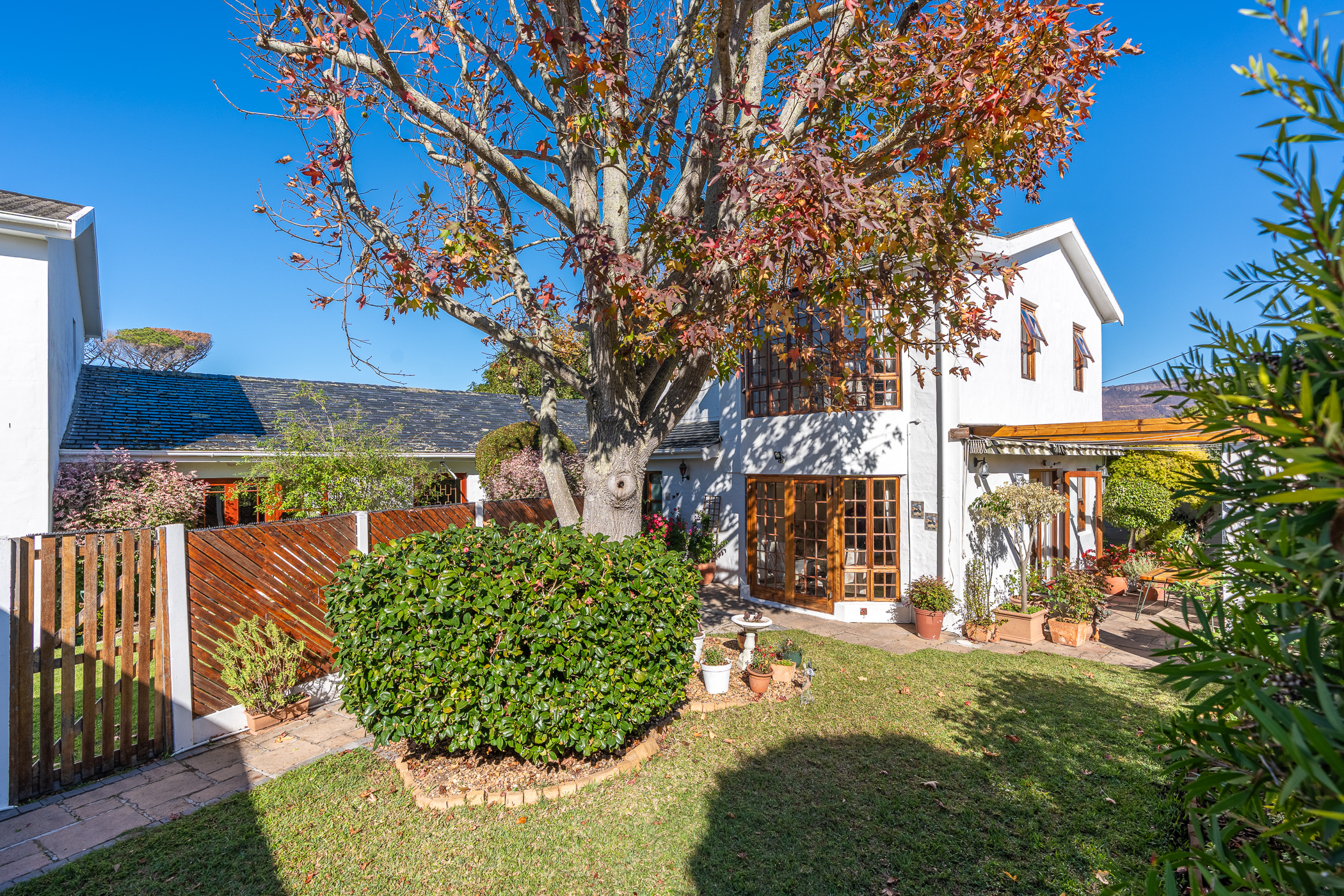 The ambiance in this pocket is elegant and upmarket with deep pavements, tall Stone Pine trees and the beautiful silhouette of Constantiaberg mountains on the horizon. A welcoming brick-paved driveway leads to a wrought iron sliding gate and automated double Garage. A pedestrian gate opens to a pathway along a wooden diagonal-slatted side wall and leads to a gorgeous private garden with a mature Pin Oak tree taking pride of place – a peaceful oasis of lush greenery and splashes of colour.