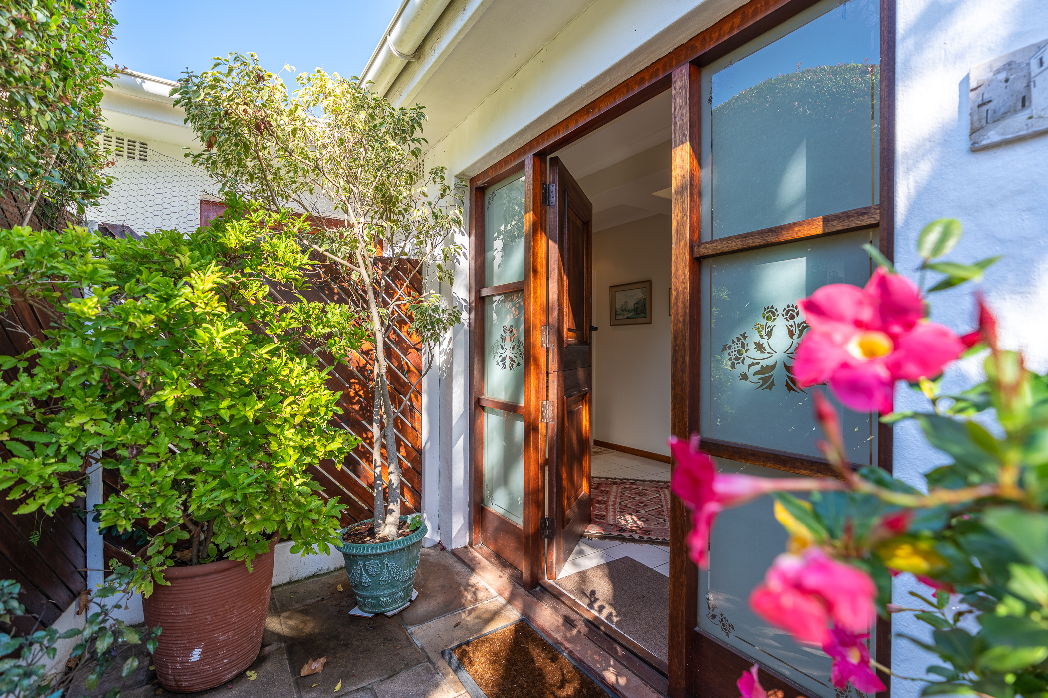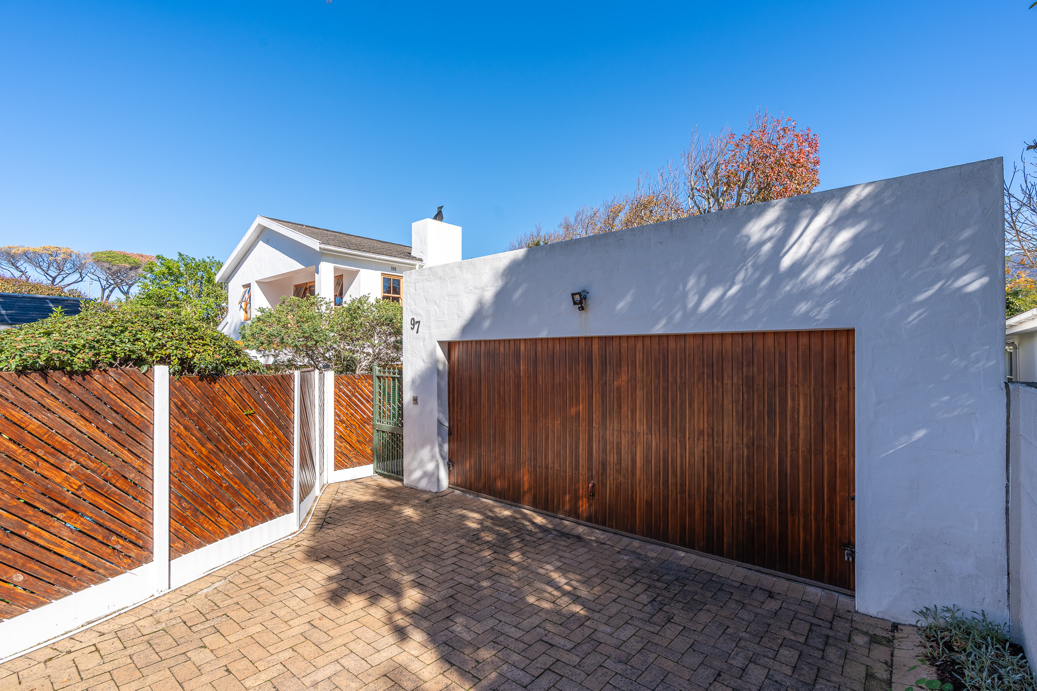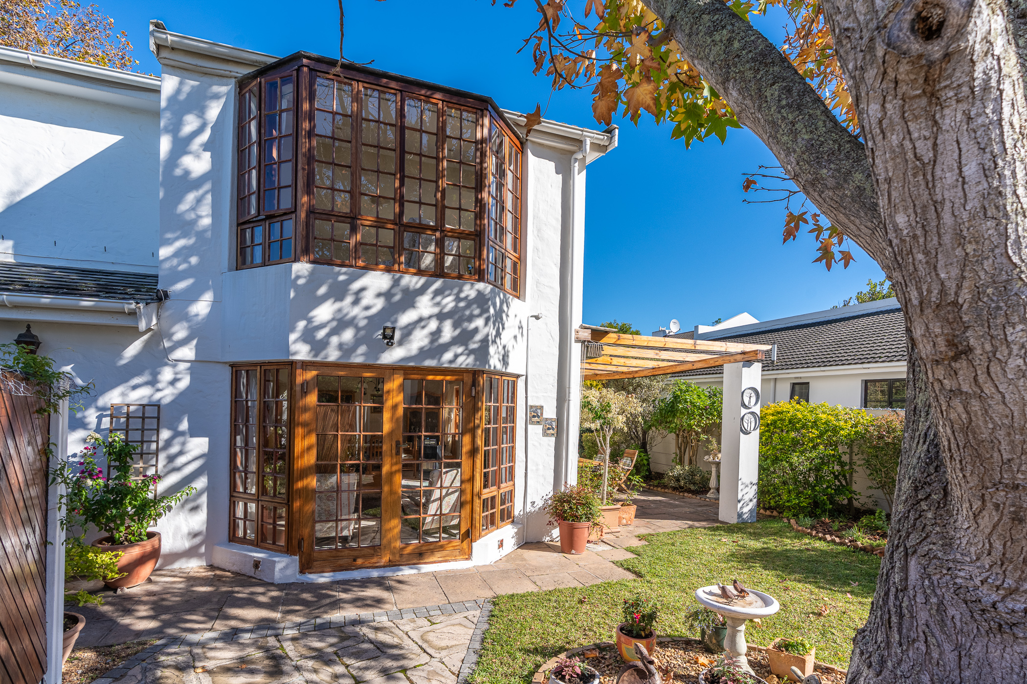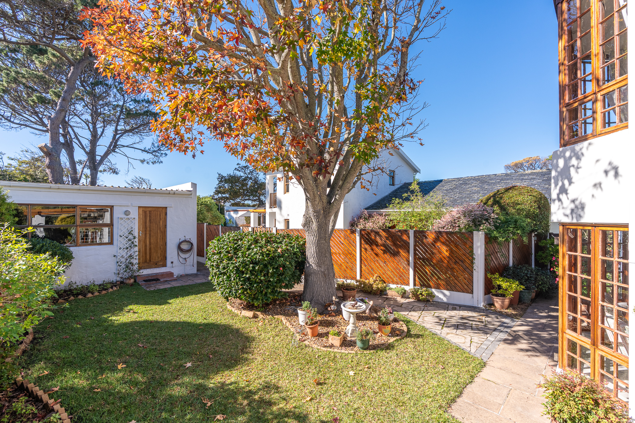 The ambiance in this pocket is elegant and upmarket with deep pavements, tall Stone Pine trees and the beautiful silhouette of Constantiaberg mountains on the horizon. A welcoming brick-paved driveway leads to a wrought iron sliding gate and automated double Garage. A pedestrian gate opens to a pathway along a wooden diagonal-slatted side wall and leads to a gorgeous private garden with a mature Pin Oak tree taking pride of place – a peaceful oasis of lush greenery and splashes of colour.