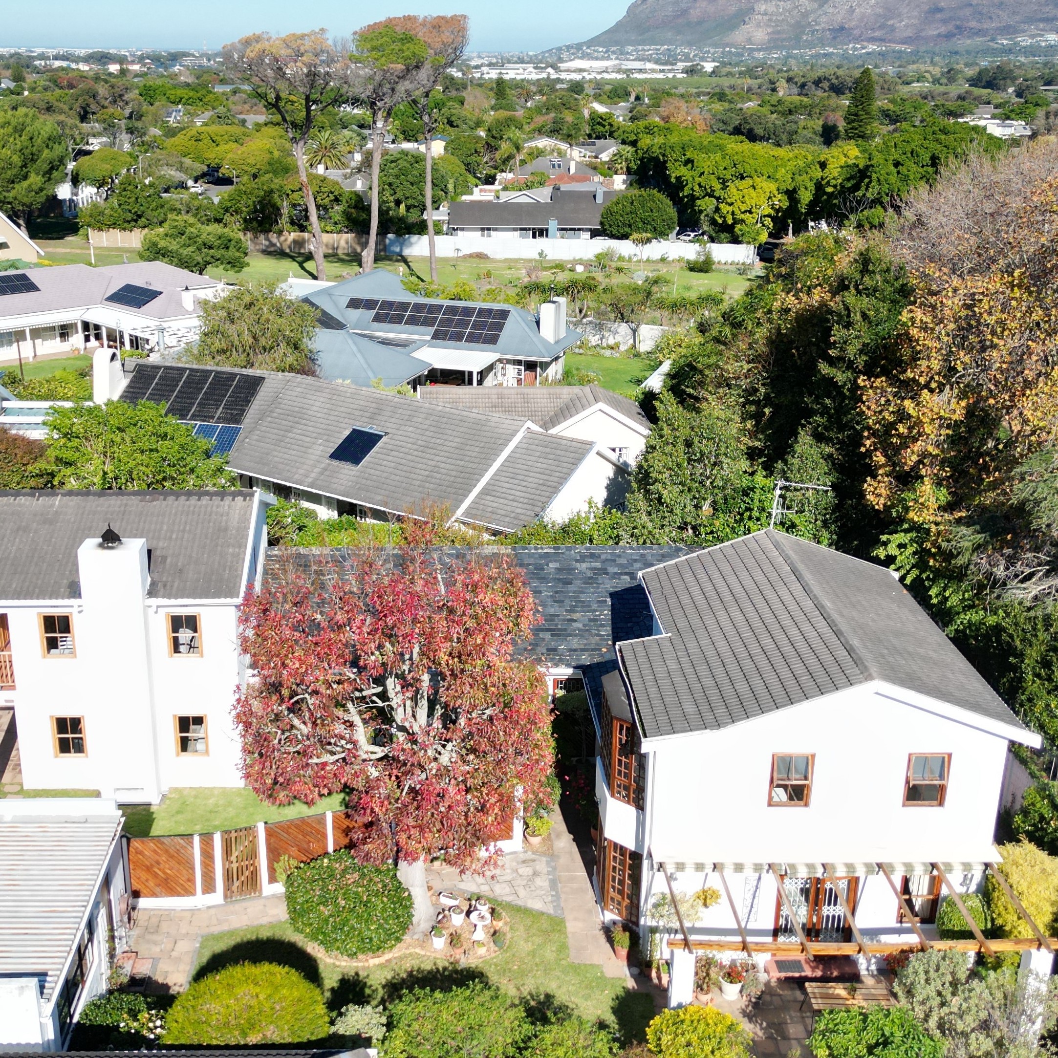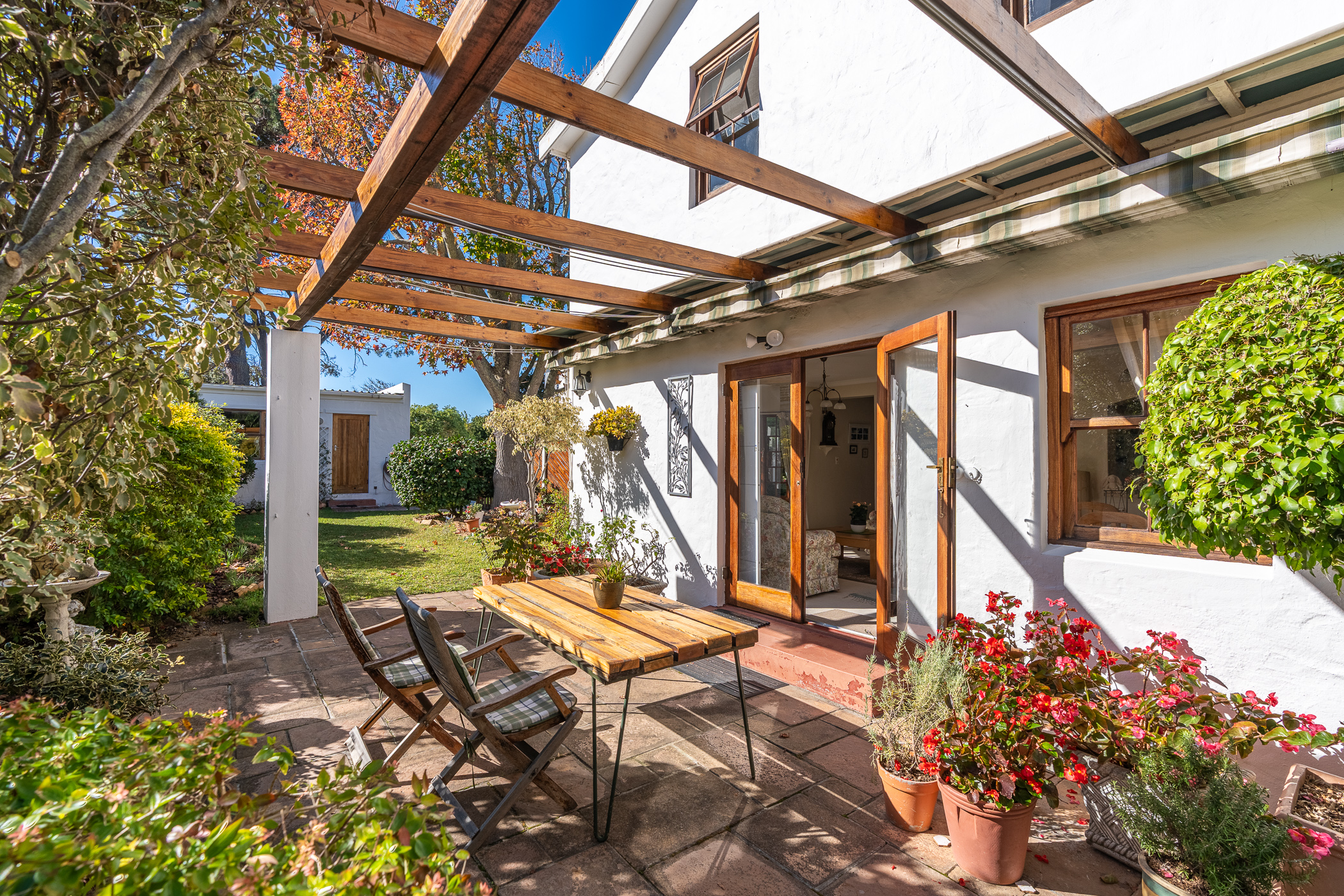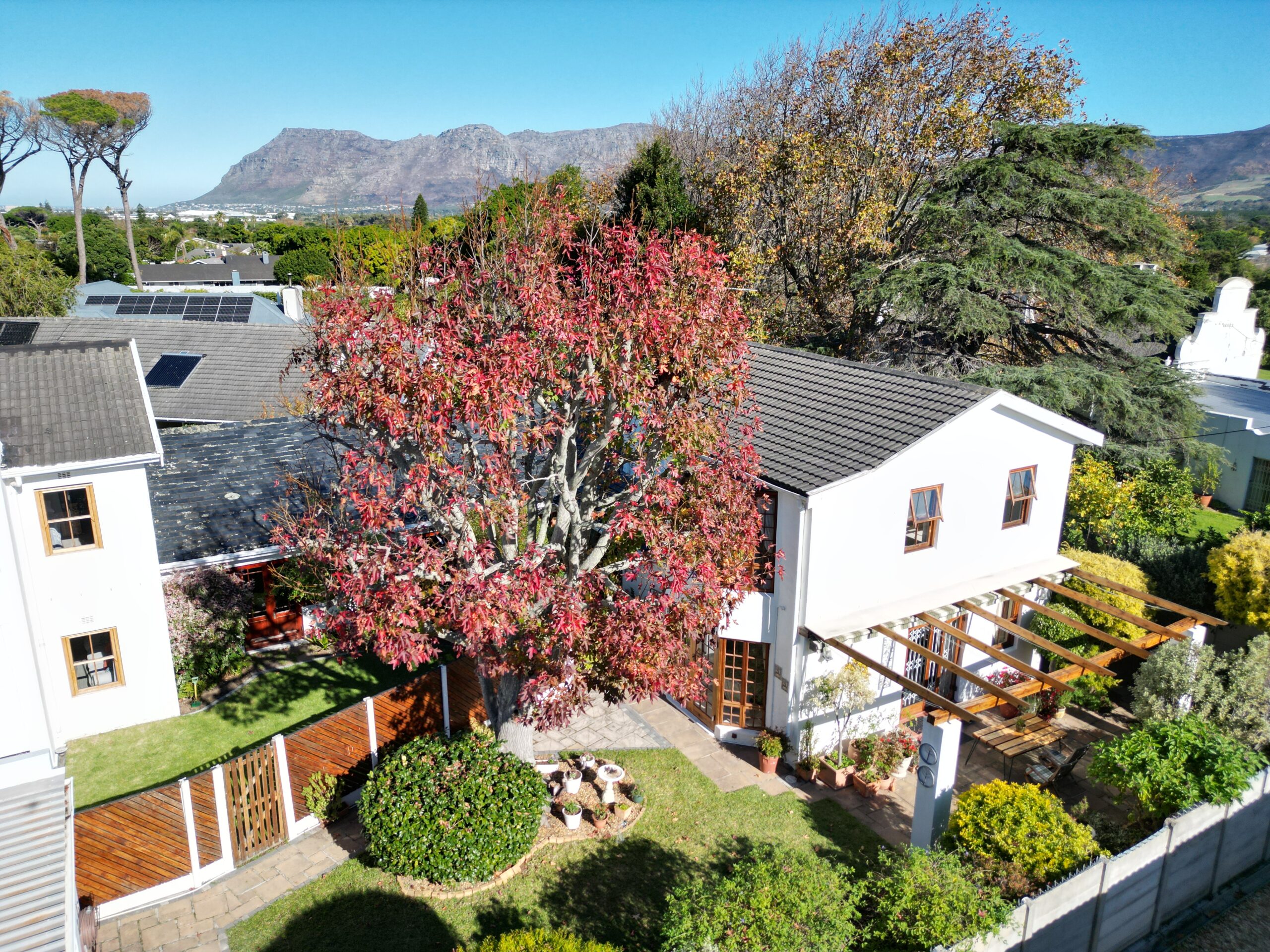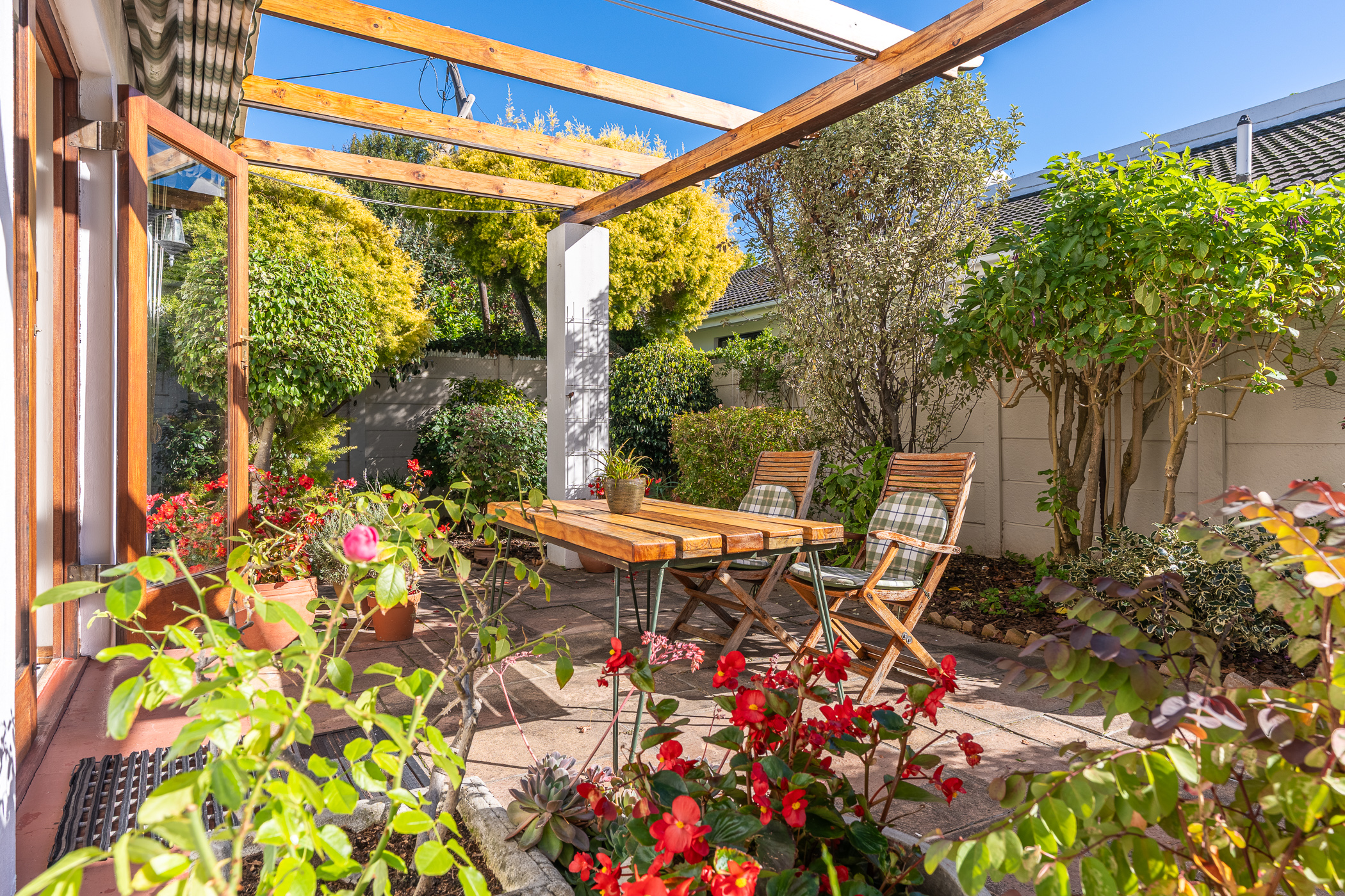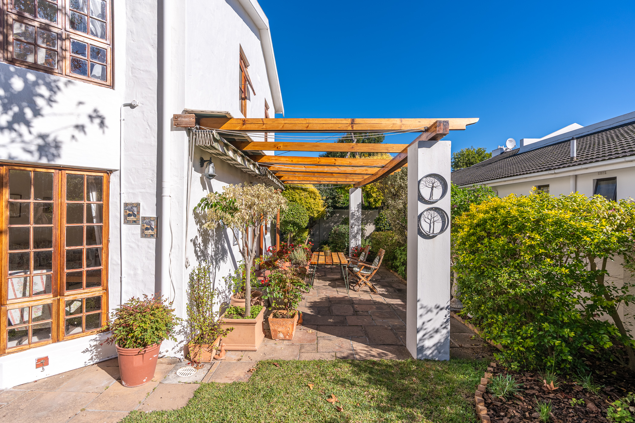 The ambiance in this pocket is elegant and upmarket with deep pavements, tall Stone Pine trees and the beautiful silhouette of Constantiaberg mountains on the horizon. A welcoming brick-paved driveway leads to a wrought iron sliding gate and automated double Garage. A pedestrian gate opens to a pathway along a wooden diagonal-slatted side wall and leads to a gorgeous private garden with a mature Pin Oak tree taking pride of place – a peaceful oasis of lush greenery and splashes of colour.