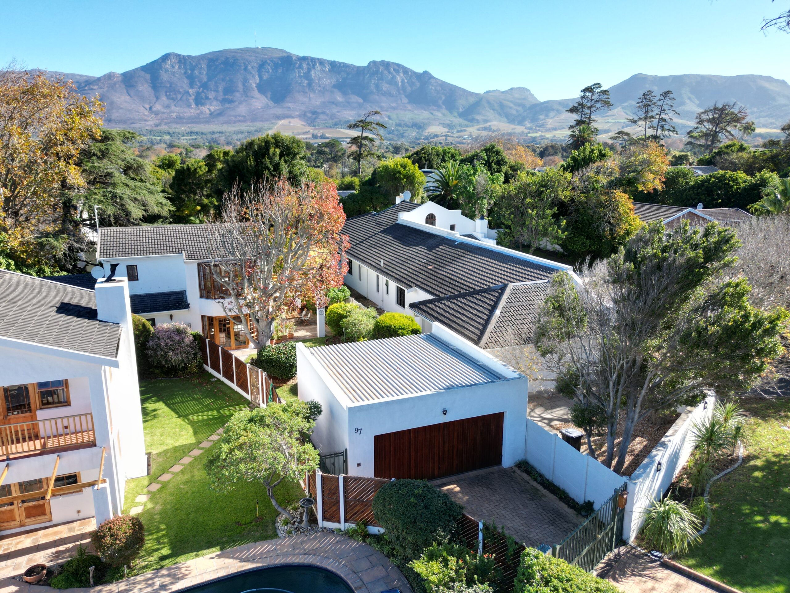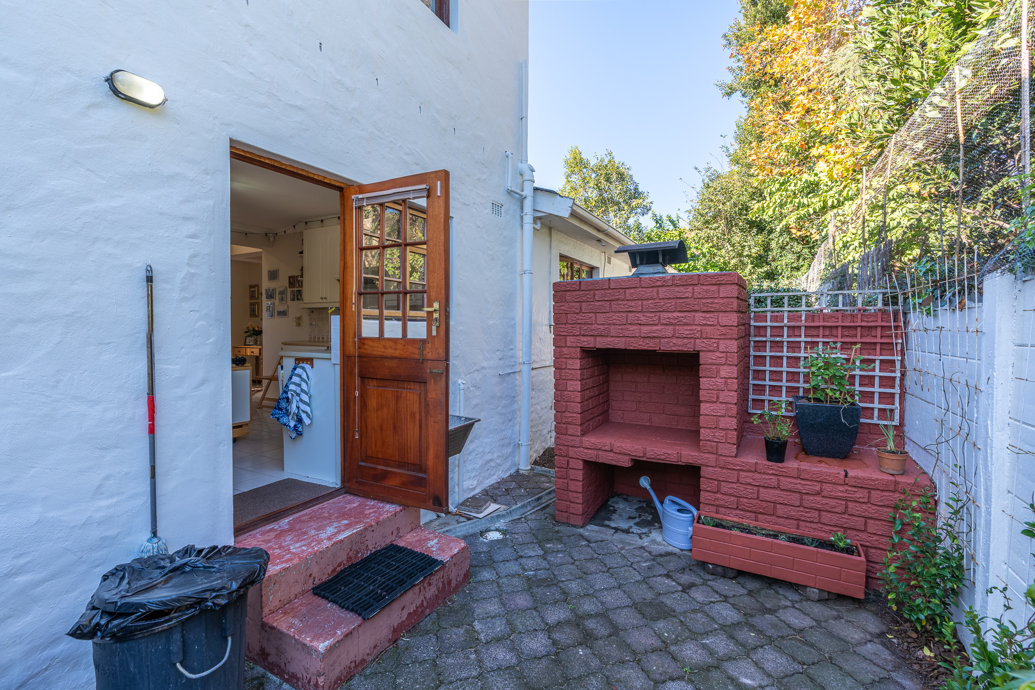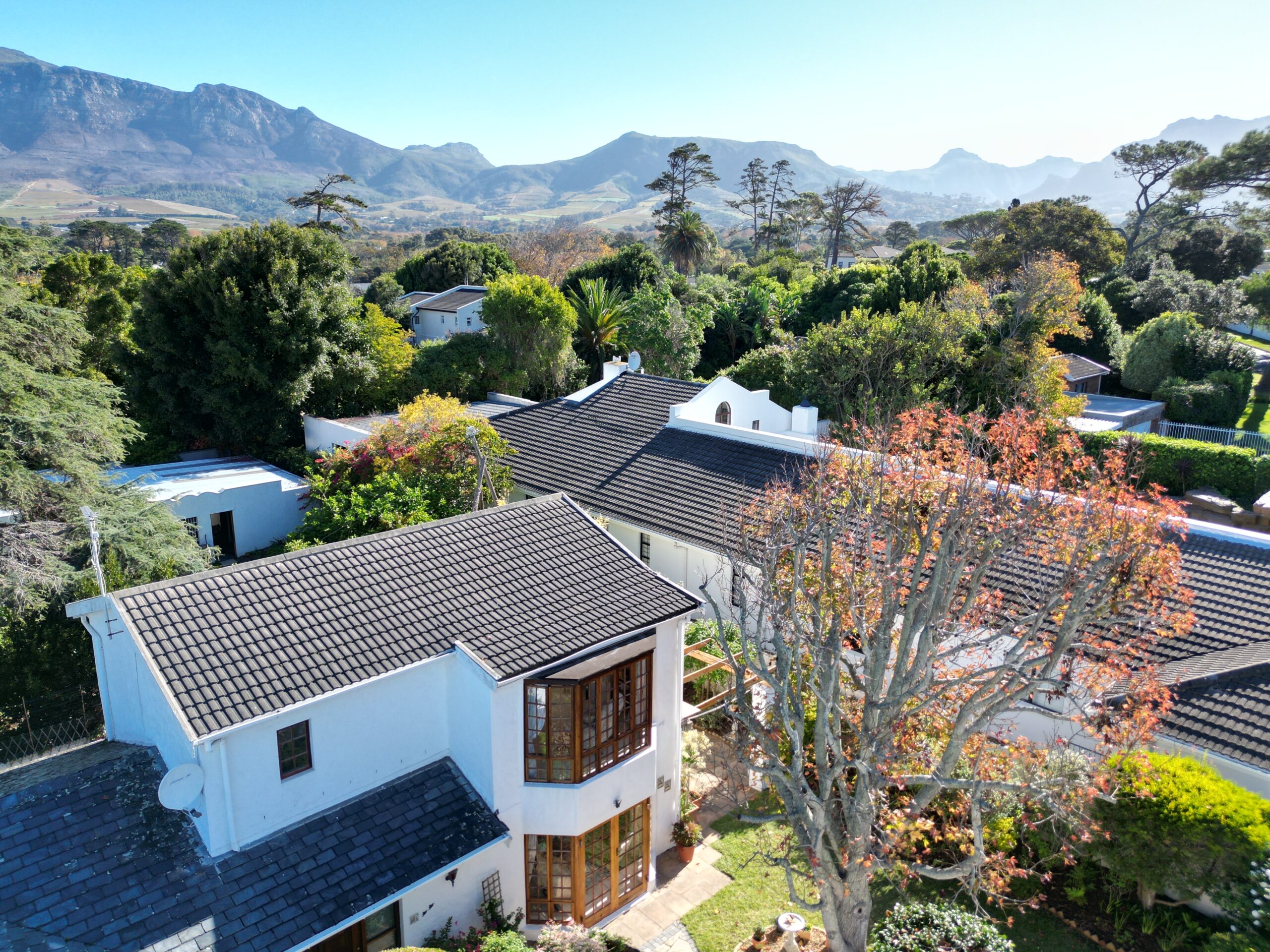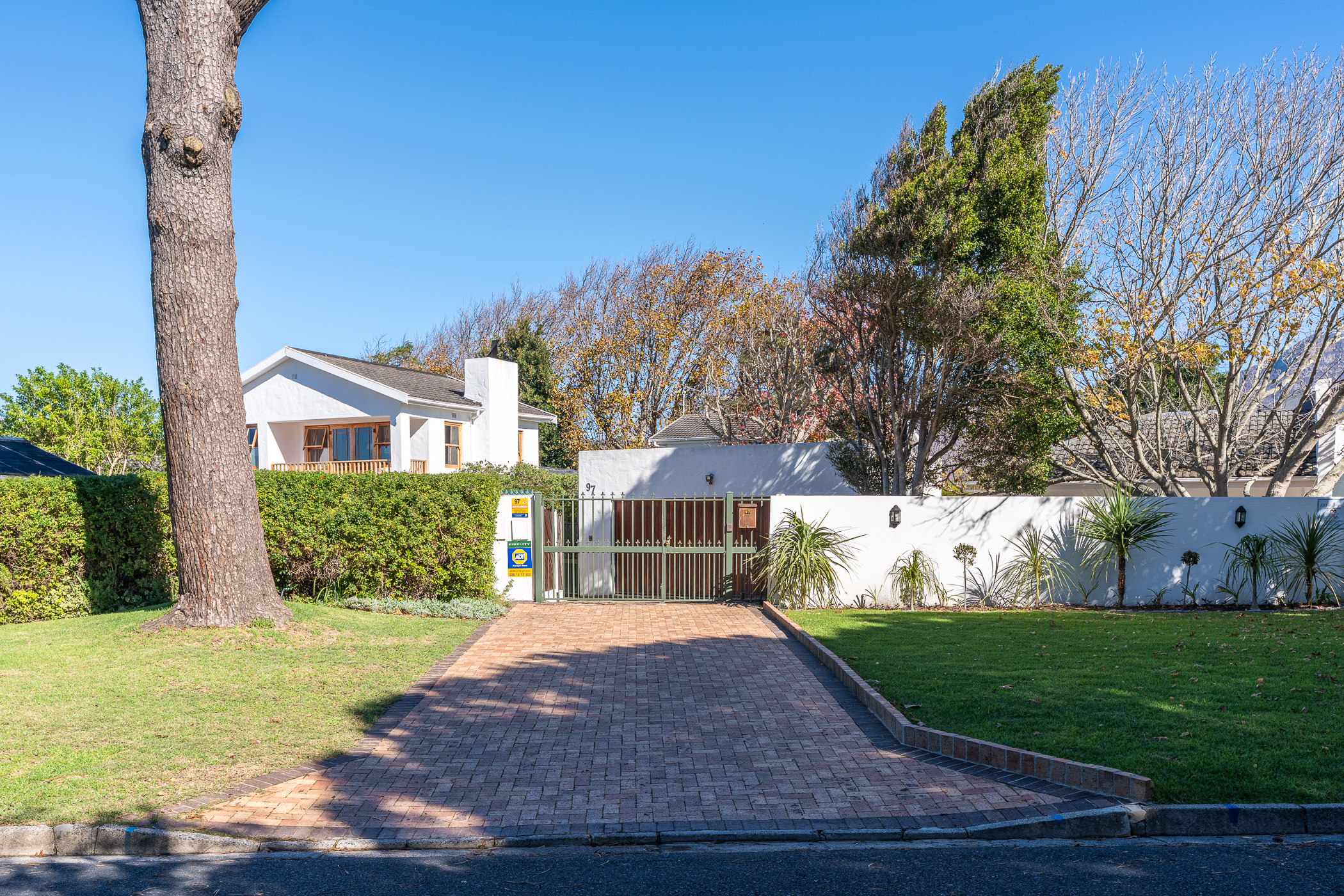 The ambiance in this pocket is elegant and upmarket with deep pavements, tall Stone Pine trees and the beautiful silhouette of Constantiaberg mountains on the horizon. A welcoming brick-paved driveway leads to a wrought iron sliding gate and automated double Garage. A pedestrian gate opens to a pathway along a wooden diagonal-slatted side wall and leads to a gorgeous private garden with a mature Pin Oak tree taking pride of place – a peaceful oasis of lush greenery and splashes of colour.