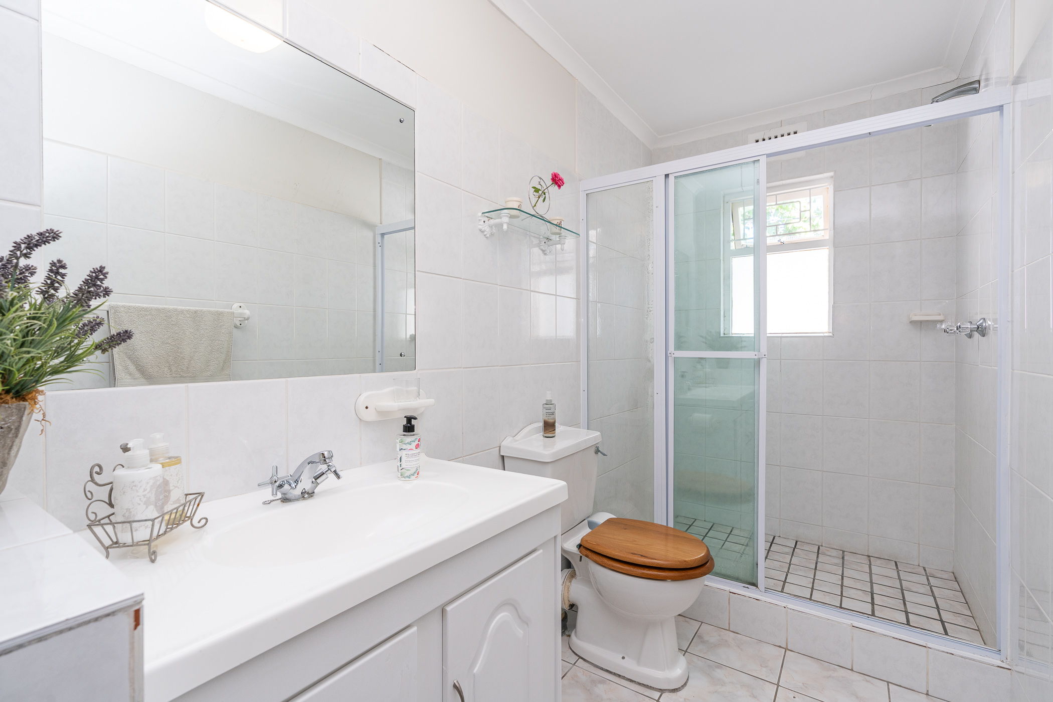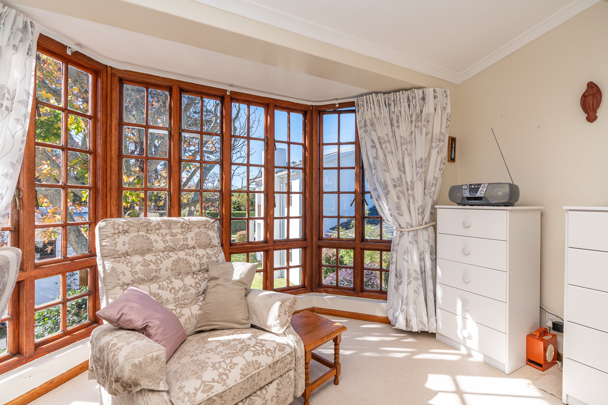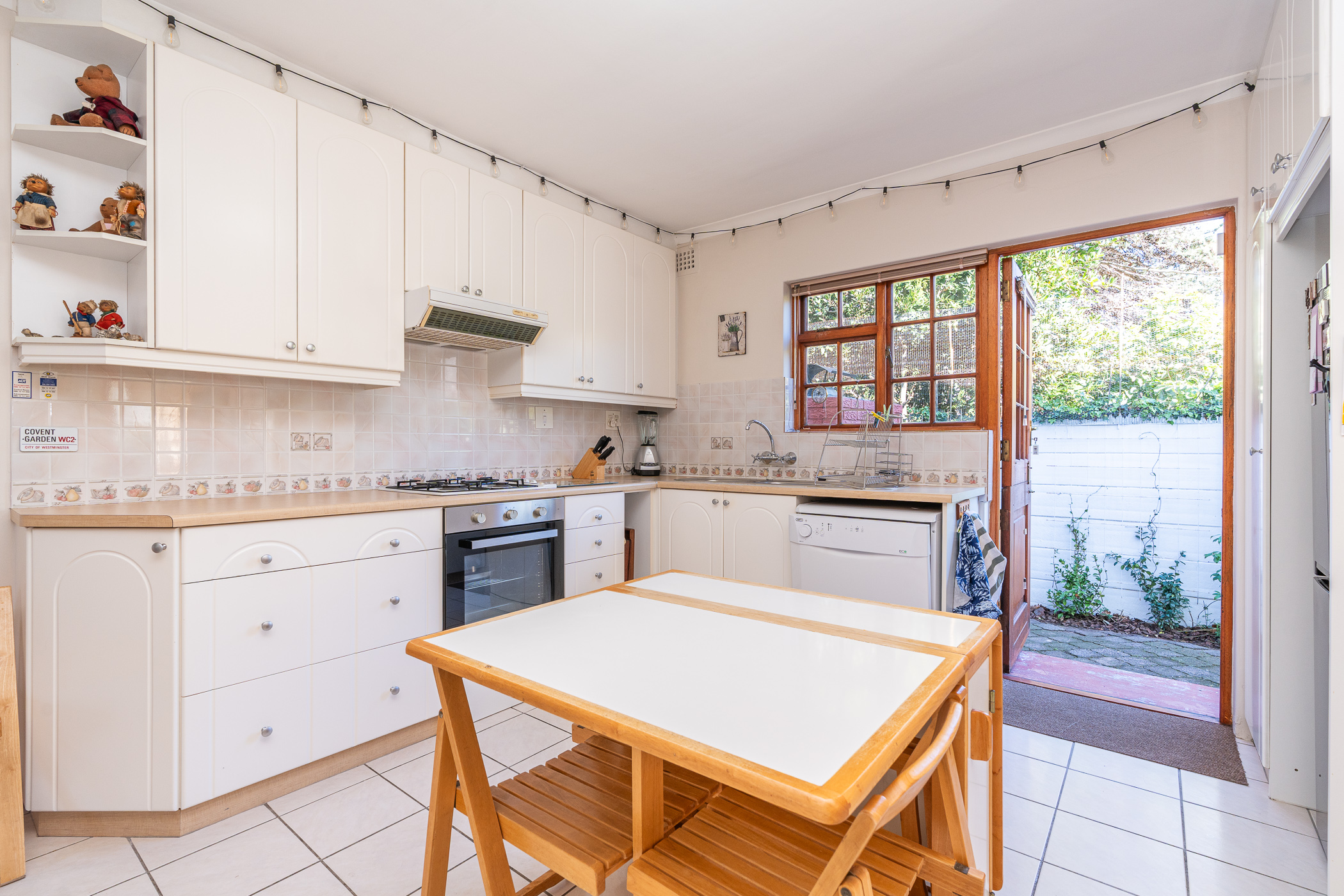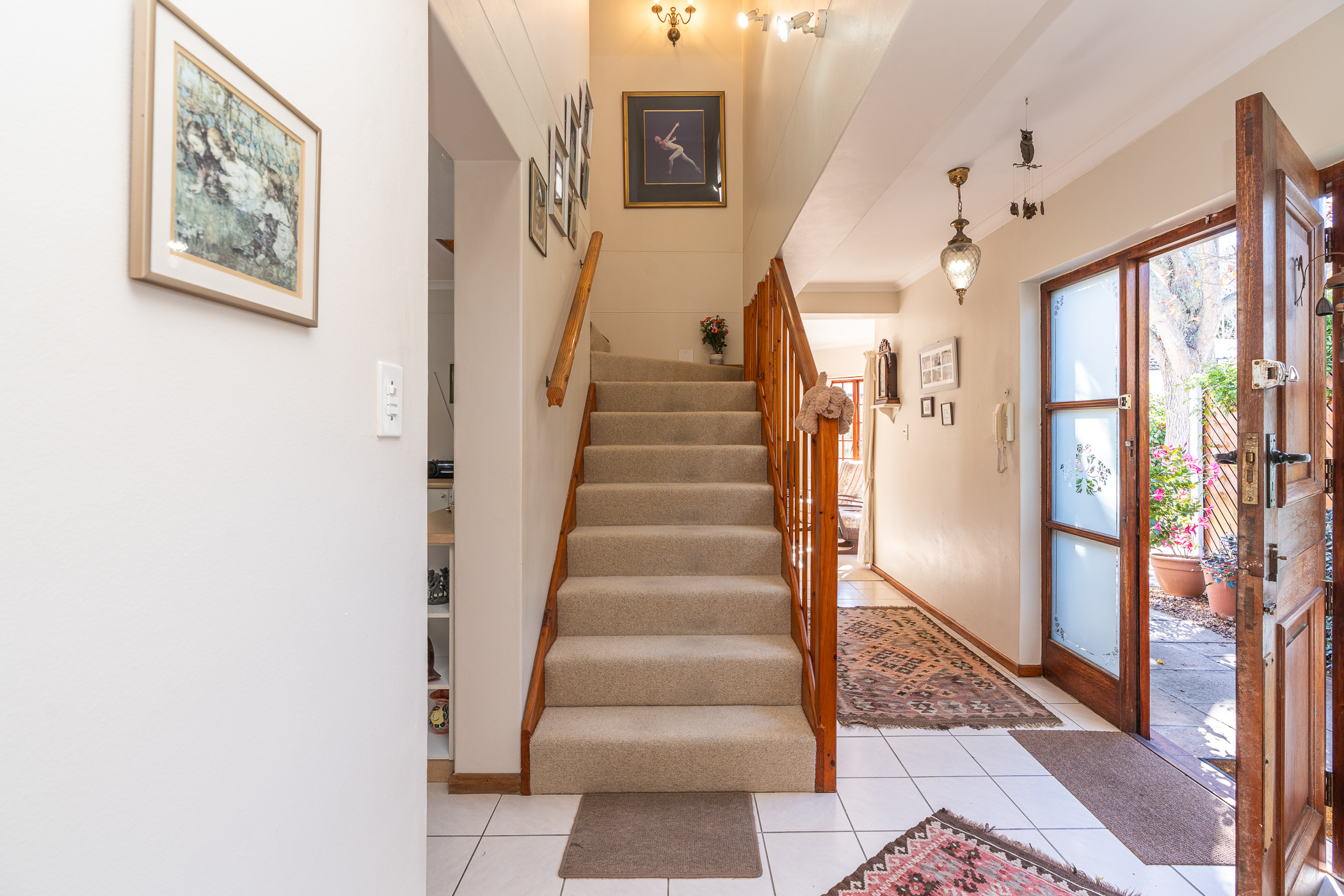 The ambiance in this pocket is elegant and upmarket with deep pavements, tall Stone Pine trees and the beautiful silhouette of Constantiaberg mountains on the horizon. A welcoming brick-paved driveway leads to a wrought iron sliding gate and automated double Garage. A pedestrian gate opens to a pathway along a wooden diagonal-slatted side wall and leads to a gorgeous private garden with a mature Pin Oak tree taking pride of place – a peaceful oasis of lush greenery and splashes of colour.