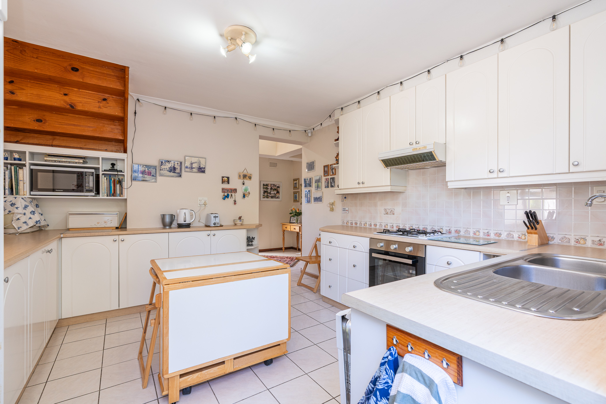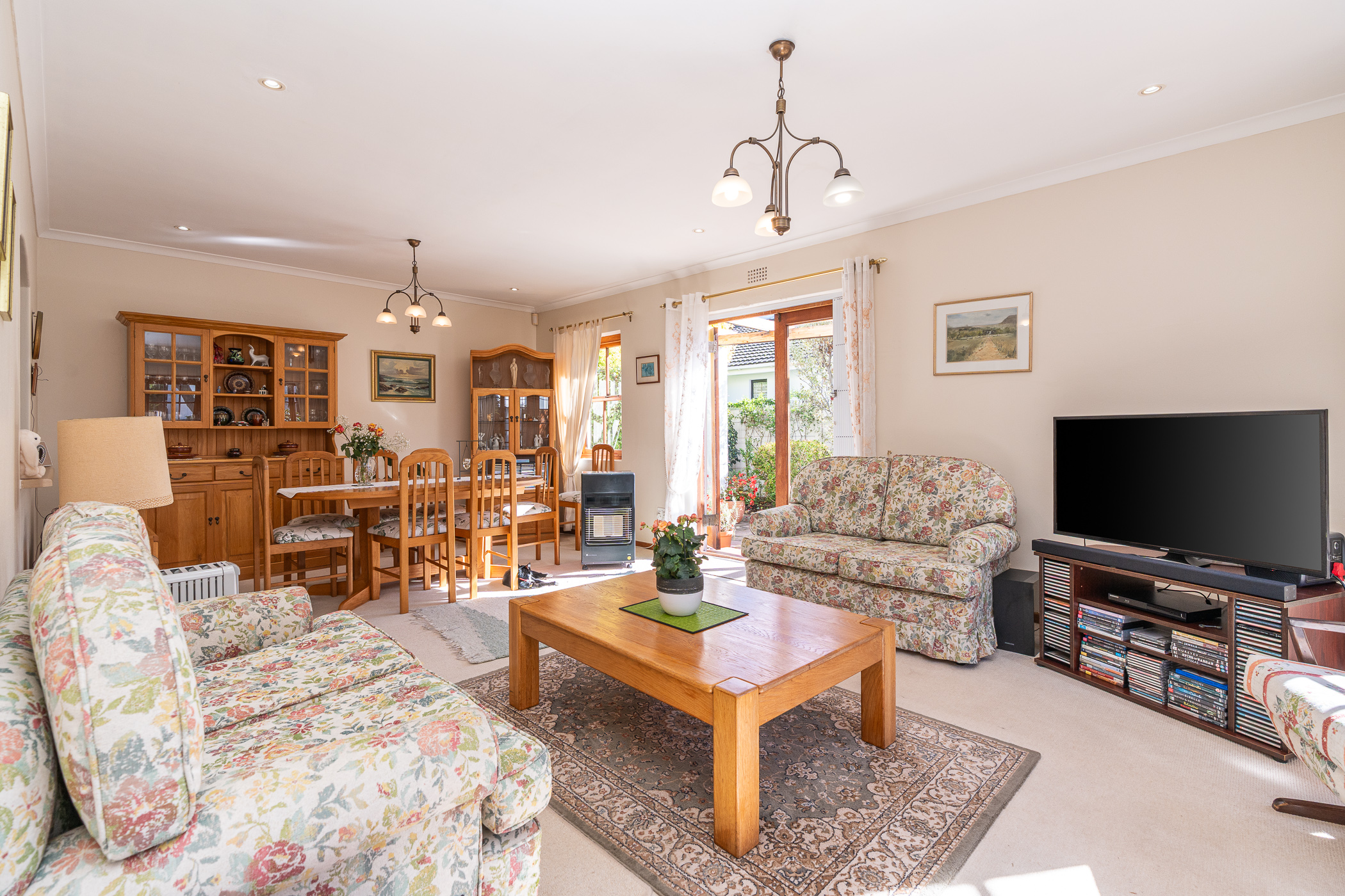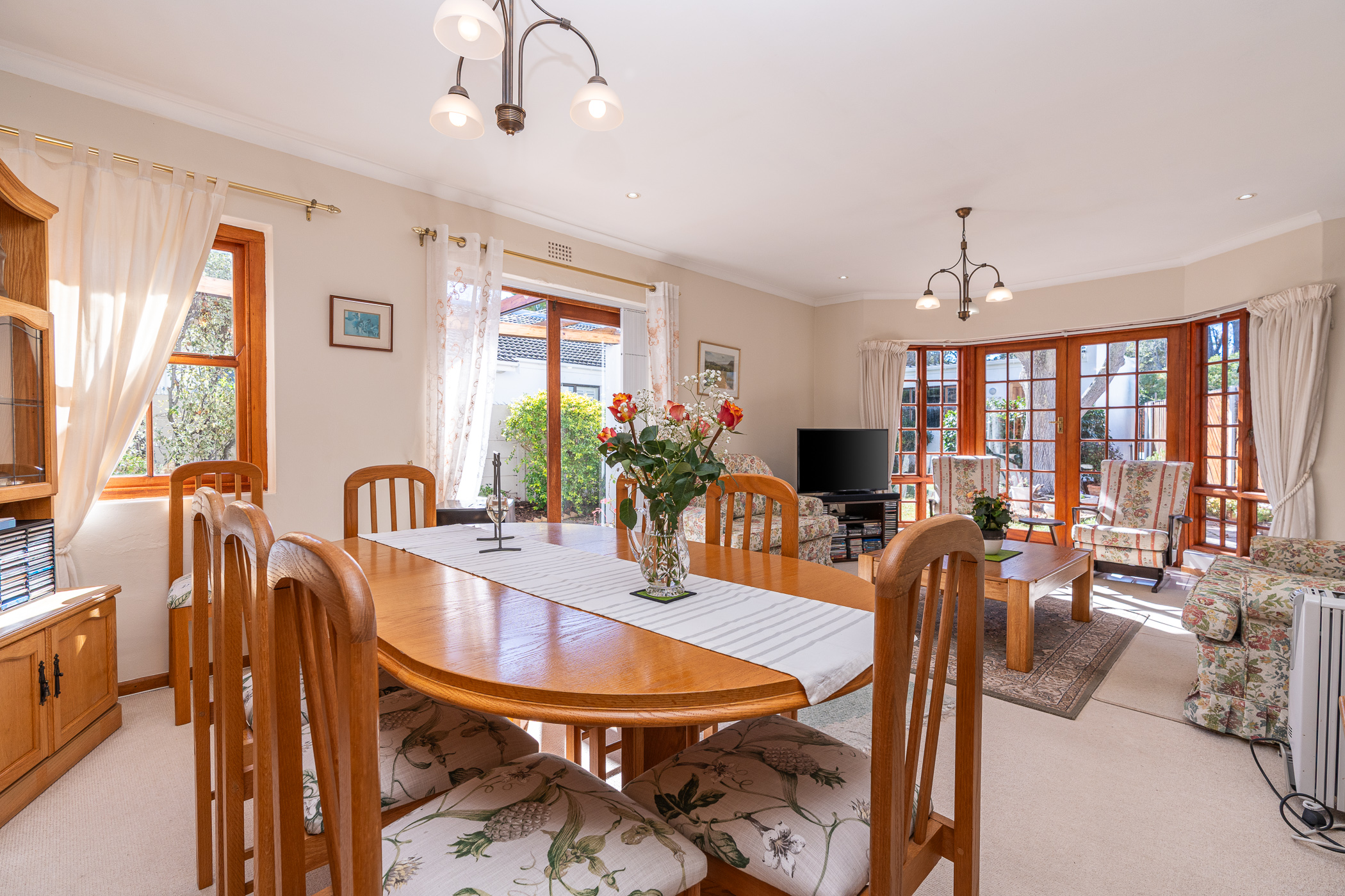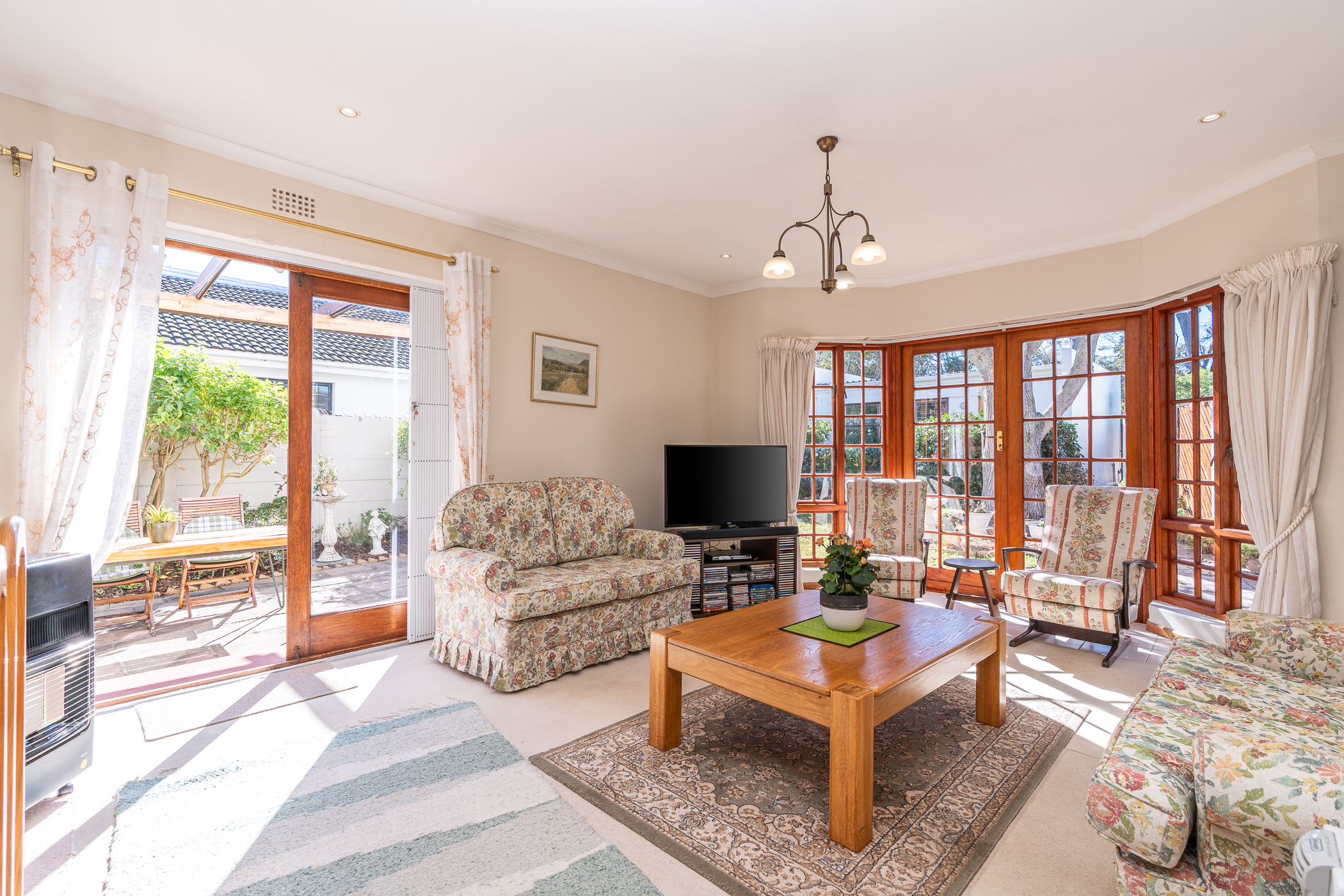 The living area, consisting of Lounge and Dining room, is light and bright with two sets of double French doors, one set in the spacious bay window facing East and the other set leads out to a delightful Revelstone-tiled Patio and pergola with retractable awnings – a favourite spot for entertaining. There’s a built-in braai on the West elevation.