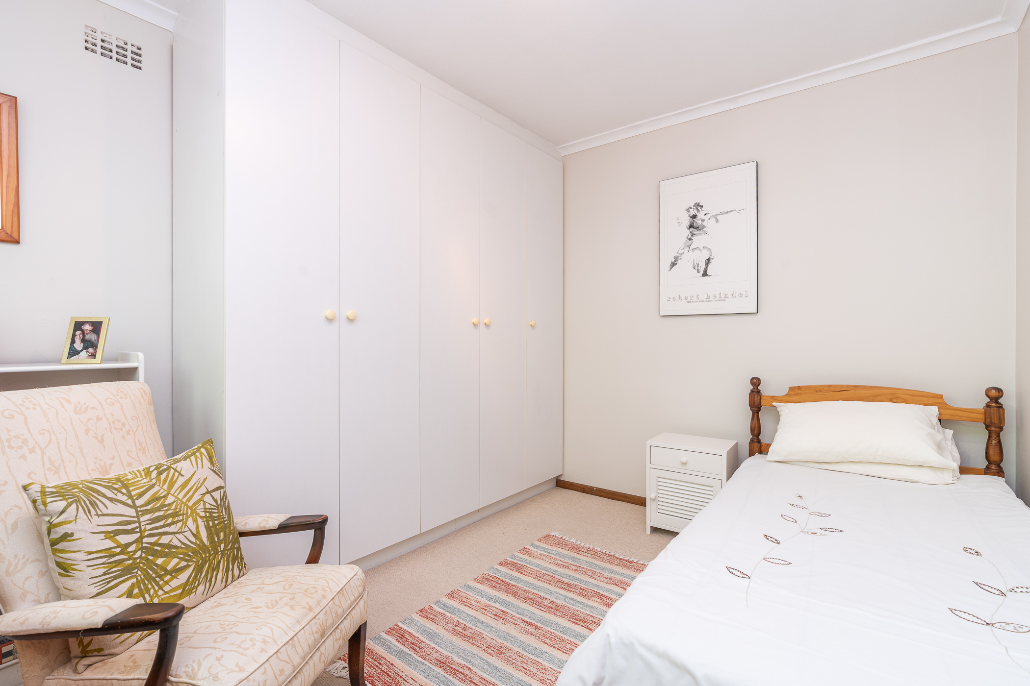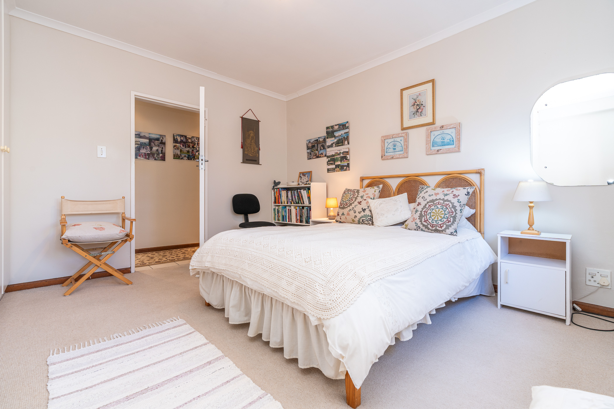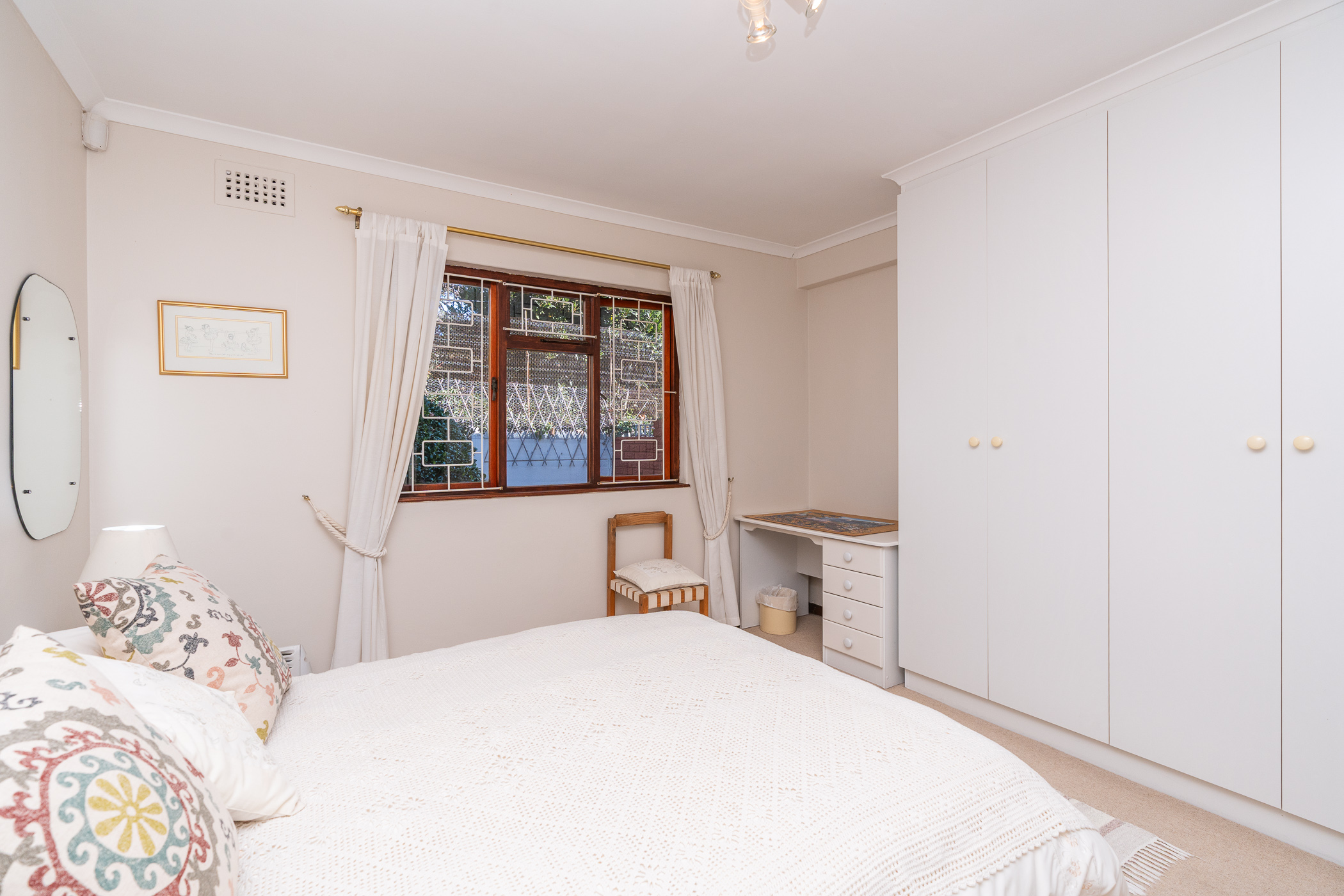 Bedroom 1 downstairs is spacious and neat with built-in cupboards. The adjoining Bathroom, absolutely pristine in fresh white, has a walk-in shower, vanity, loo and is plumbed for washing machine. Bedroom 2 also has generous built-in cupboarding and the Study, which could be a third Bedroom, leads to a convenient ironing room and exterior door.