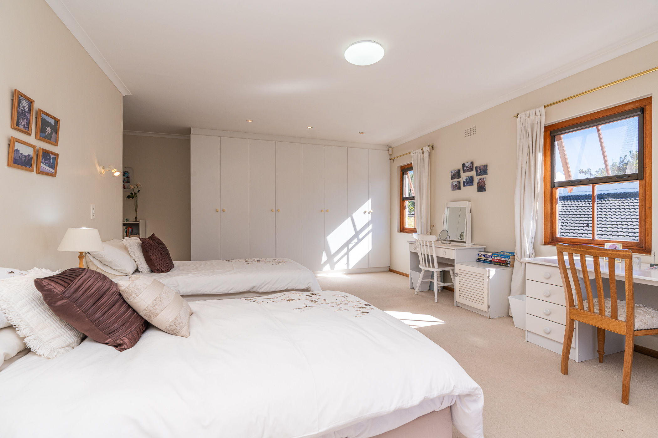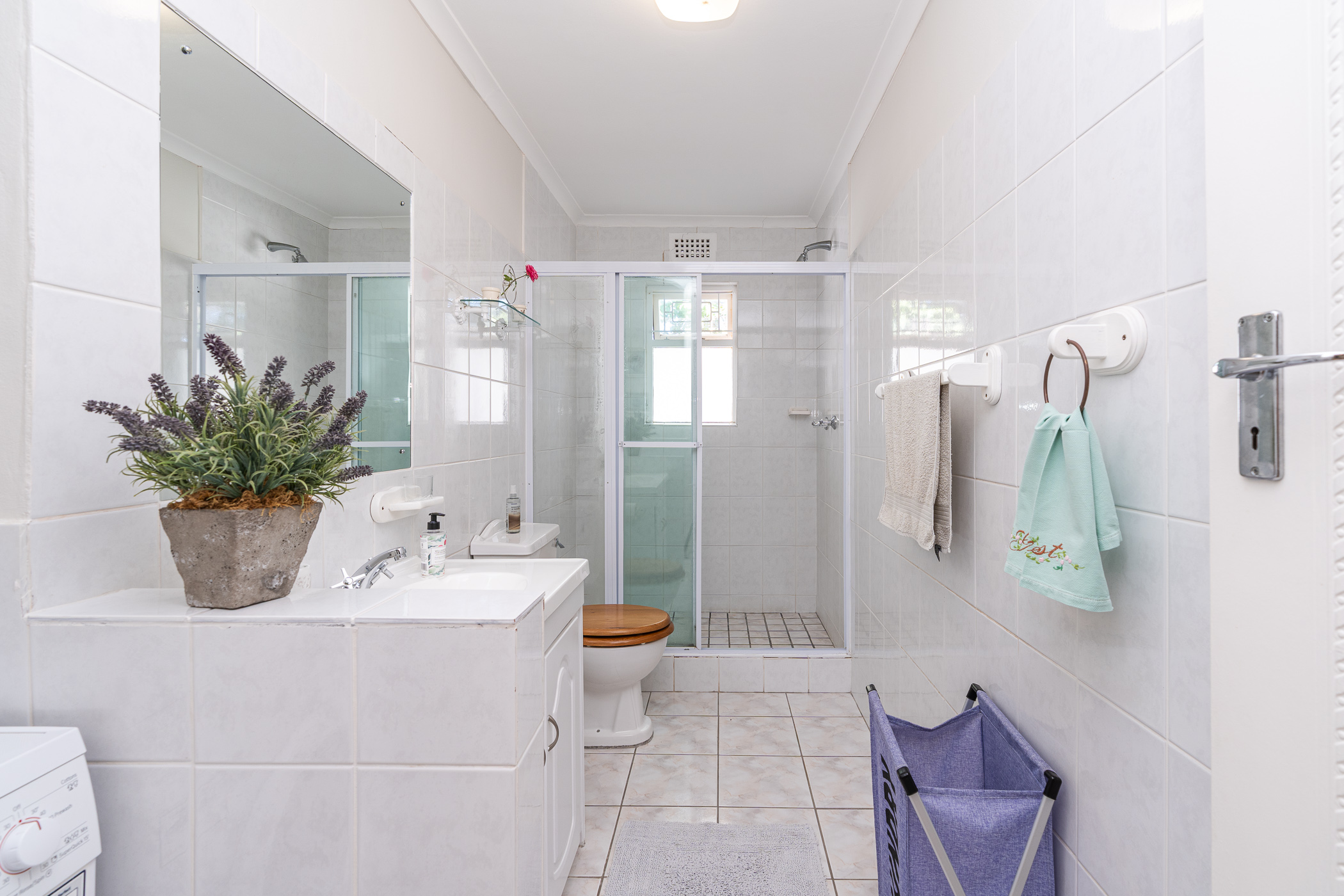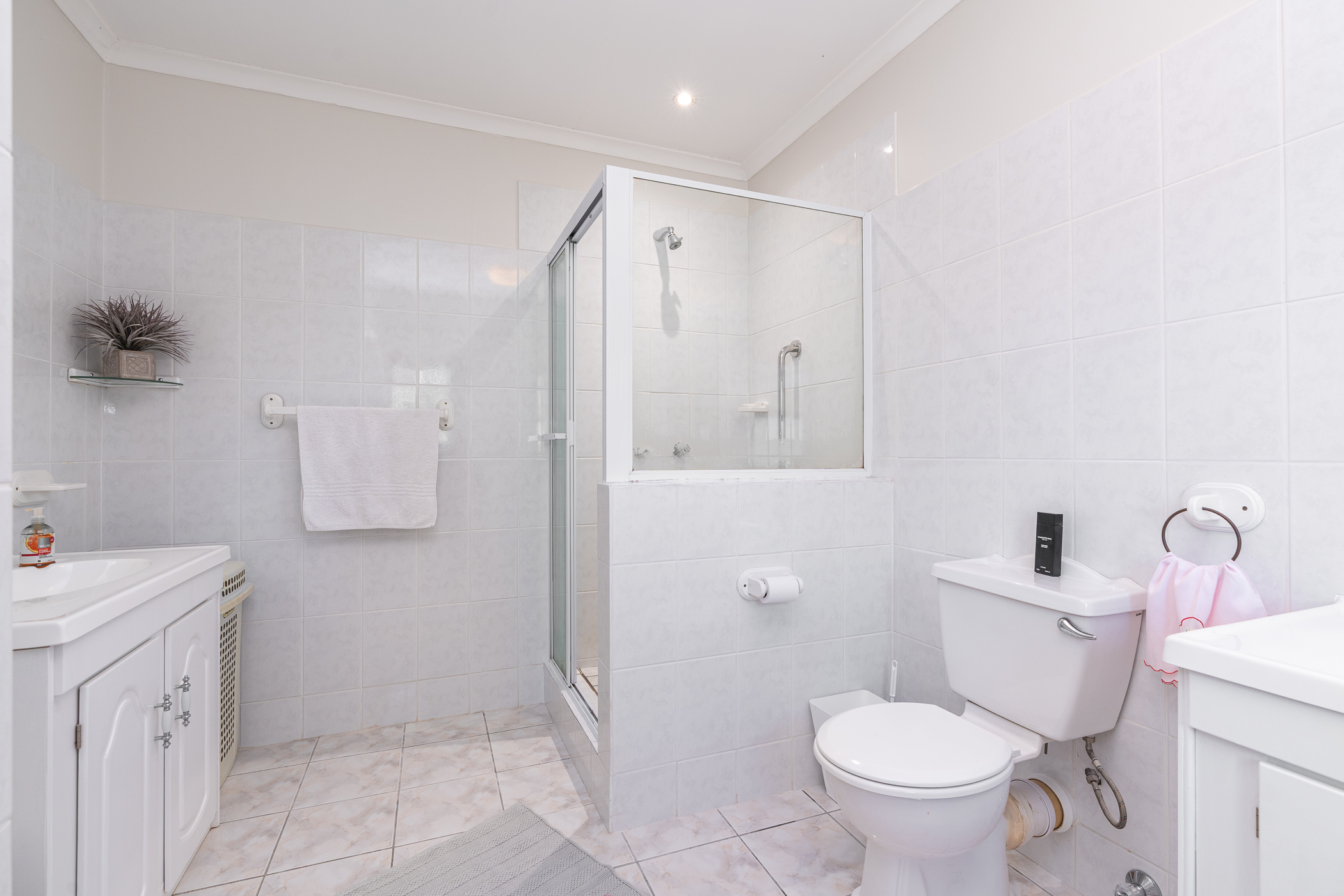 Bedroom 1 downstairs is spacious and neat with built-in cupboards. The adjoining Bathroom, absolutely pristine in fresh white, has a walk-in shower, vanity, loo and is plumbed for washing machine. Bedroom 2 also has generous built-in cupboarding and the Study, which could be a third Bedroom, leads to a convenient ironing room and exterior door.