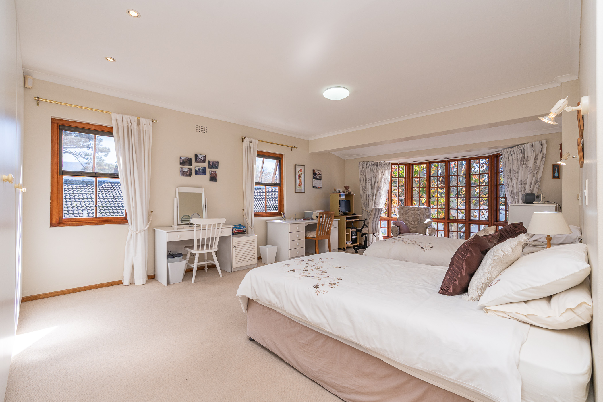 The upstairs Master Suite is extravagantly spacious, benefitting from the light of North facing windows with mountain views, a huge East facing bay window and a generous bank of built-in cupboards. The en-suite Bathroom boasts a “his and hers” layout with two vanities, shower, bath and loo.