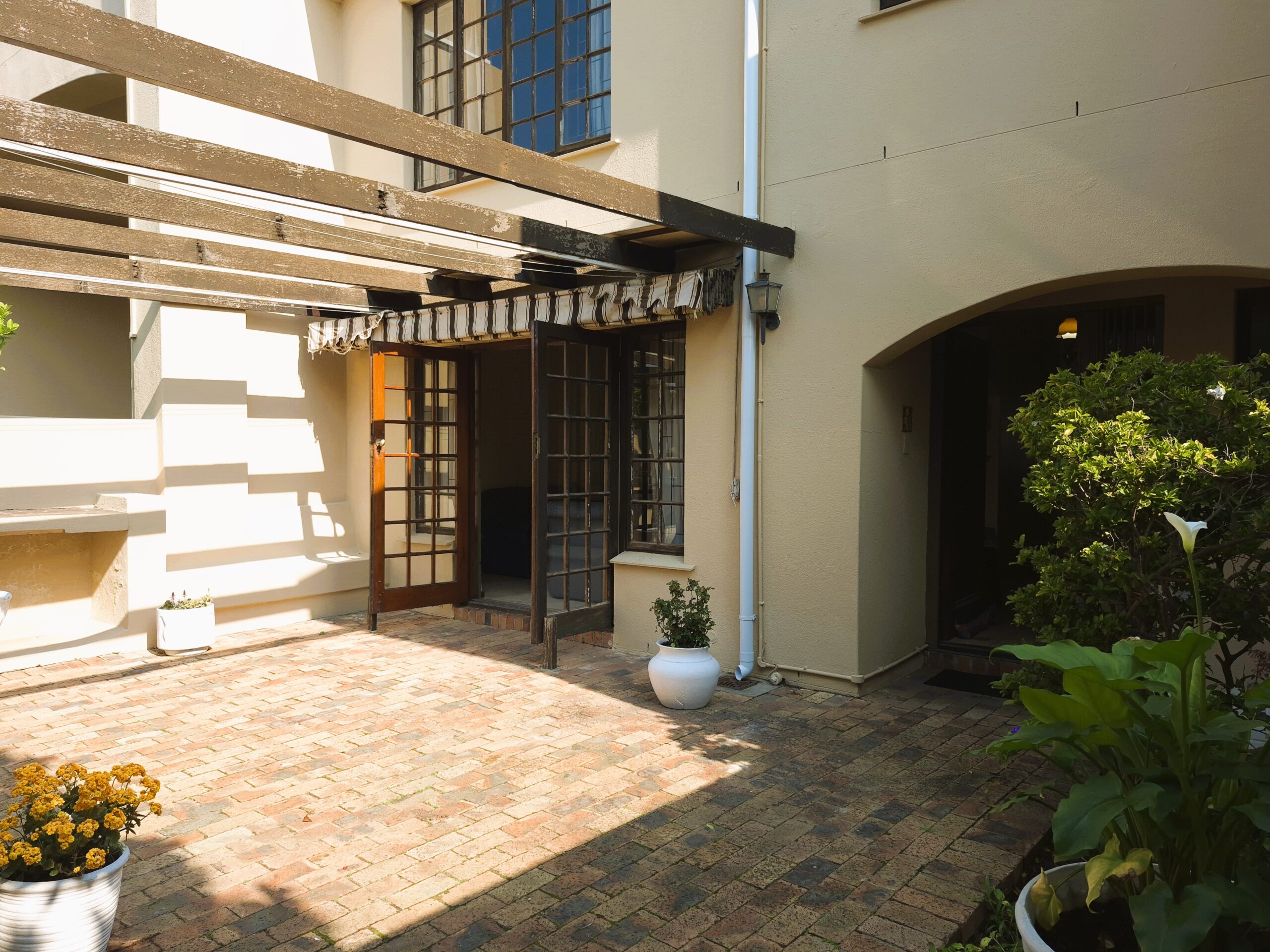 This Maisonette is conveniently positioned in the complex and benefits from an elevated setting with views out over treetops towards distant mountains. The single garage is directly adjoining and an exclusive parking bay is close by. The pretty terraced exclusive use garden with its display of colourful plants and trees is completely private with its own perimeter wall and gate. The brick-paved patio with pergola and retractable awning is a delightful spot for al fresco entertaining with fabulous flow from the living area via French doors.
