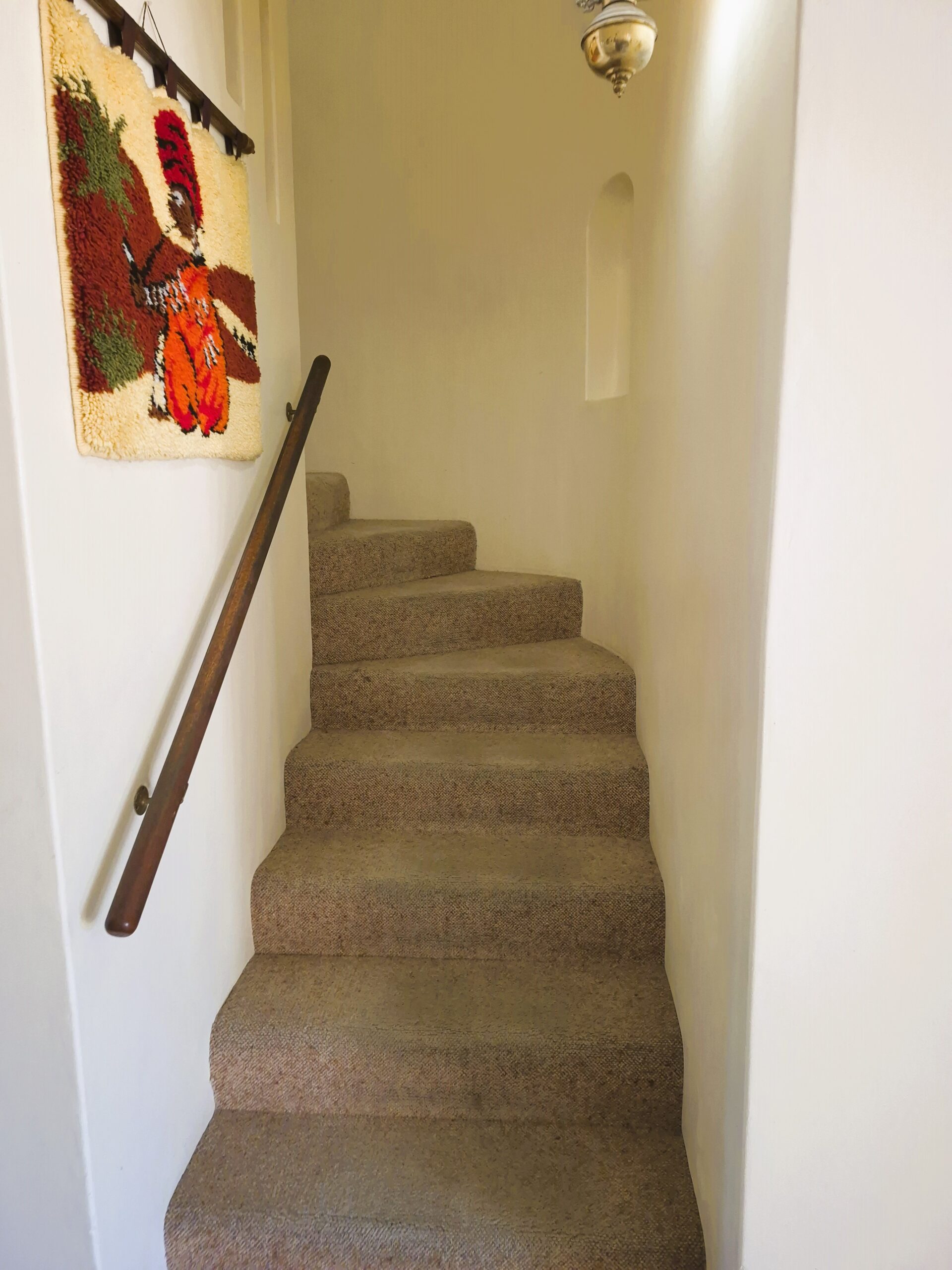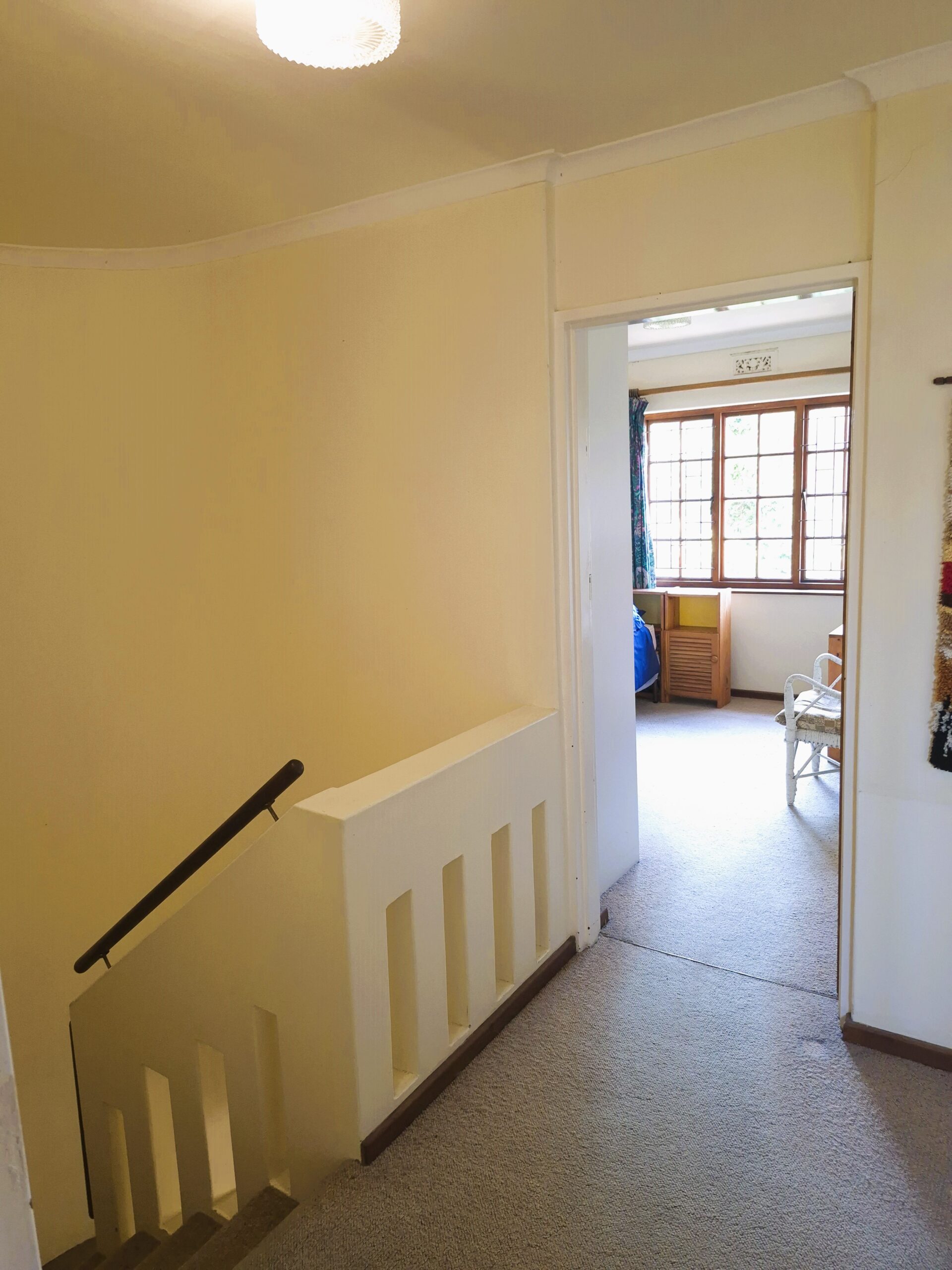 Curved stairs lead to the three upstairs bedrooms, all with generous built-in cupboards. The family bathroom has a bath, basin and loo. The main en-suite has a shower, basin and loo.