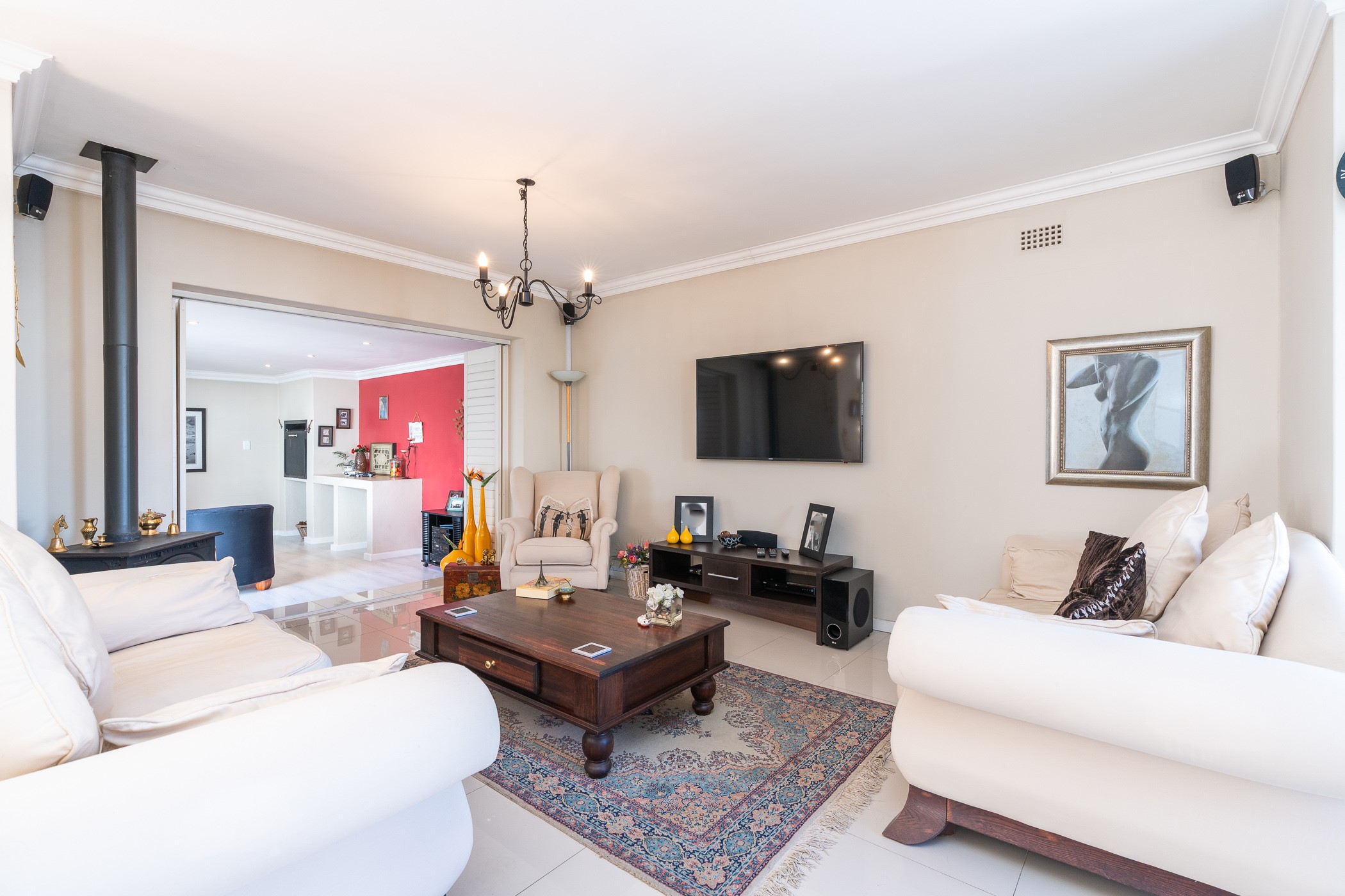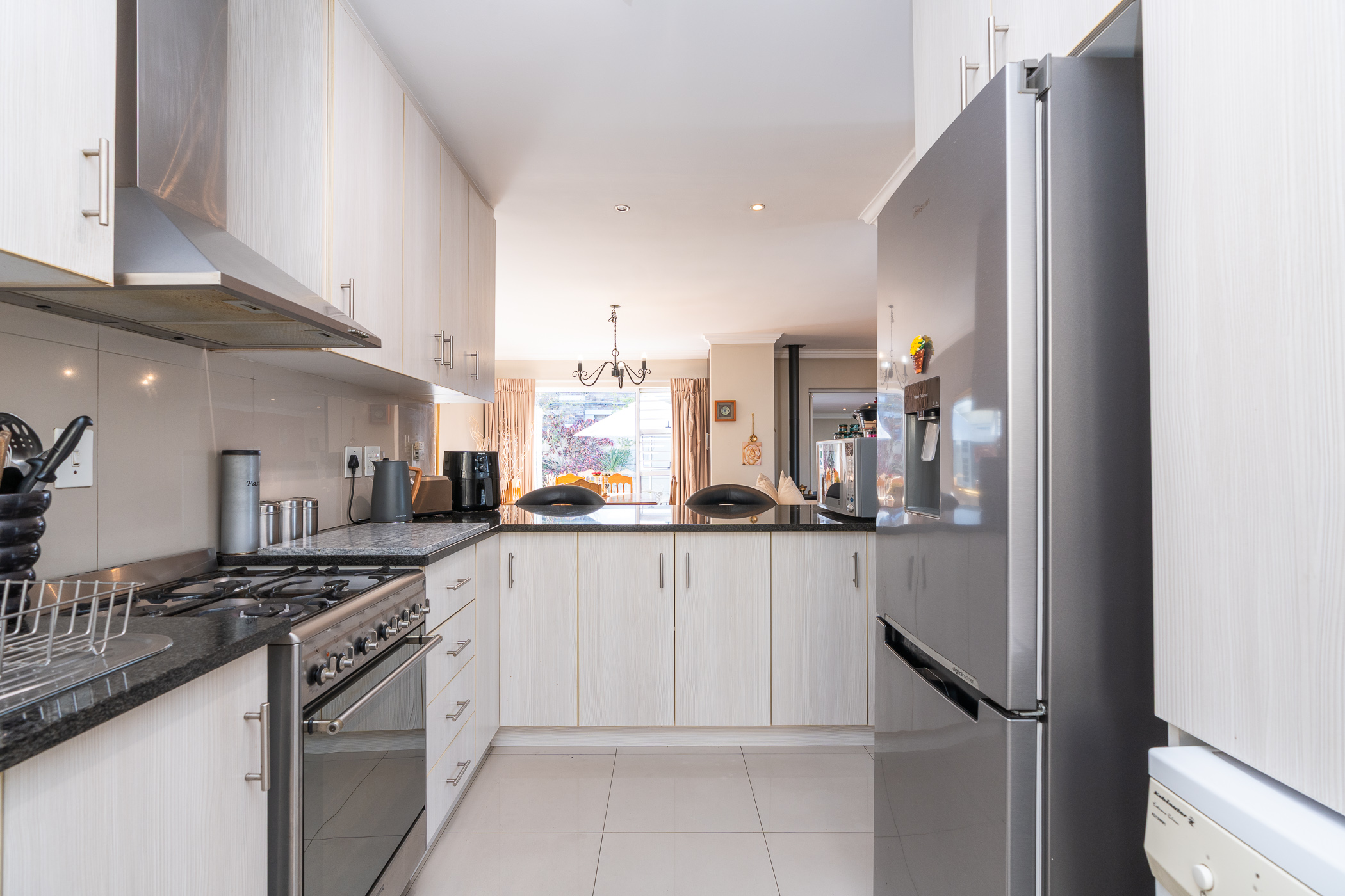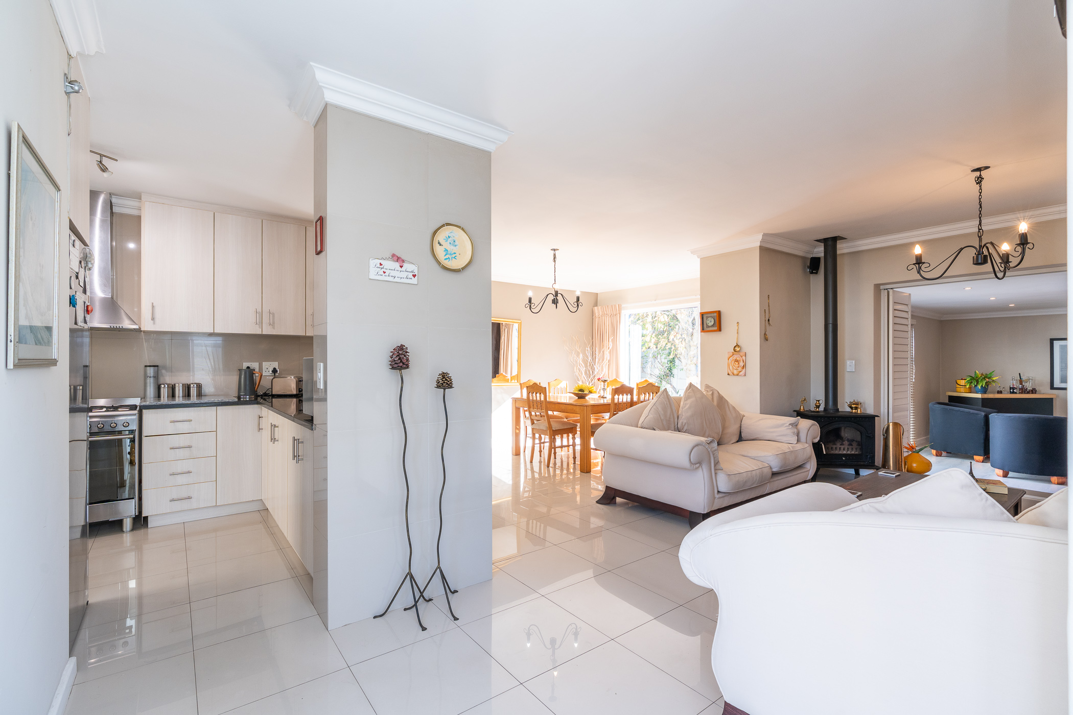 The white Aluminium front door with reflective glass swings open wide to welcome you into a gleaming porcelain-tiled entrance and fabulous flow into an expansive living area. The lounge has a combustion fireplace which keeps the open-plan dining room and entertainment room cosy in winter, especially with the extra feature of an indoor built-in braai. Sliding doors lead out to a paved patio and a gorgeous, manicured garden with mature trees, lush foliage and low maintenance astro turf lawn.