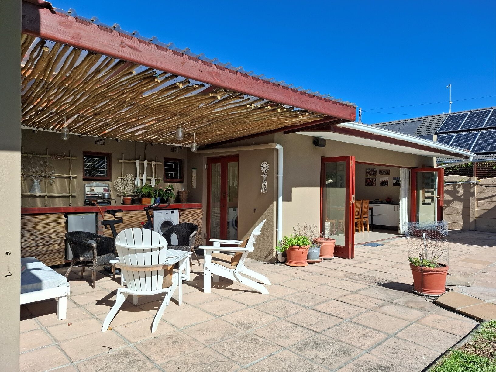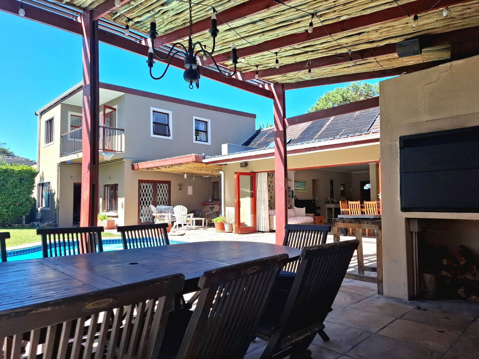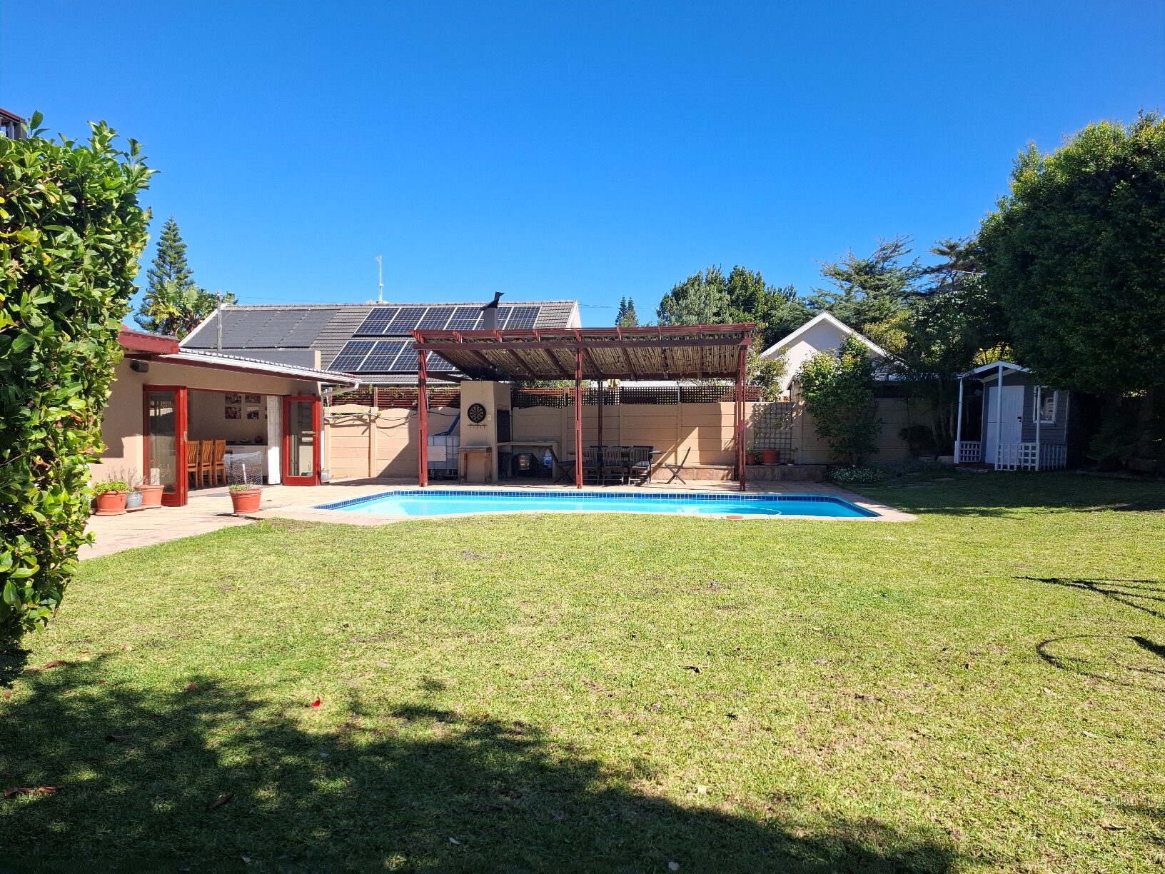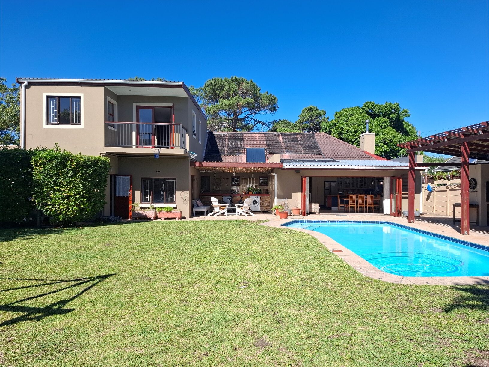 In terms of outside spaces, there are two patios - one suited to host large gatherings (with built-in braai), and a second suited to cosey evenings on the couch with a glass of wine. The main garden is north-facing, has a large swimming pool (heated; safety net), a borehole, irrigation system, two water tanks, and kiddies jungle gym. The cottage is approximately 50sqm with the bedroom separate, an open plan kitchen/lounge with a door to the back garden.