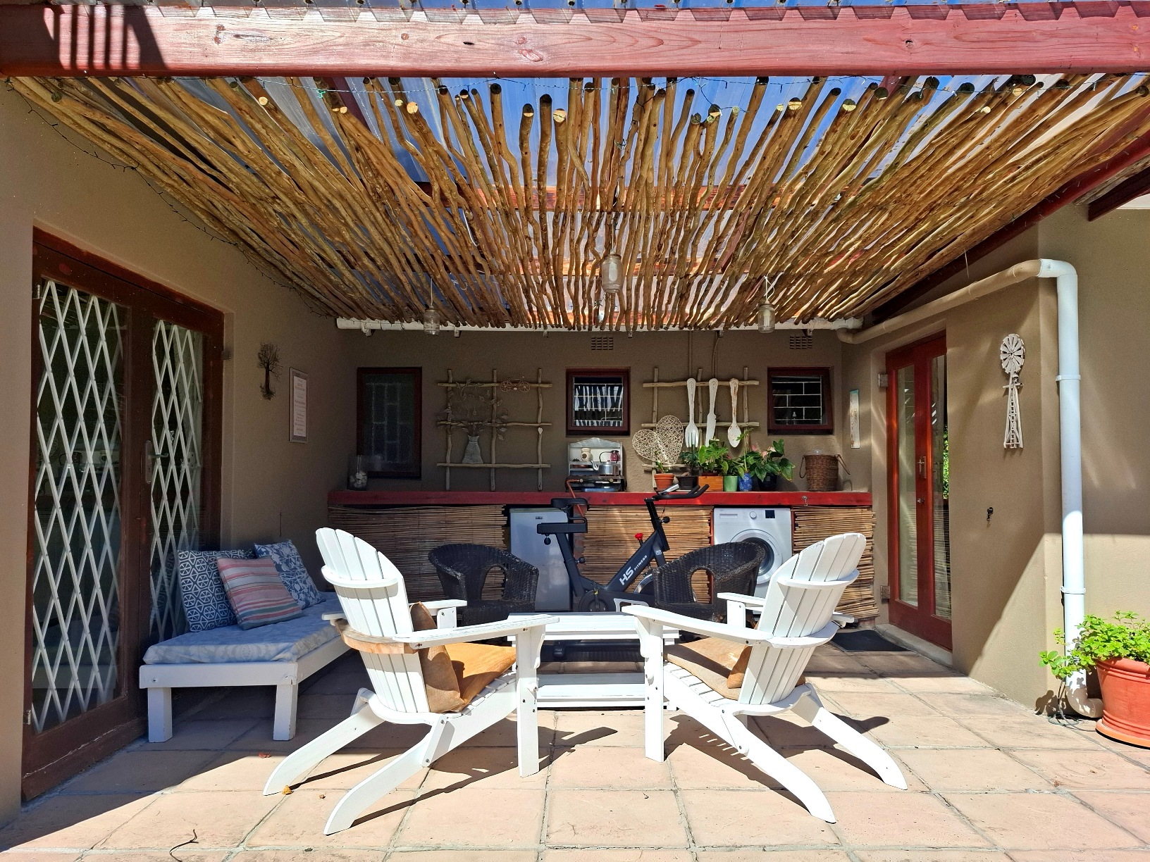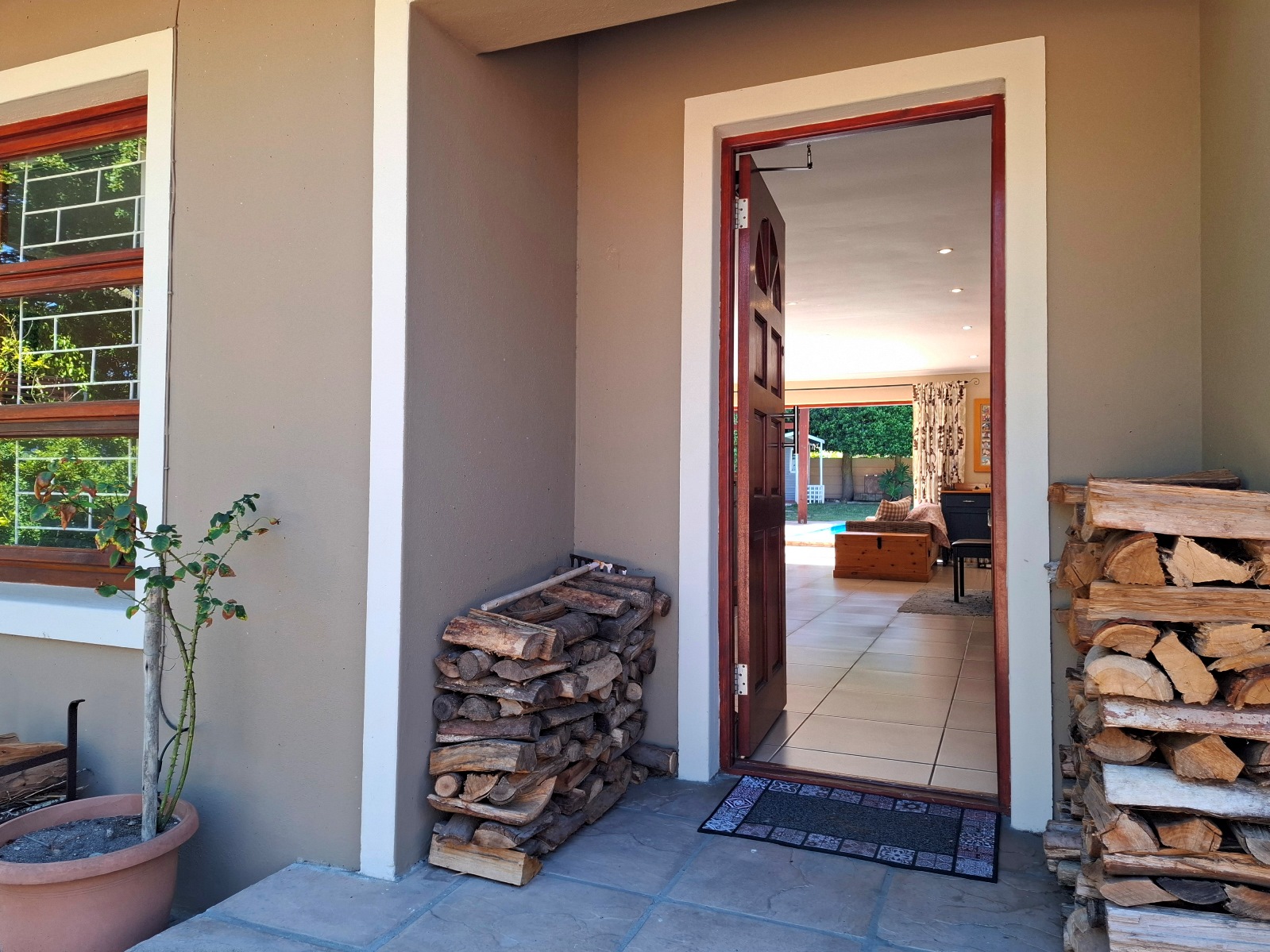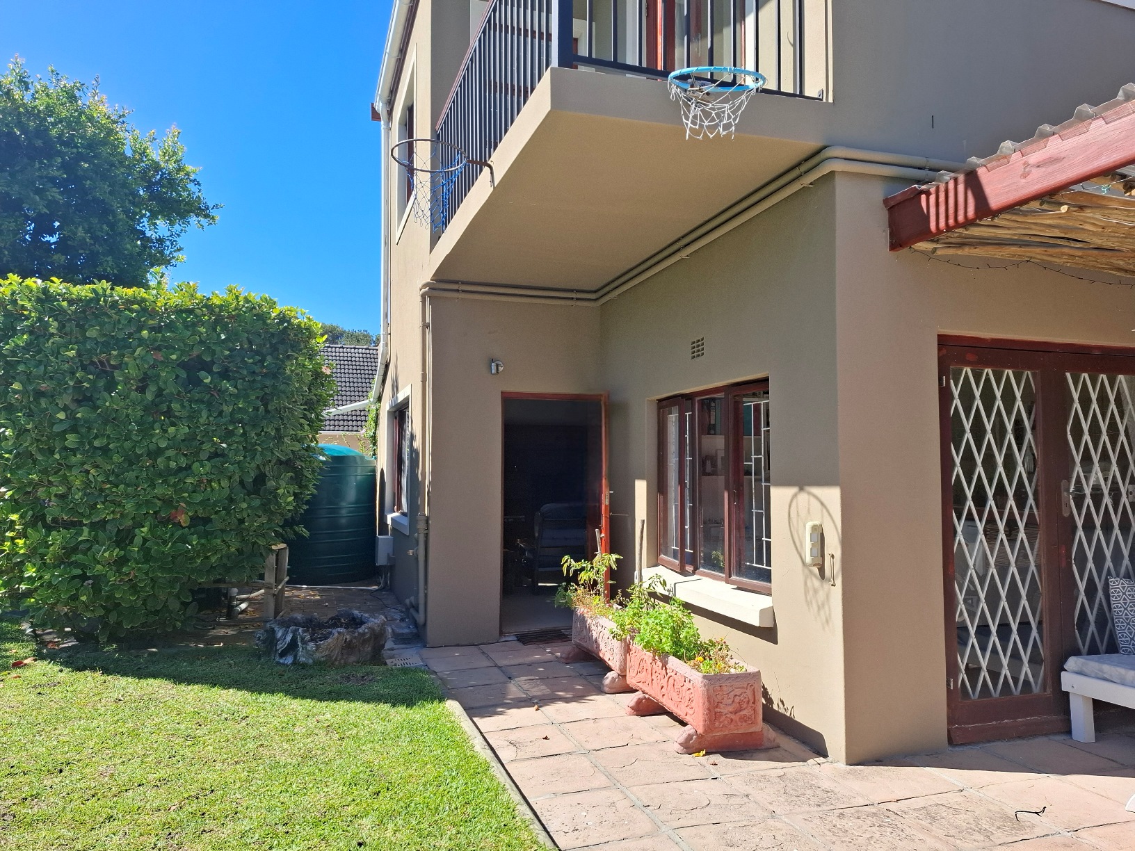 In terms of outside spaces, there are two patios - one suited to host large gatherings (with built-in braai), and a second suited to cosey evenings on the couch with a glass of wine. The main garden is north-facing, has a large swimming pool (heated; safety net), a borehole, irrigation system, two water tanks, and kiddies jungle gym. The cottage is approximately 50sqm with the bedroom separate, an open plan kitchen/lounge with a door to the back garden.
