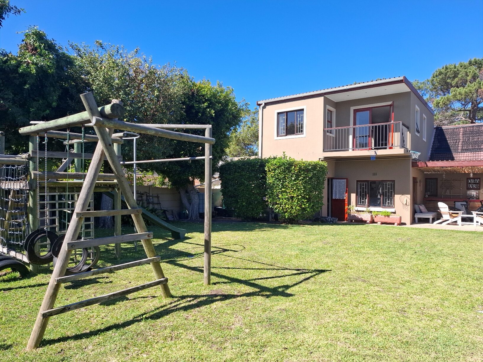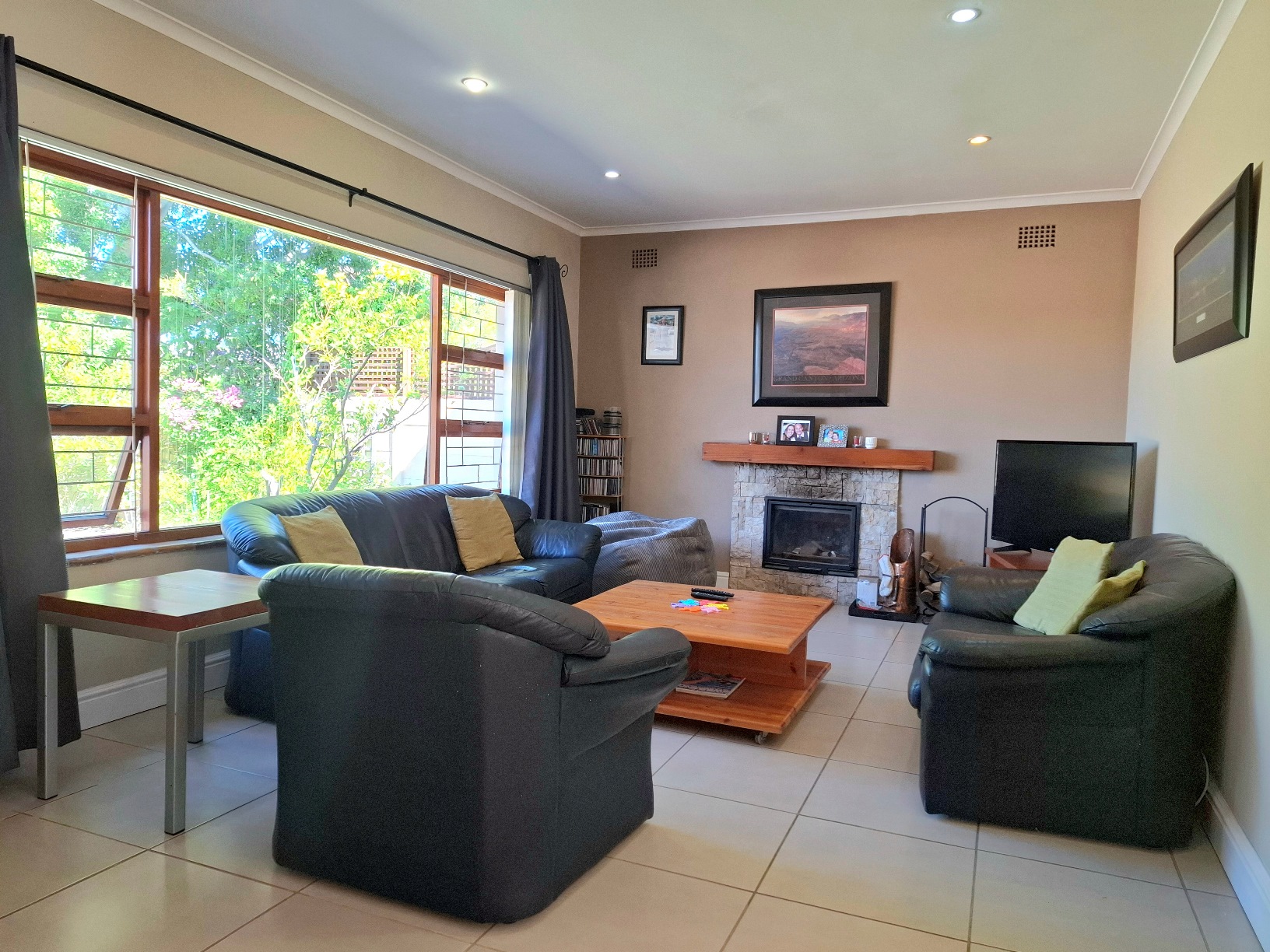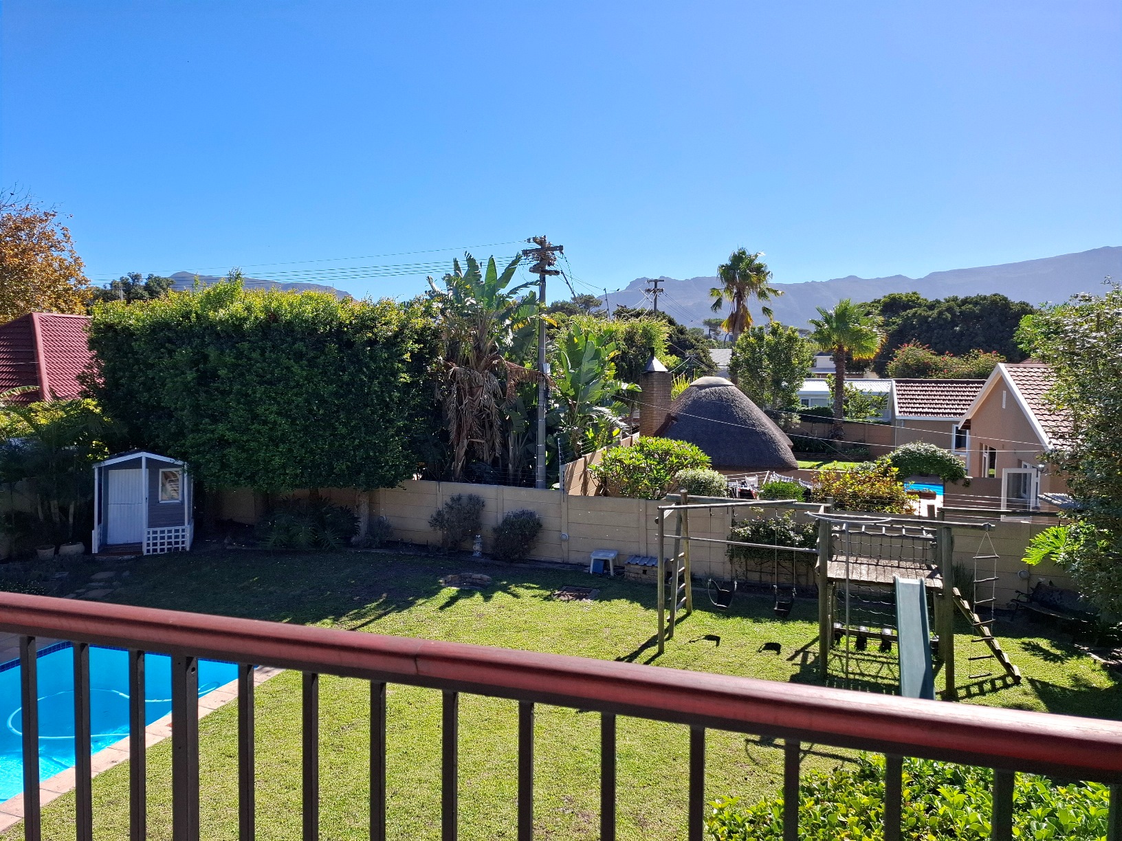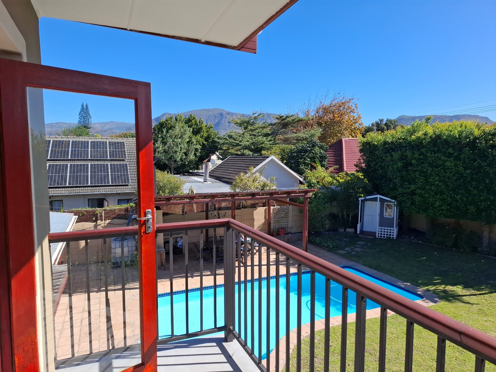 The house has expanded considerably over the 26 years that the current family has lived here, to now comprise of a formal lounge (with modern fireplace), a large open plan kitchen/dining/family room, 3 bedrooms and 2 bathrooms on the ground floor, and a main bedroom (ensuite) with pyjama lounge upstairs. All the bedrooms have built in cupboards and either wooden/tiled floors. The main bedroom and pyjama lounge enjoy spectacular views of the back of Table Mountain and the Constantiaberg range from a covered balcony.