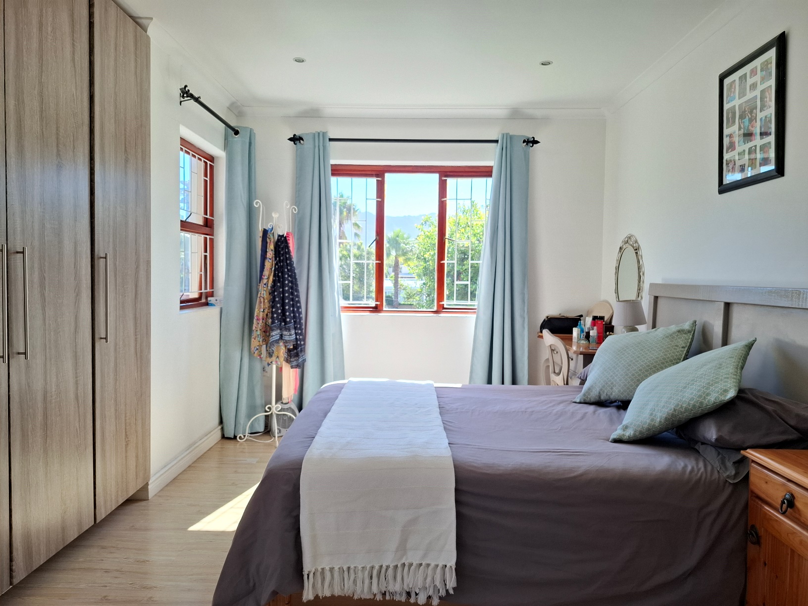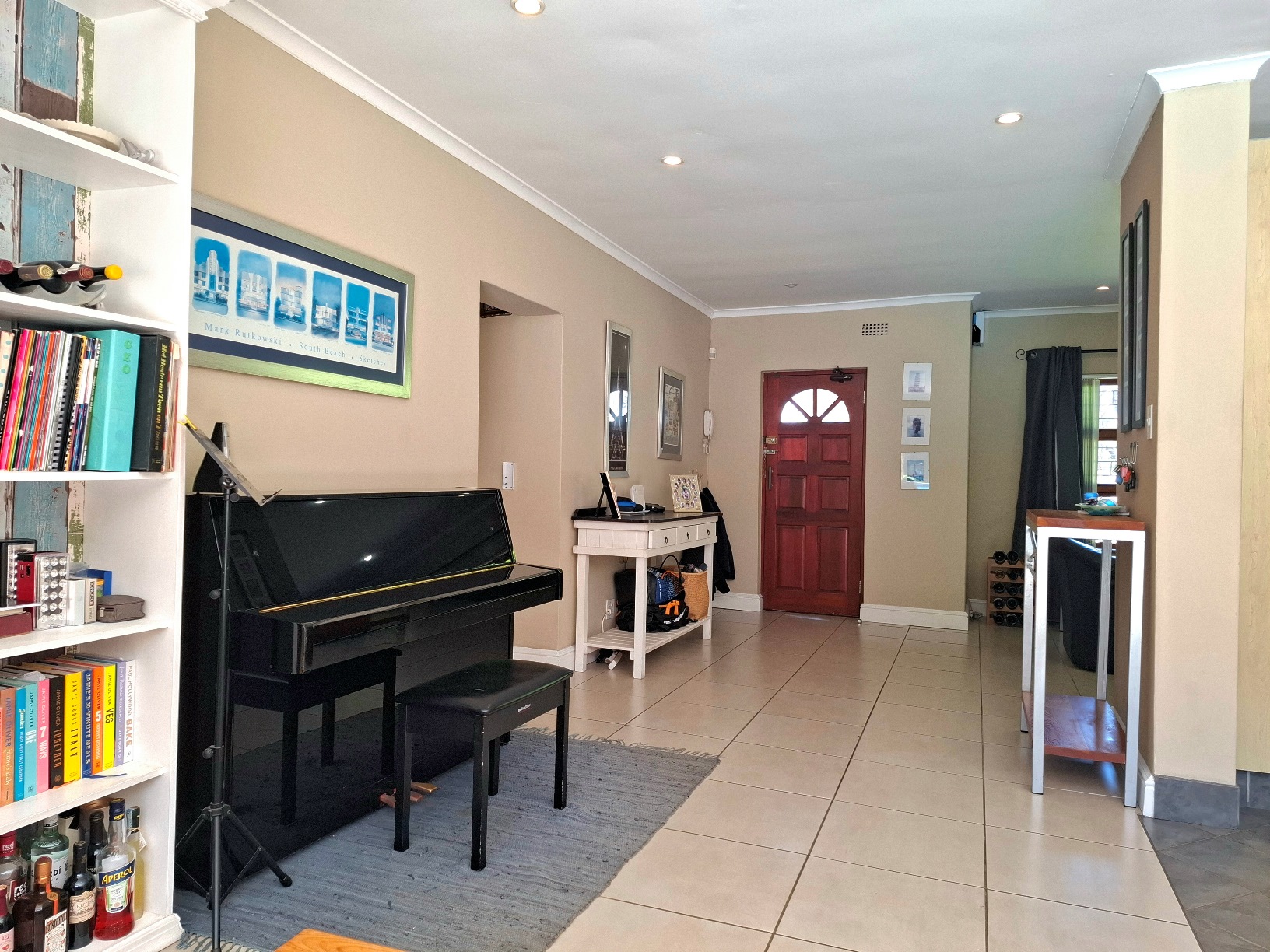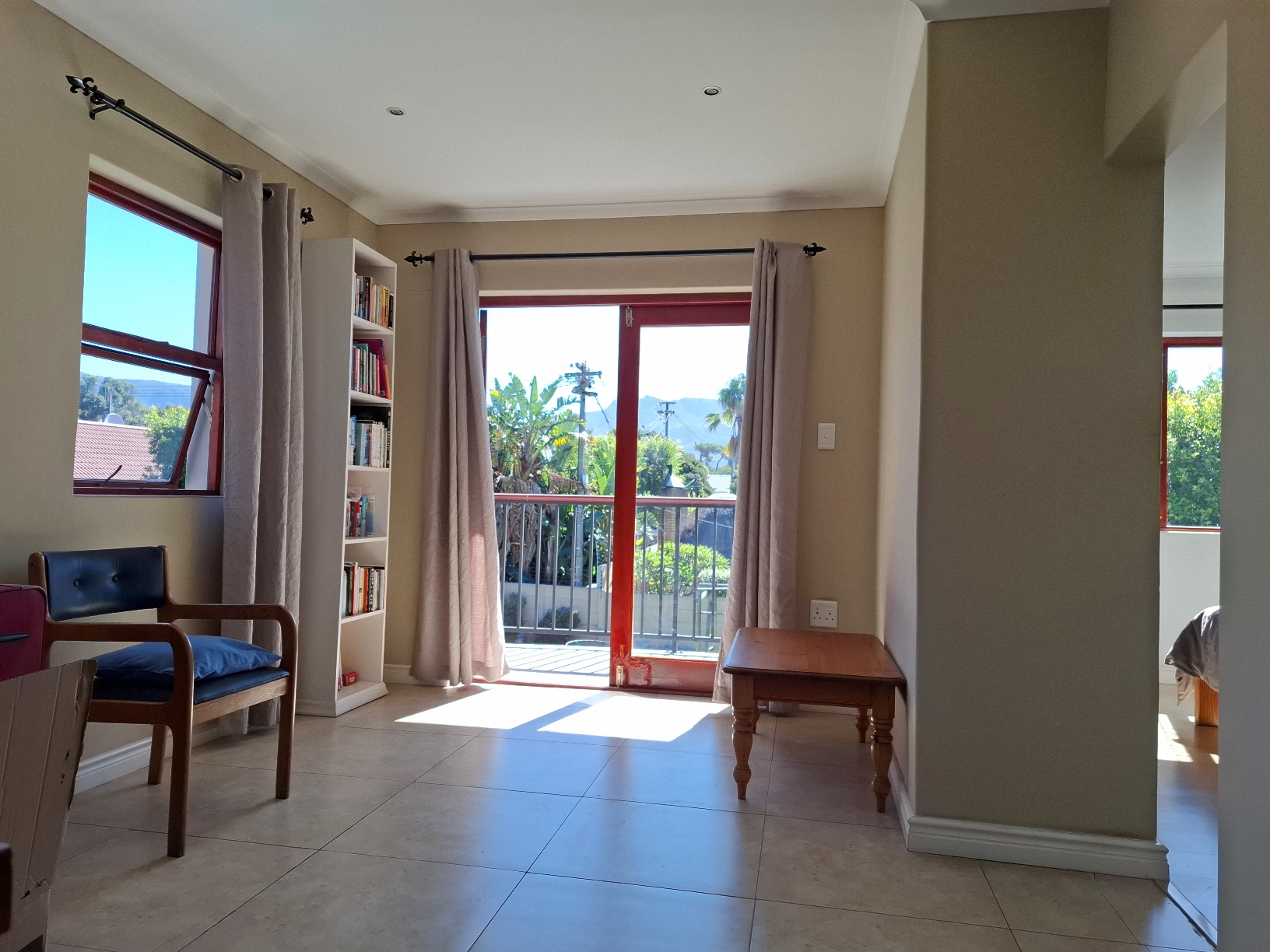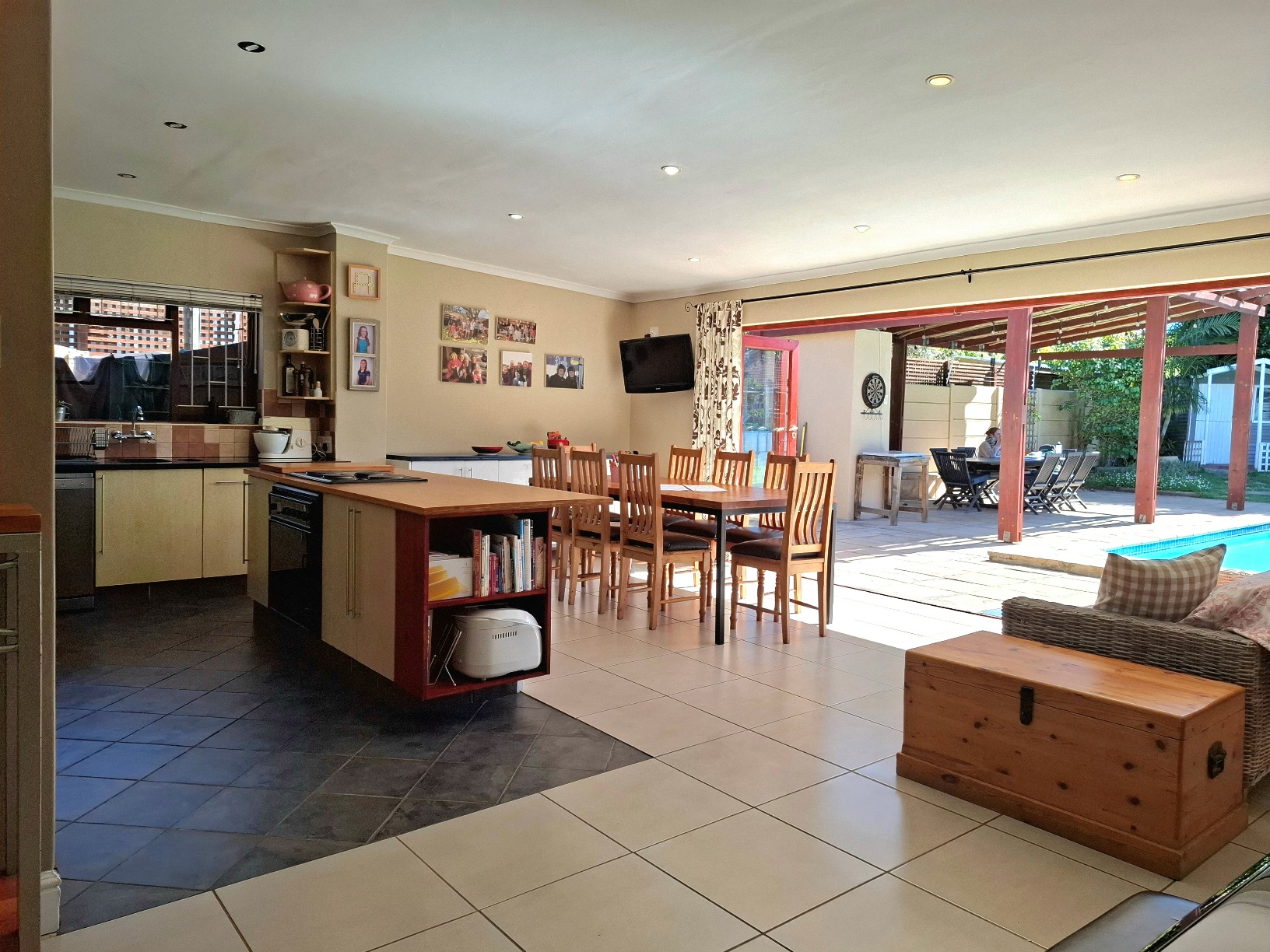 The house has expanded considerably over the 26 years that the current family has lived here, to now comprise of a formal lounge (with modern fireplace), a large open plan kitchen/dining/family room, 3 bedrooms and 2 bathrooms on the ground floor, and a main bedroom (ensuite) with pyjama lounge upstairs. All the bedrooms have built in cupboards and either wooden/tiled floors. The main bedroom and pyjama lounge enjoy spectacular views of the back of Table Mountain and the Constantiaberg range from a covered balcony.