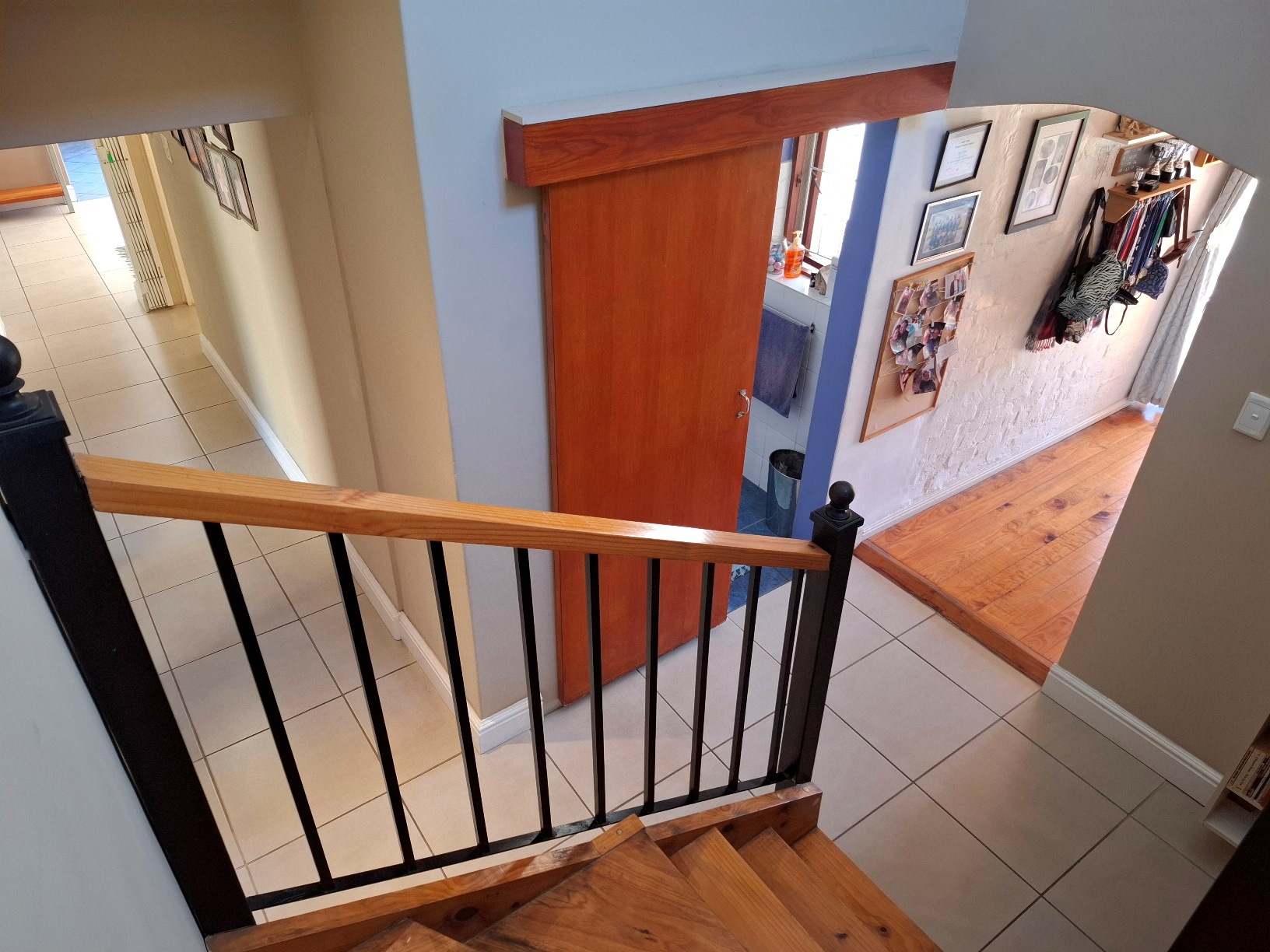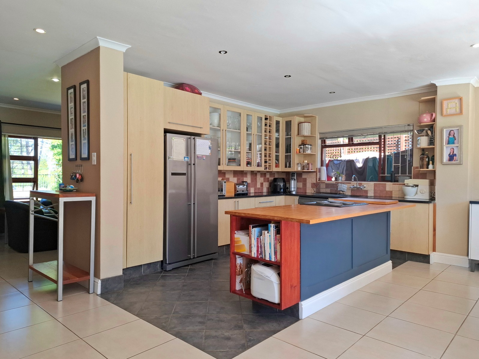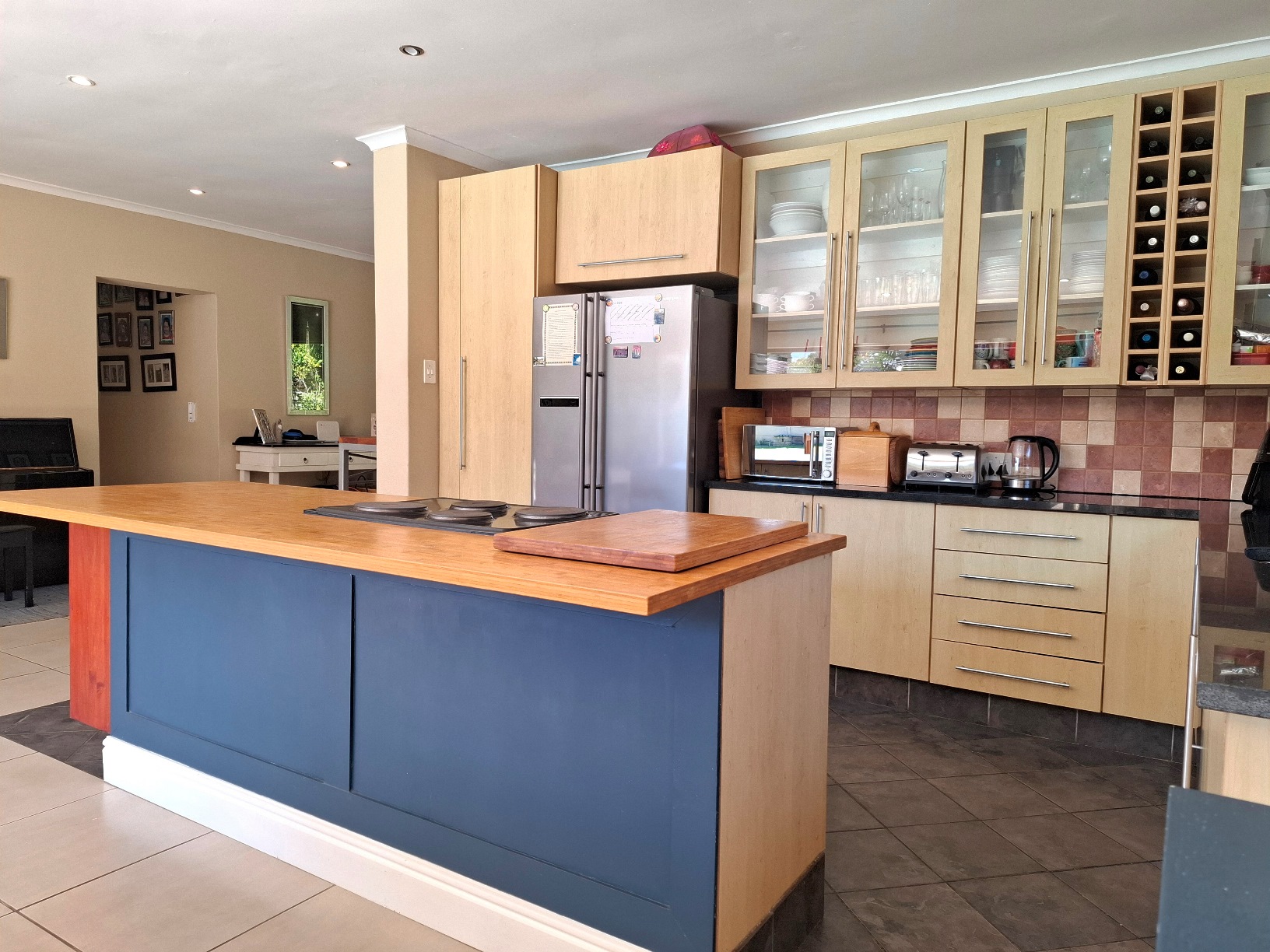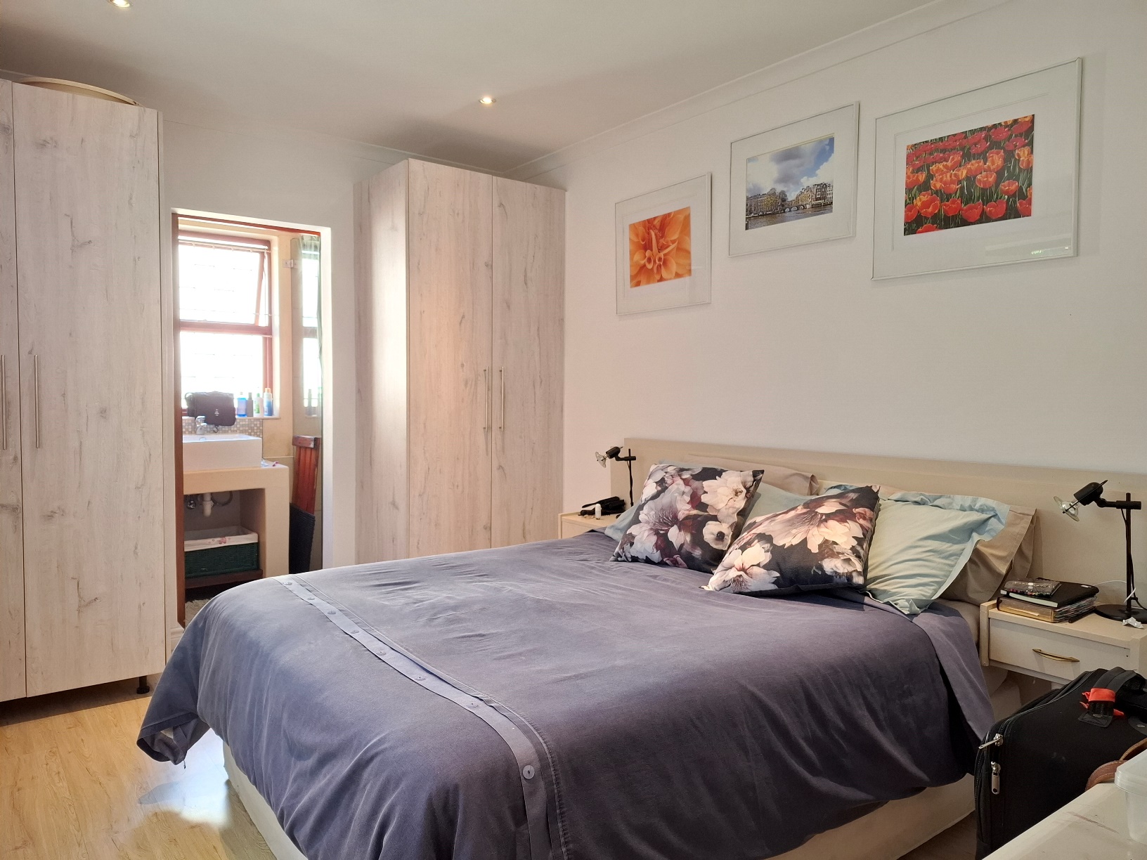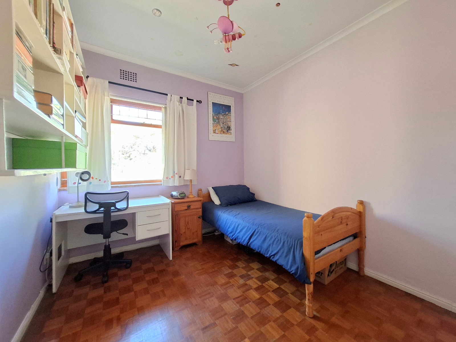 The house has expanded considerably over the 26 years that the current family has lived here, to now comprise of a formal lounge (with modern fireplace), a large open plan kitchen/dining/family room, 3 bedrooms and 2 bathrooms on the ground floor, and a main bedroom (ensuite) with pyjama lounge upstairs. All the bedrooms have built in cupboards and either wooden/tiled floors. The main bedroom and pyjama lounge enjoy spectacular views of the back of Table Mountain and the Constantiaberg range from a covered balcony.