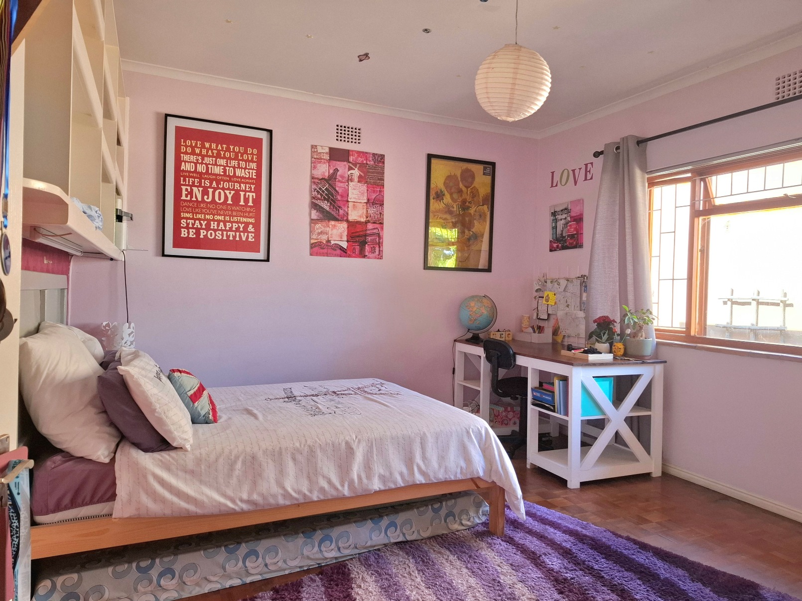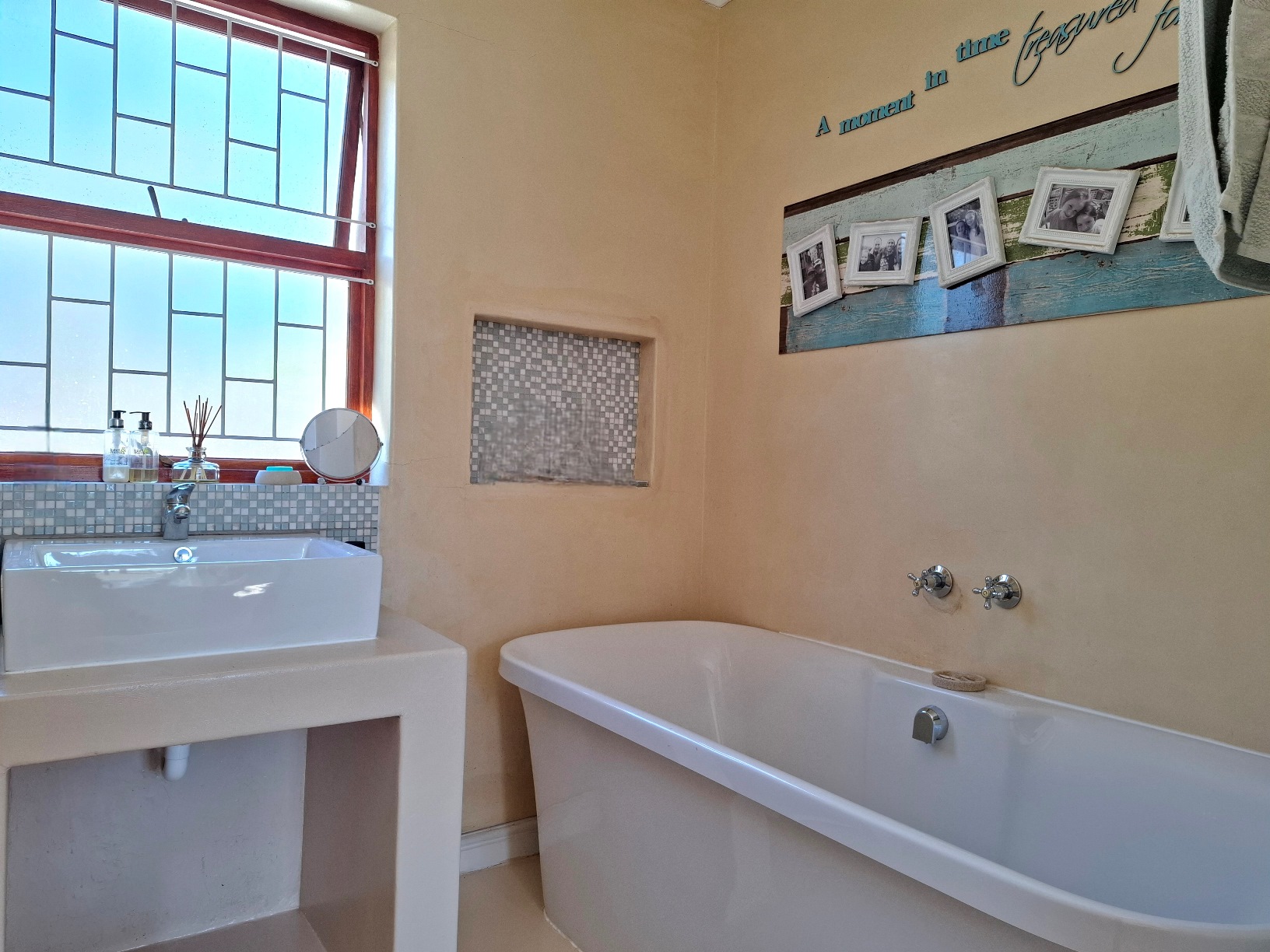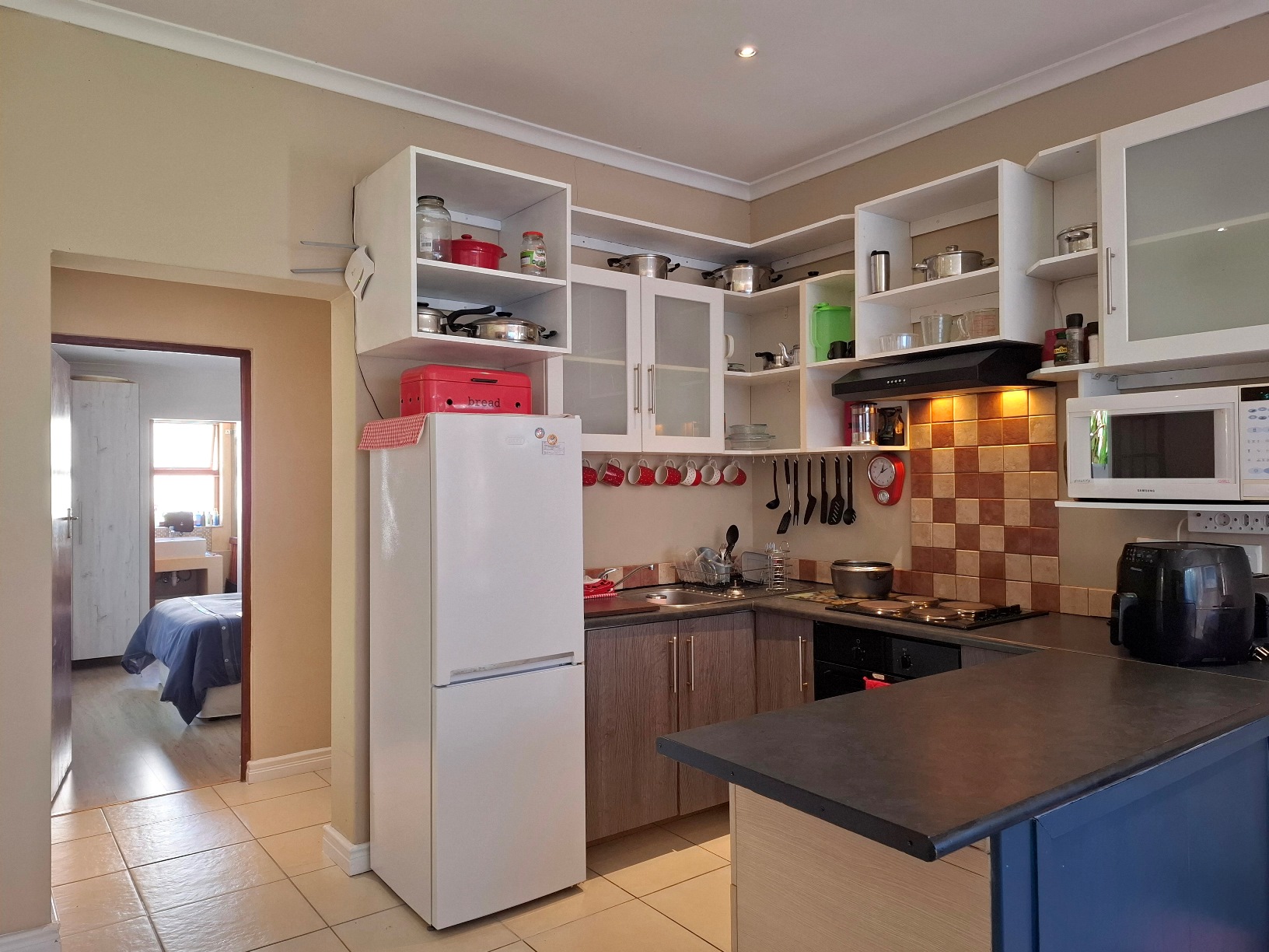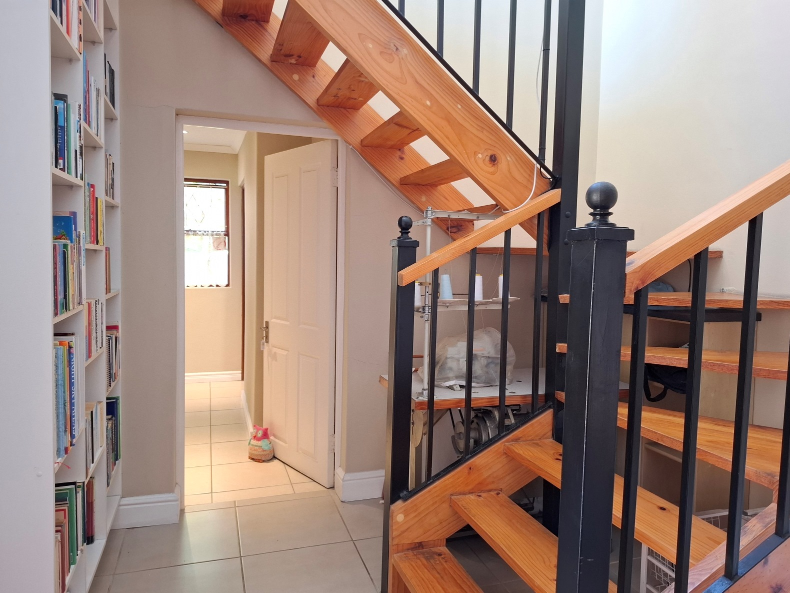 The house has expanded considerably over the 26 years that the current family has lived here, to now comprise of a formal lounge (with modern fireplace), a large open plan kitchen/dining/family room, 3 bedrooms and 2 bathrooms on the ground floor, and a main bedroom (ensuite) with pyjama lounge upstairs. All the bedrooms have built in cupboards and either wooden/tiled floors. The main bedroom and pyjama lounge enjoy spectacular views of the back of Table Mountain and the Constantiaberg range from a covered balcony.